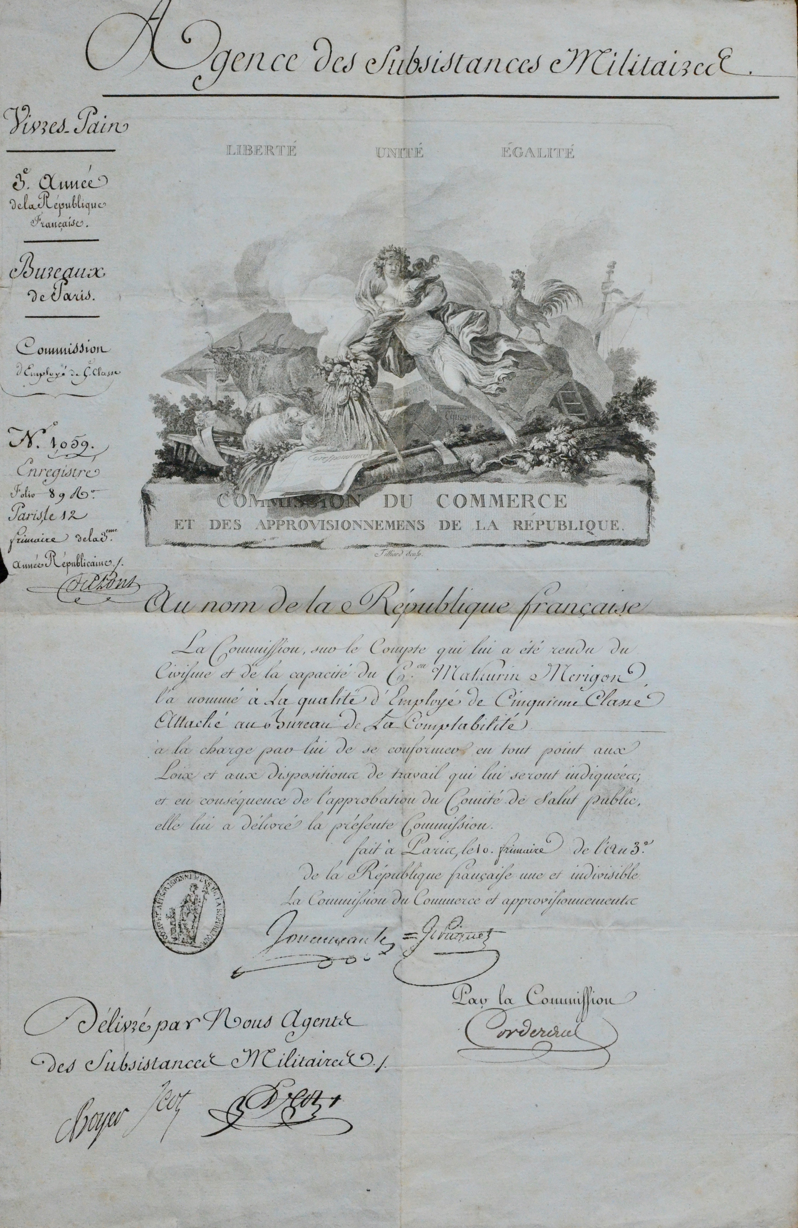 Grand document orné de la magnifique vignette emblématique de la "Commission du Commerce et des approvisionnements de la République - Agence des subsistances Militaires. Vivres -Pain", gravée par Jean-Baptiste Tilliard (1740-1813), figurant une allégorie de l'Agriculture (corne d'abondance, etc). [Boppe et Bonnet, planche n°31, page 17]