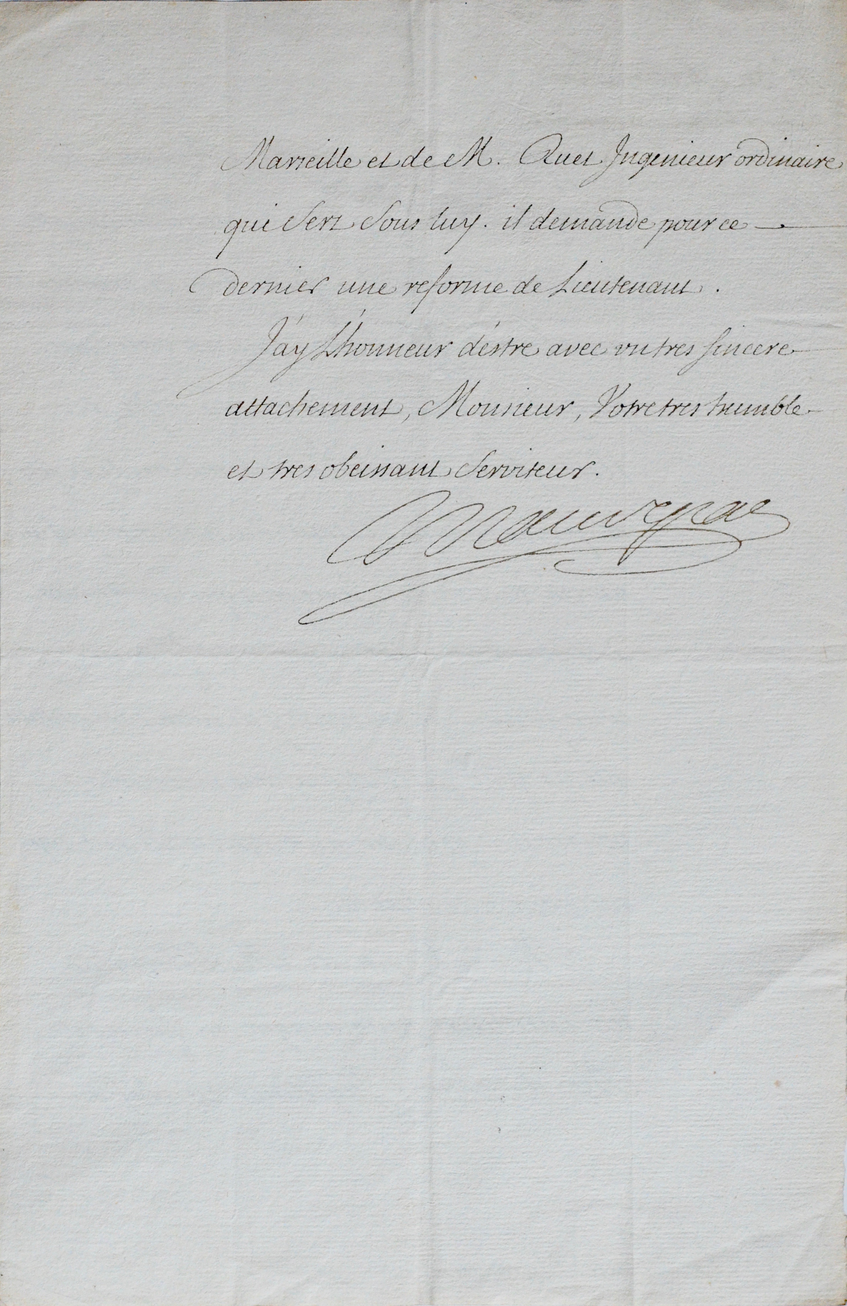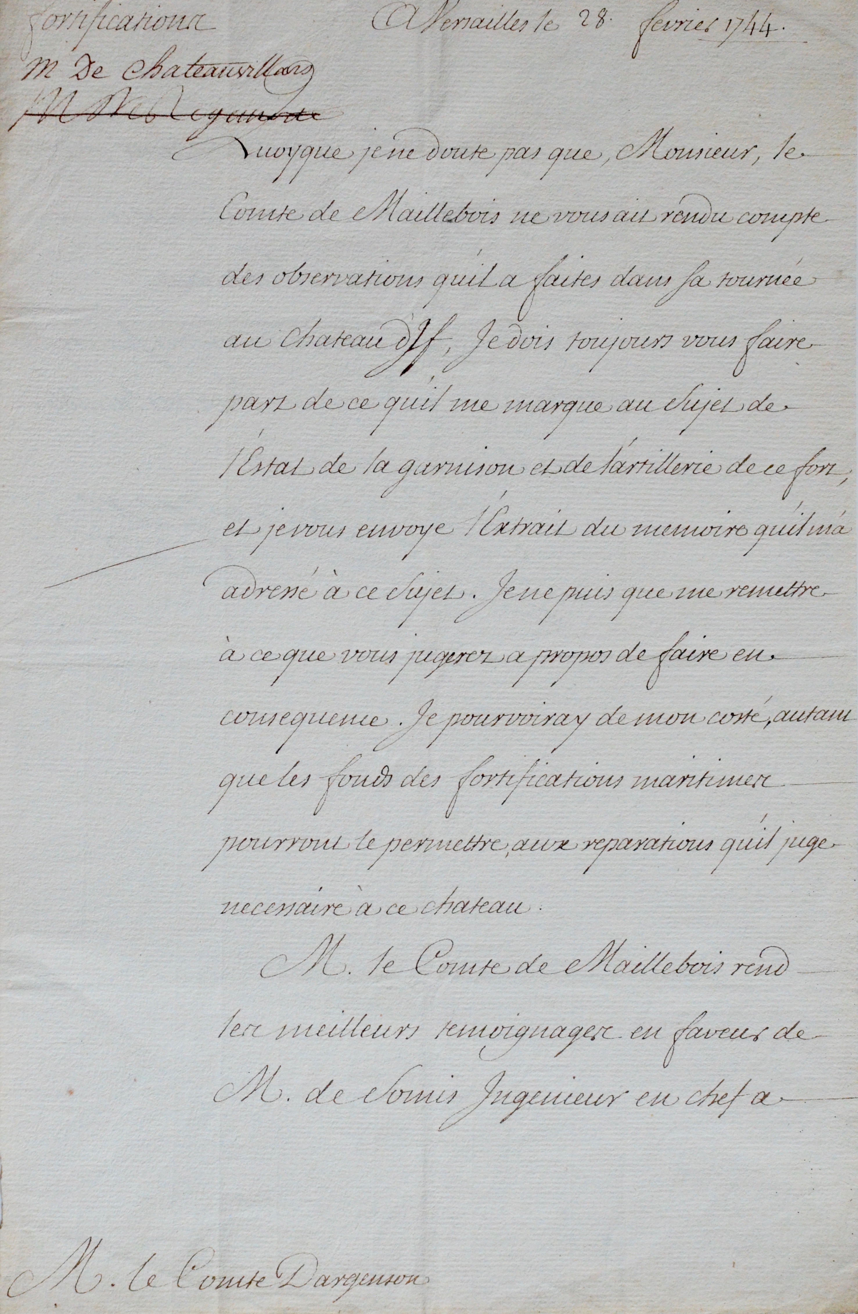 "Quoy que je ne doute pas que, Monsieur, le comte de Maillebois ne vous ait rendu compte des observations qu'il a faites dans sa tournée au Château d'If, je dois toujours vous faire part de ce qu'il me marque au sujet de l'état de la garnison et de l'artillerie de ce fort [...]". Il s'en remet aux décisions de d'Argenson. "Je pourvoiray de mon costé, autant que les fonds des fortifications maritimes pourront le permettre, aux réparations qu'il juge nécessaire à ce château [...]". Le comte de Maillebois recommande l'ingénieur M. de Somis [Joseph Ignace Somis, ingénieur en Chef du Port de Marseille] et M. Ruet ingénieur ordinaire à ses ordres.