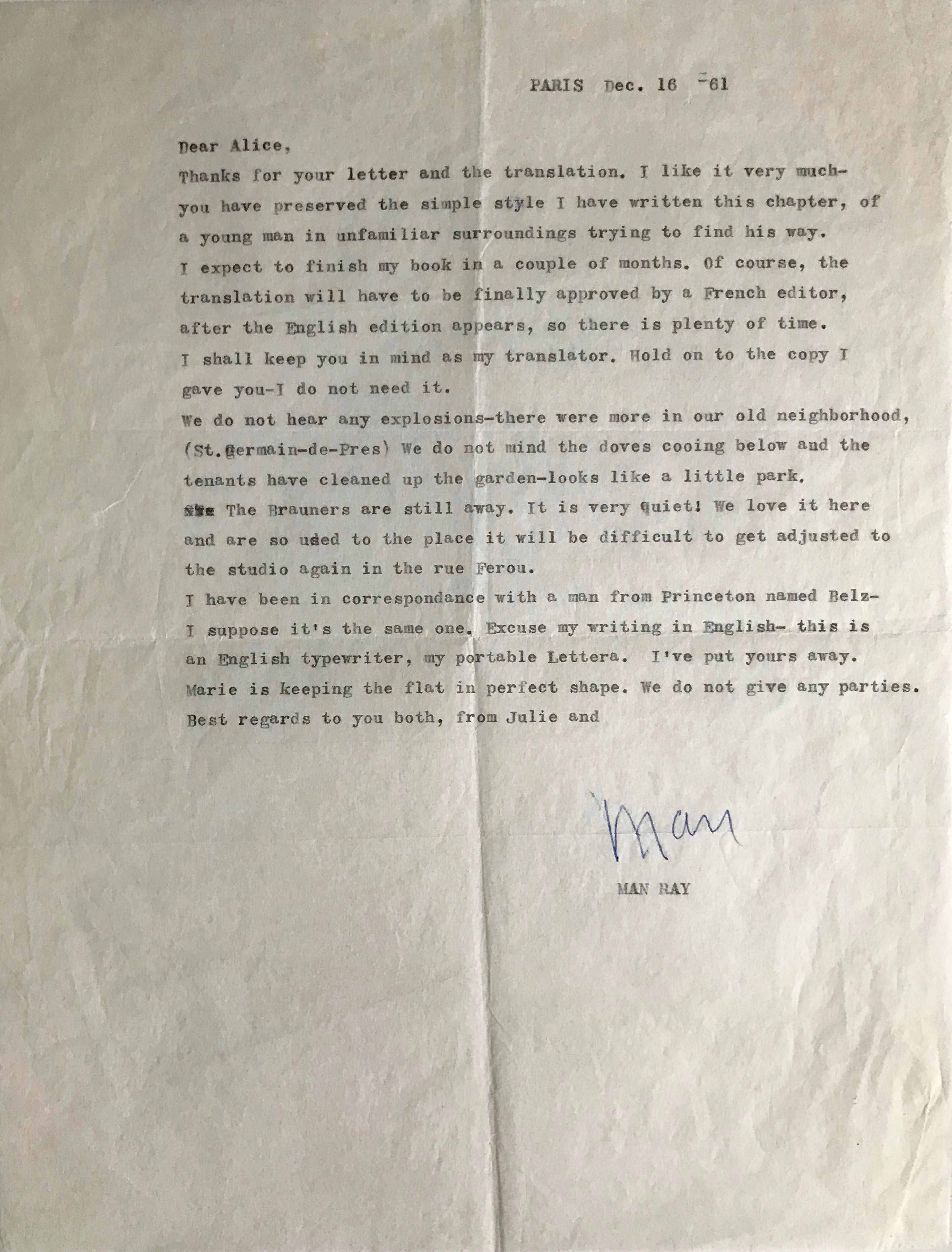 À propos de leur appartement : "We do not hear any explosions-there were more in our old neighborhood, 'St. Germain-des-Pres). We do not mind the doves cooing below and the tenants have cleaned up the garden-looks like a little park. The Brauners [nom de jeune fille de sa femme Juliet] are still away. It is very quiet ! We love it here and are so used to the place it will be difficult to get adjusted to the studio again in the rue Ferou". Man Ray évoque un correspondant à Princeton, nommé Belz.