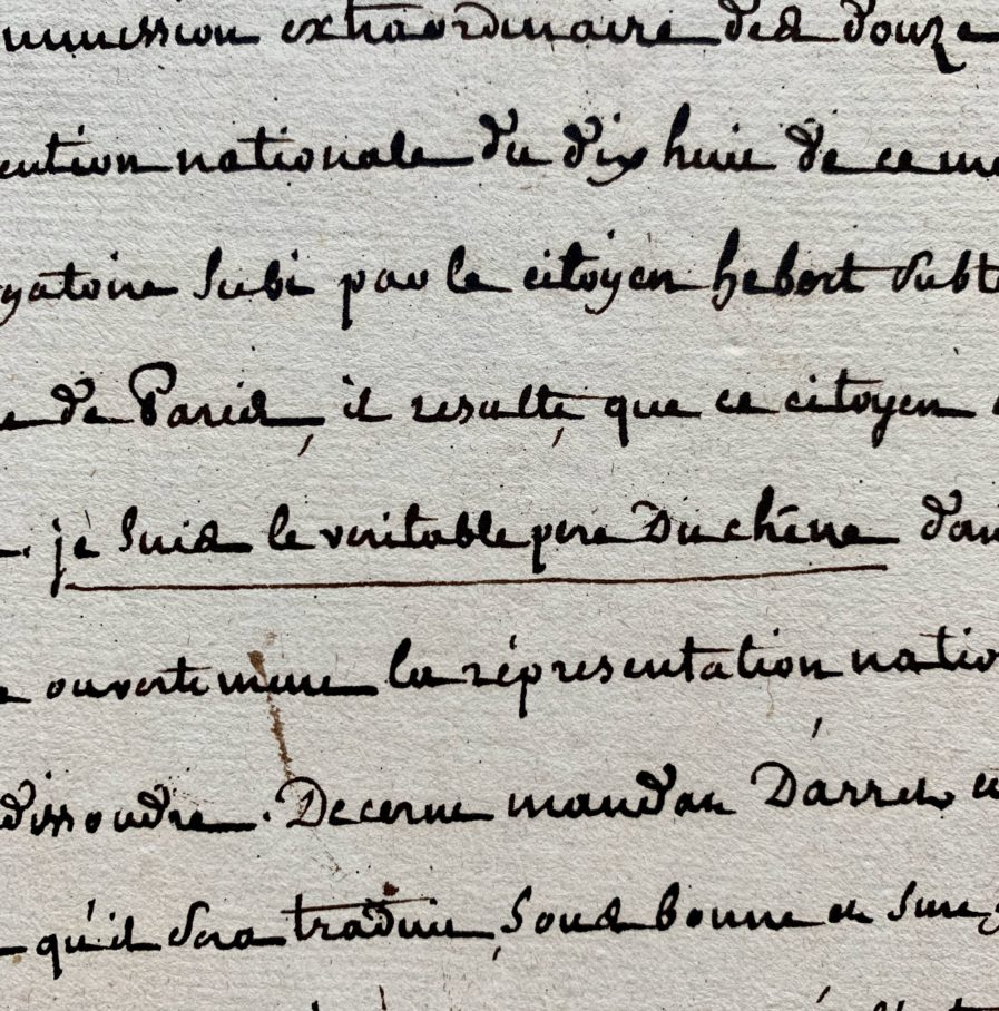 "La commission extraordinaire des douze établie par le décret de la convention nationale du dix huit de ce mois, considérant que de l'interrogatoire subi par le citoyen Hébert substitut du procureur de la Commune de Paris, il résulte que ce citoyen est l'auteur d'une feuille intitulée Je suis le véritable père Duchêne dont six numéros de laquelle par lui reconnue, il attaque ouvertement la représentation nationale, cherche à l'avilir et à la dissoudre, décerne mandat d'arrêt contre lui, en conséquence ordonne qu'il sera traduit, sous bonne et sûre garde à l'abbaye pour y rester jusqu'à ce qu'autrement il ait été statué par la convention nationale [...]".
