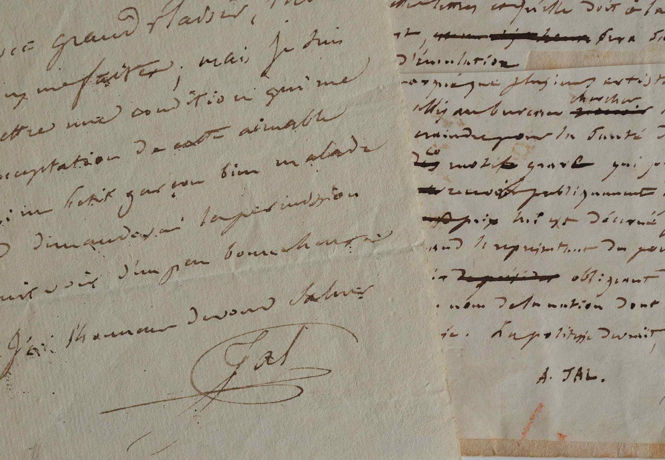 Auguste Jal (Lyon, 1795/1873)Manuscrit autographe signé du critique d'art Auguste Jal sur la distribution des récompenses au Salon de 1849 : «Cette fête des arts avait attiré la foule ; la table était loin cependant d'être pleine. Si quelque froideur s'est mêlée à la joie qu'éprouvaient les artistes récompensés et leurs admirateurs, il faut l'attribuer à la disposition obligée de cette galerie, qui, longue et étroite, disperse les applaudissements au lieu de les concentrer. Le Salon carré du Louvre, la Salle des Maréchaux ou tout autre local de la forme de ces deux grandes pièces conviendra toujours mieux à une solennité du genre de celle à laquelle nous venons d'assister, que l'Orangerie.» Étaient bien sûr présents le Président de la République, le directeur des Beaux-Arts et les membres du Jury du Salon. Ainsi, Jules Dupré (1811/1889), Charles-Louis Müller (1815/1892) ou encore Théodore Rousseau (1812/1867) reçoivent un prix. C'est la première année que le Salon est organisé en dehors du Louvre, afin de redonner au lieu sa vocation purement muséale ; désormais, l'événement semblera moins prestigieux. On joint une autre L.A.S. d'Auguste Jal, à Hortensius de Saint-Albin (1805/1878), 1 p. in-16.