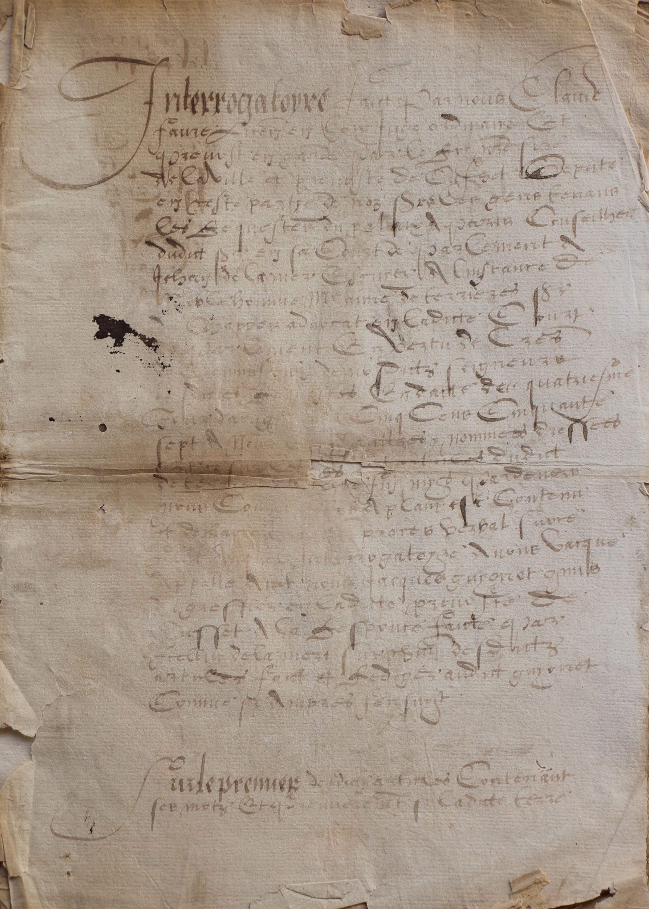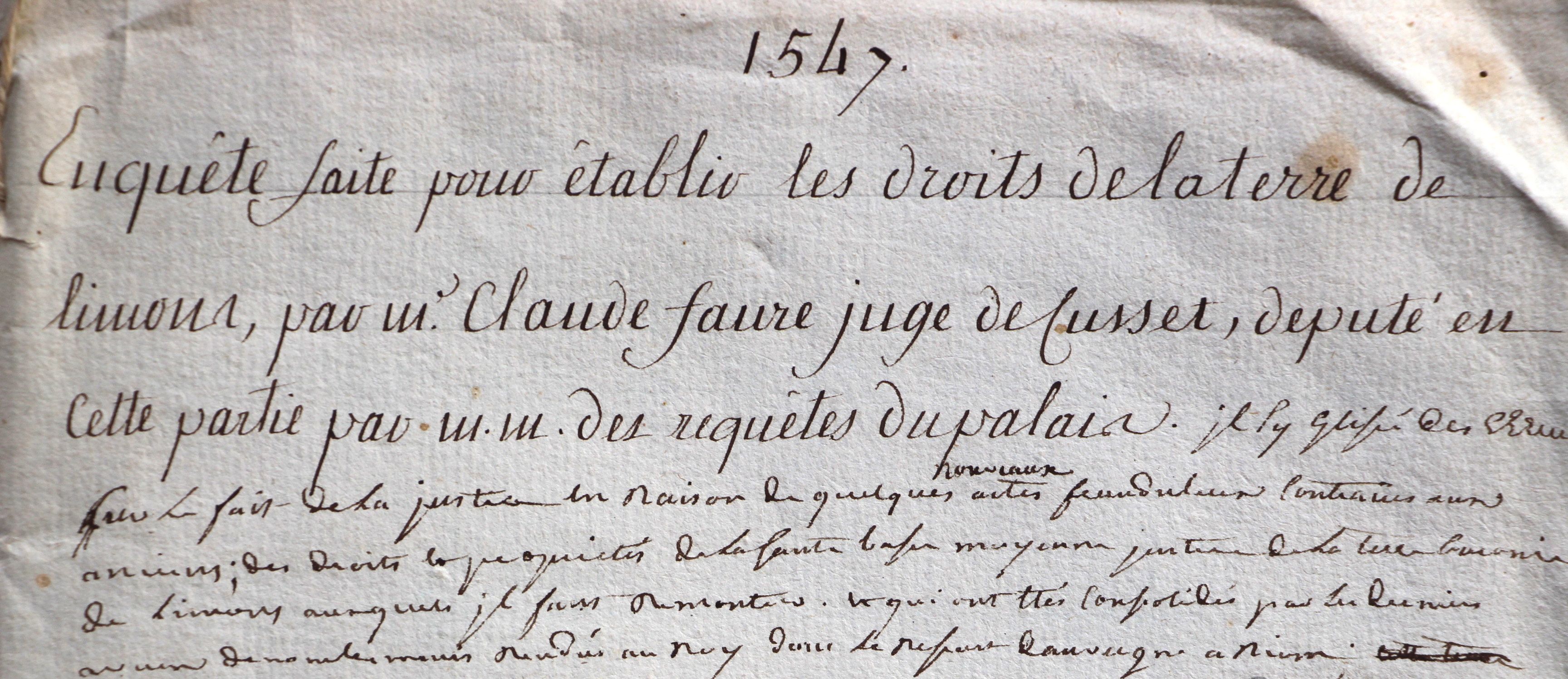 Enquête faite en 1547 pour établir les droits de la terre de Limons [aujourd'hui Puy-de-Dôme], par Messire Claude Faure juge de Cusset, député en cette partie par MM. des requêtes du Palais. Une note ancienne indique : « Il s'y est glissé des erreurs sur le fait de la justice en raison de quelques nouveaux actes frauduleux contraires aux anciens ; des droits de propriété de la haute basse moyenne justice de la terre baronnie de Limons auxquels il faut remonter et qui ont été consolidés par les derniers aveux dénombrements rendus au Roy dans le ressort d'Auvergne à Riom ».