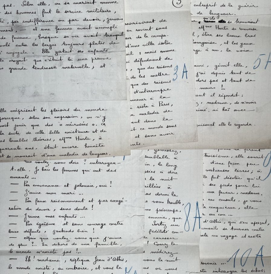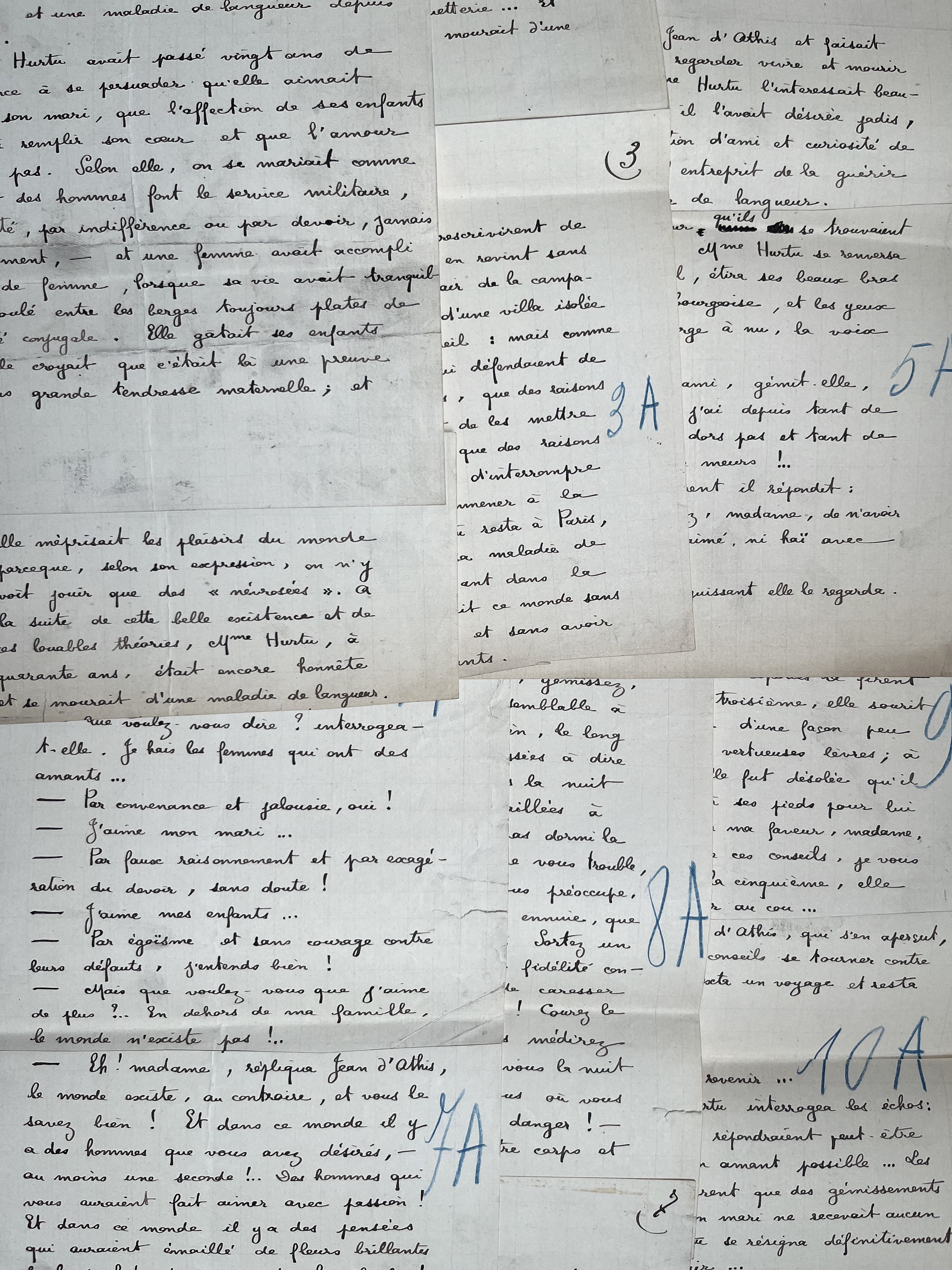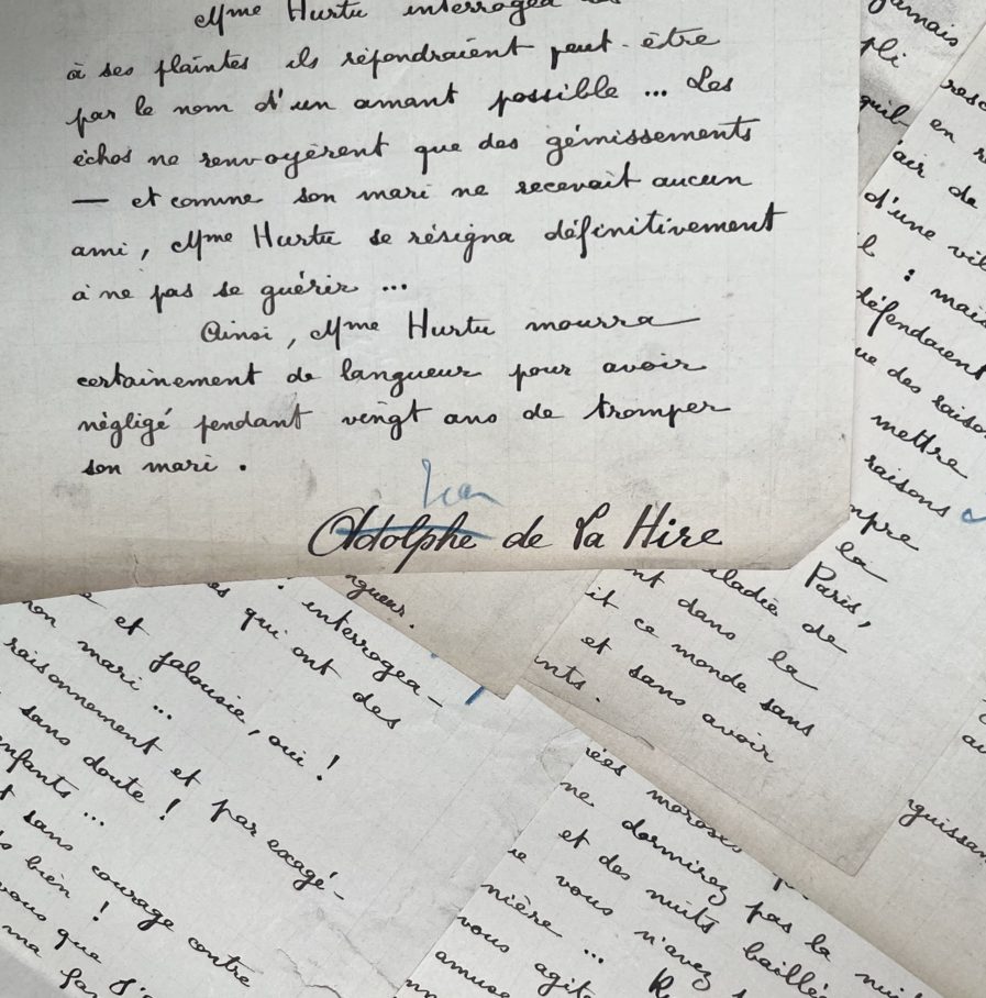 « Mme Hurtu avait quarante ans depuis huit jours et une maladie de langueur depuis un mois. Mme Hurtin avait passé vingt ans de son existence à se persuader qu'elle aimait beaucoup son mari, que l'affection de ses enfants suffisait à remplir son coeur et que l'amour n'existait pas […] ». Signature « Adolphe de La Hire » avec prénom biffé et remplacé par « Jean ».