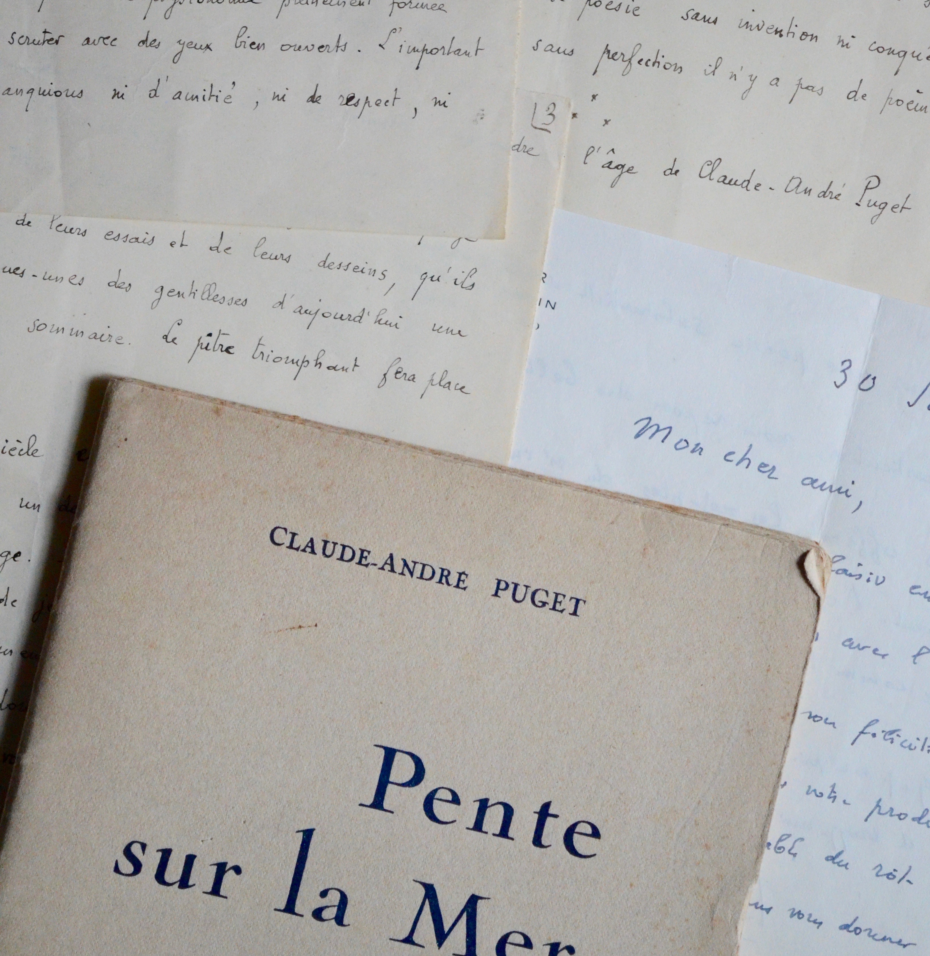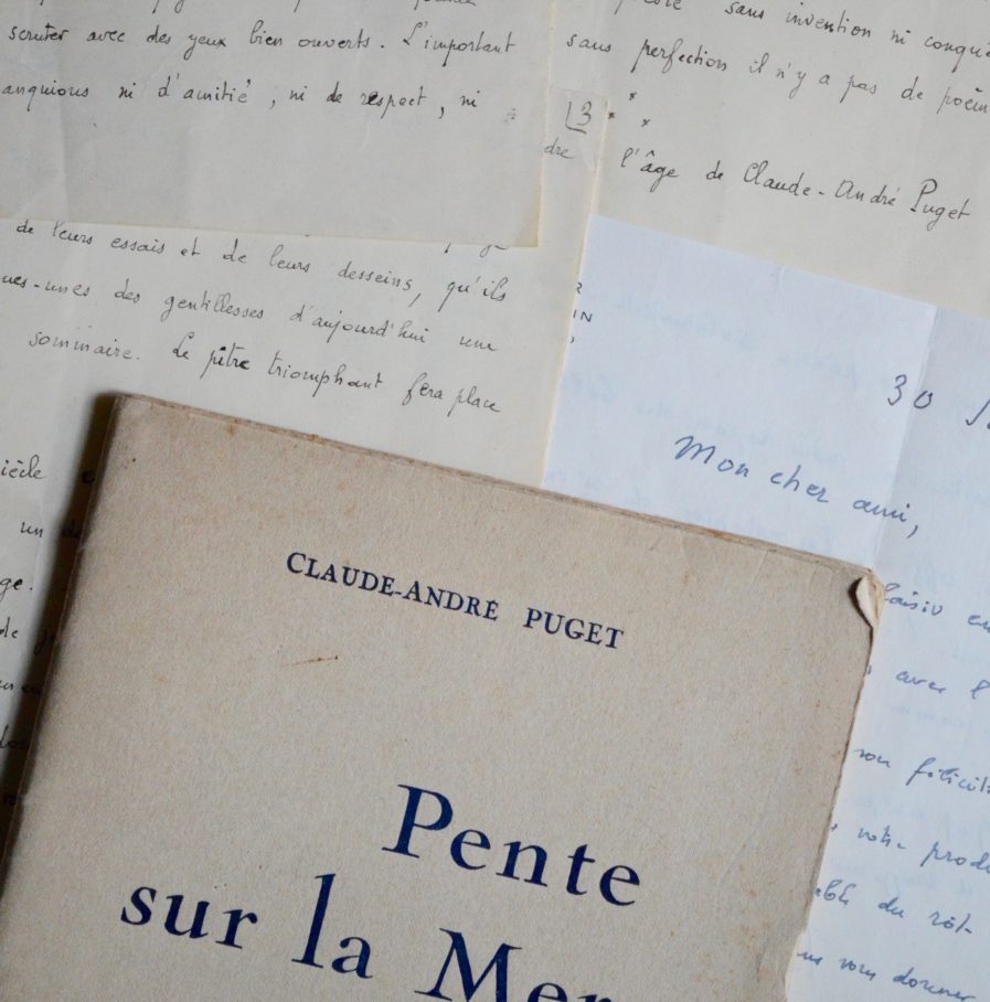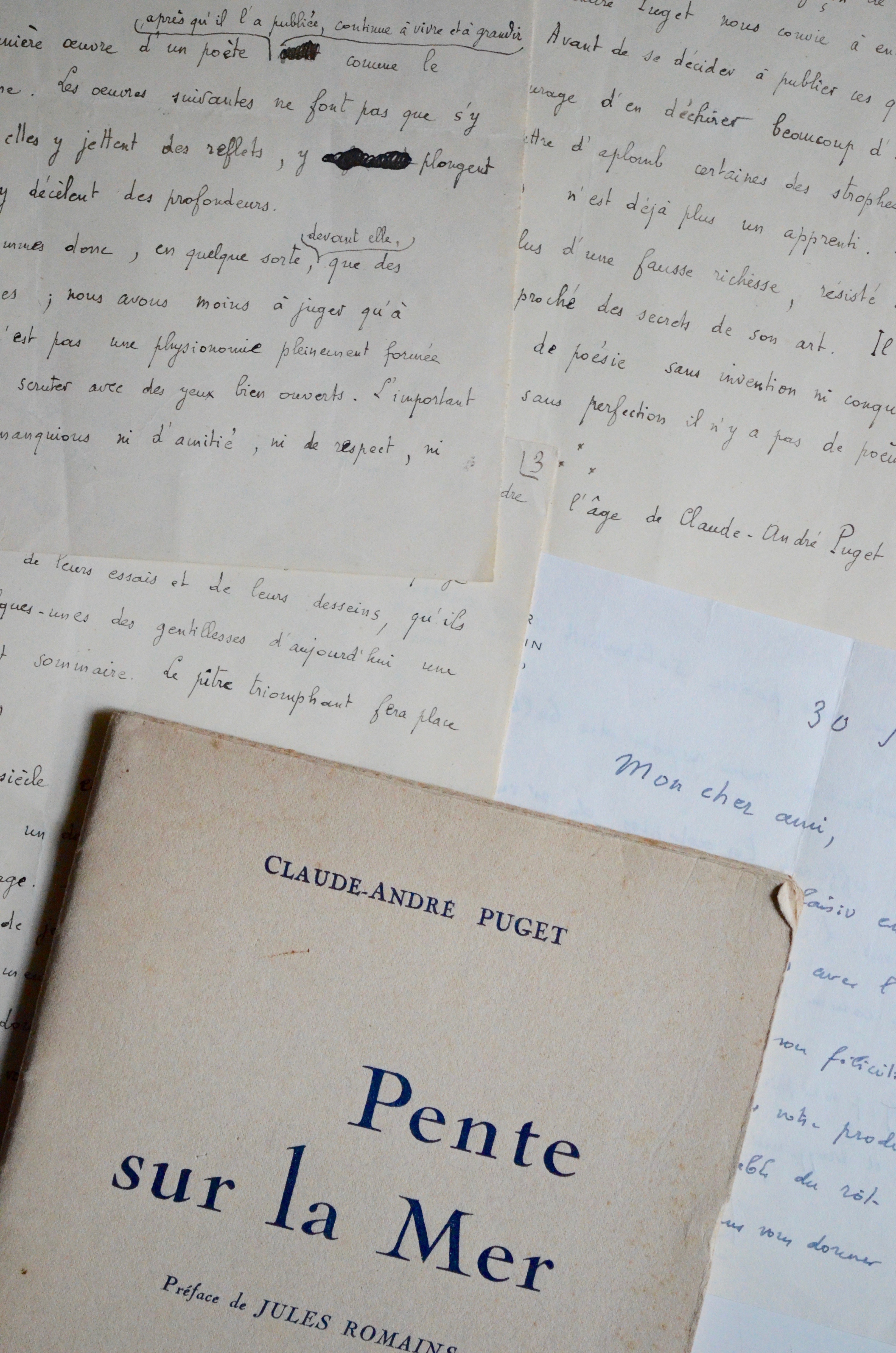 "Claude-André Puget, poète de vingt ans, publie se première plaquette. Je souhaite que cette phrase, toute modeste aujourd'hui, prenne dans l'avenir quelques résonances solennelles. La première oeuvre d'un poète, après qu'il l'a publiée, continue à vivre et à grandir comme le poète lui-même. Les oeuvres suivantes ne font pas que s'y ajouter ; elles y jettent des réglets, y plongent des lumières, y décèlent des profondeurs. Nous sommes donc, en quelque sorte, devant elle, des lecteurs provisoires ; nous avons moins a juger qu'à pressentir [...]. L’important est que nous ne manquions ni d’amitié, ni de respect, ni peut-être même d’une sévère sollicitude pour un visage presque tout entier futur. Cela ressemble moins à une réflexion critique qu’à une songerie ; et l'on ne songe commodément que si l'on ferme à demi les yeux [...]. Il a déjà pesé et rejeté plus d’une fausse richesse, résisté à maintes tentations, approché des secrets de son art. Il sait qu’il n’y a pas de poésie sans invention ni conquête. Mais il sait aussi que sans perfection il n’y a pas de poème". Romains fonde de grands espoirs sur les jeunes poètes : "Le XXème siècle est pareil à une maison commencée, dont un désastre a chassé les maçons et disloqué l’échafaudage. Des camelots se sont installés […]. Mais voici les maçons qui reviennent".