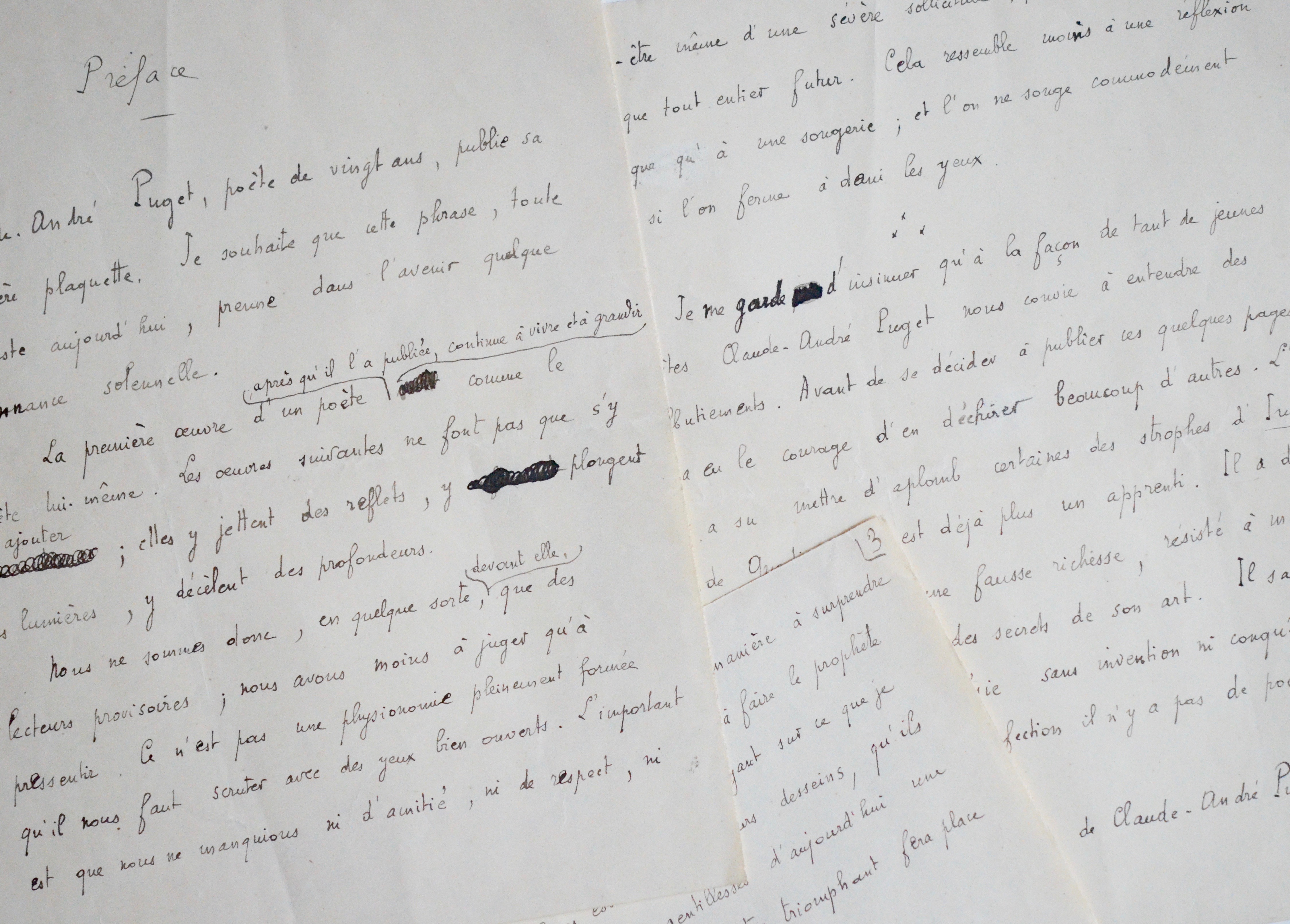Manuscrit de la préface de Jules Romains pour le recueil de poésie Pente sur la Mer, de Puget