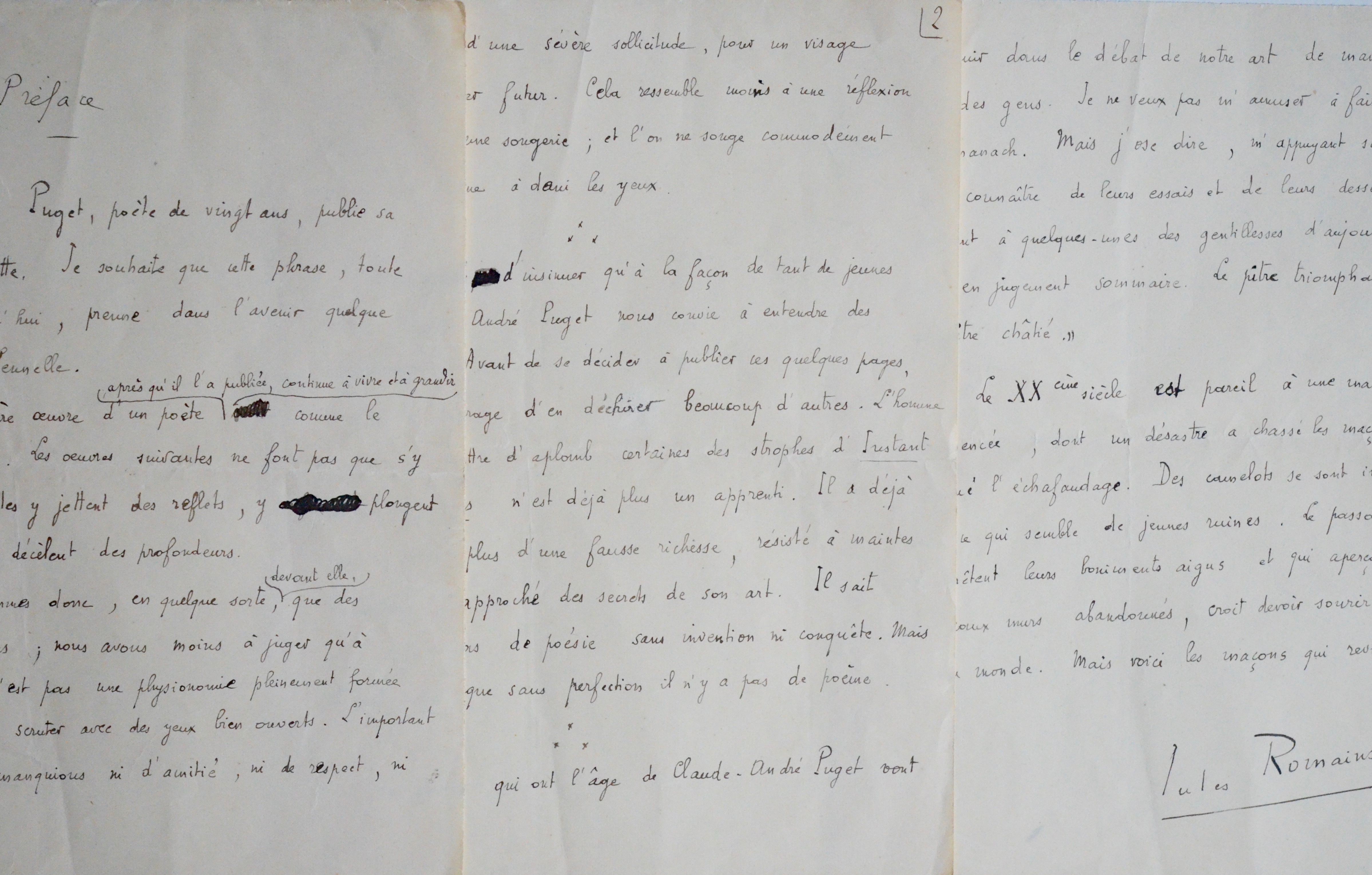 Jules Romains (Saint-Julien-Chapteuil, 1885/1972)Manuscrit autographe signé de Jules Romains. Il s'agit du brouillon de la préface pour le recueil de poèmes de Claude-André Puget : Pente sur la Mer [Le Mouton blanc, 1923].