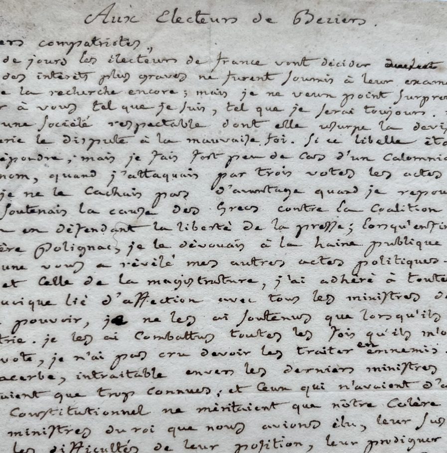 Dense manuscrit autographe signé de Jean-Pons-Guillaume Viennet intitulé «Aux électeurs de Béziers». Il contient la profession de foi de Viennet pour sa 3e élection de député de Béziers.
