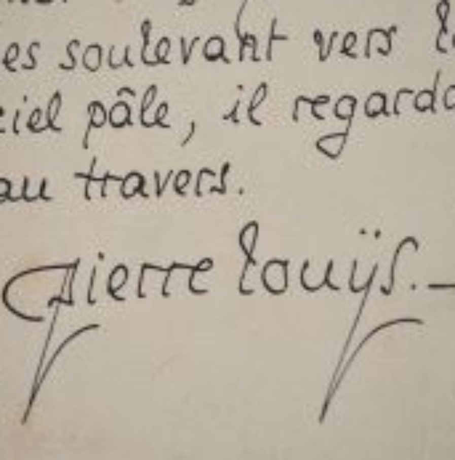 Manuscrit du dernier paragraphe du Tombeau des Naïades, texte des Chansons de Bilitis. « Avec le fer de sa houe il cassa la glace de la source où jadis riaient les naïades. Il prenait de grands morceaux froids, et, les soulevant vers le ciel pâle, il regardait au travers. »