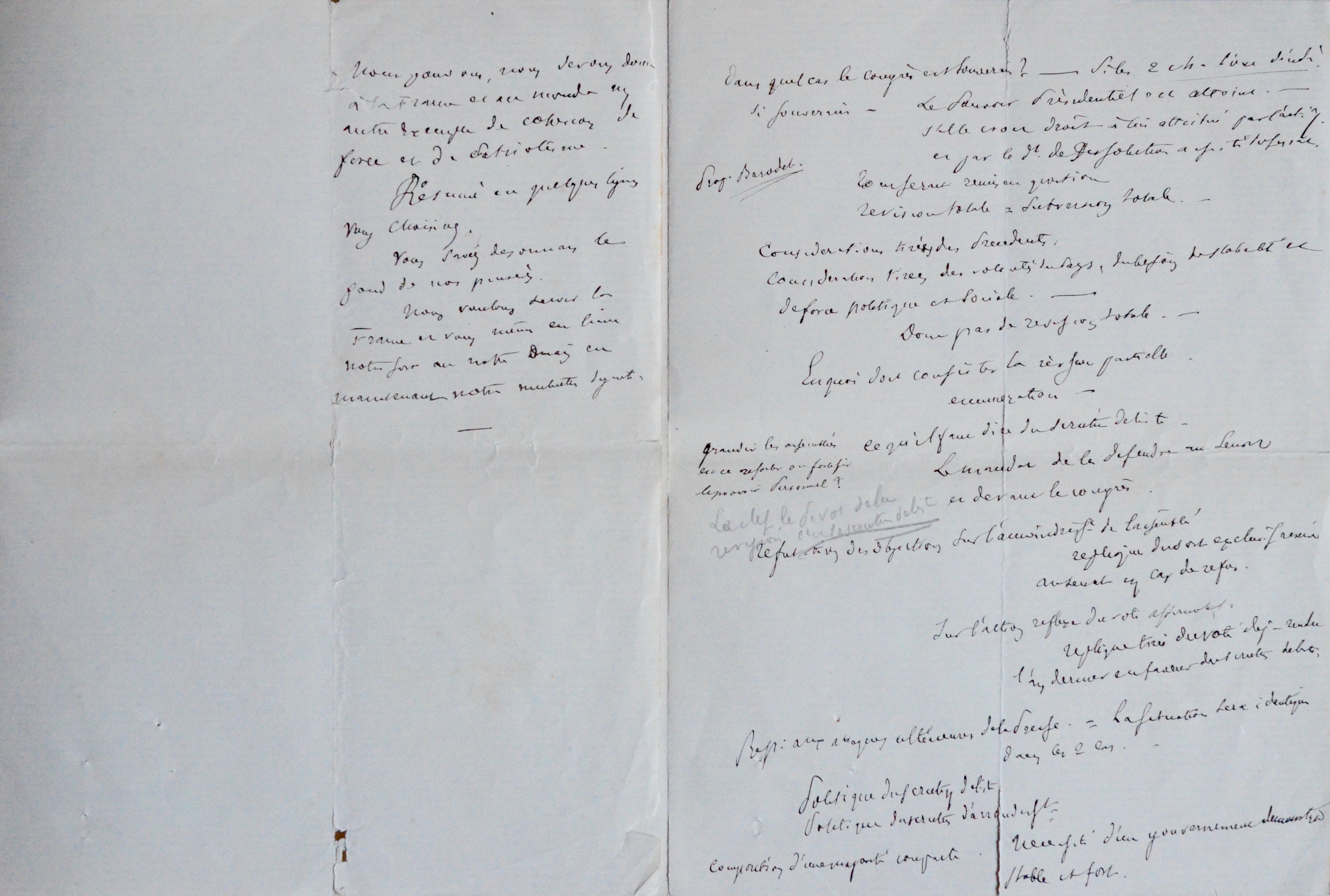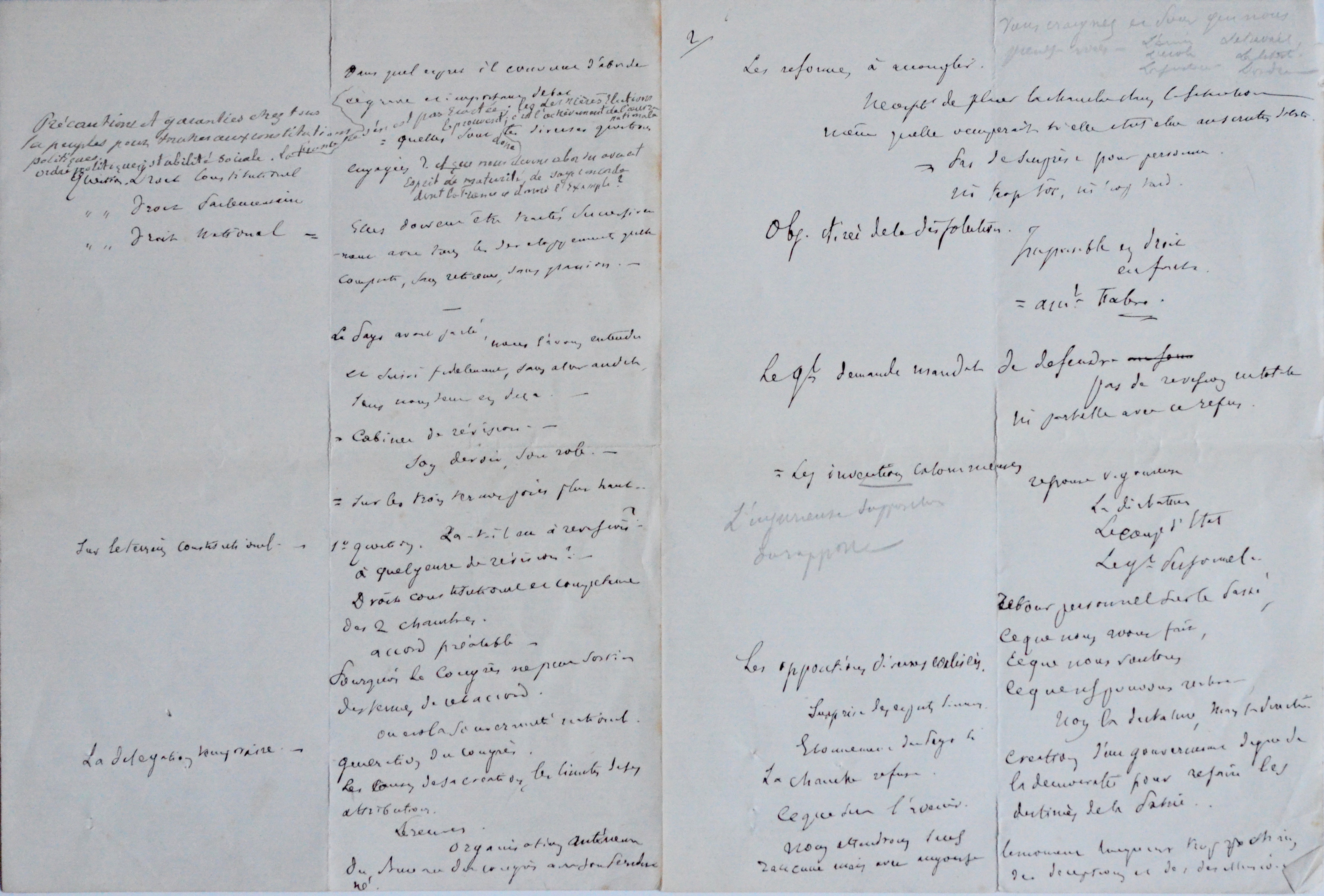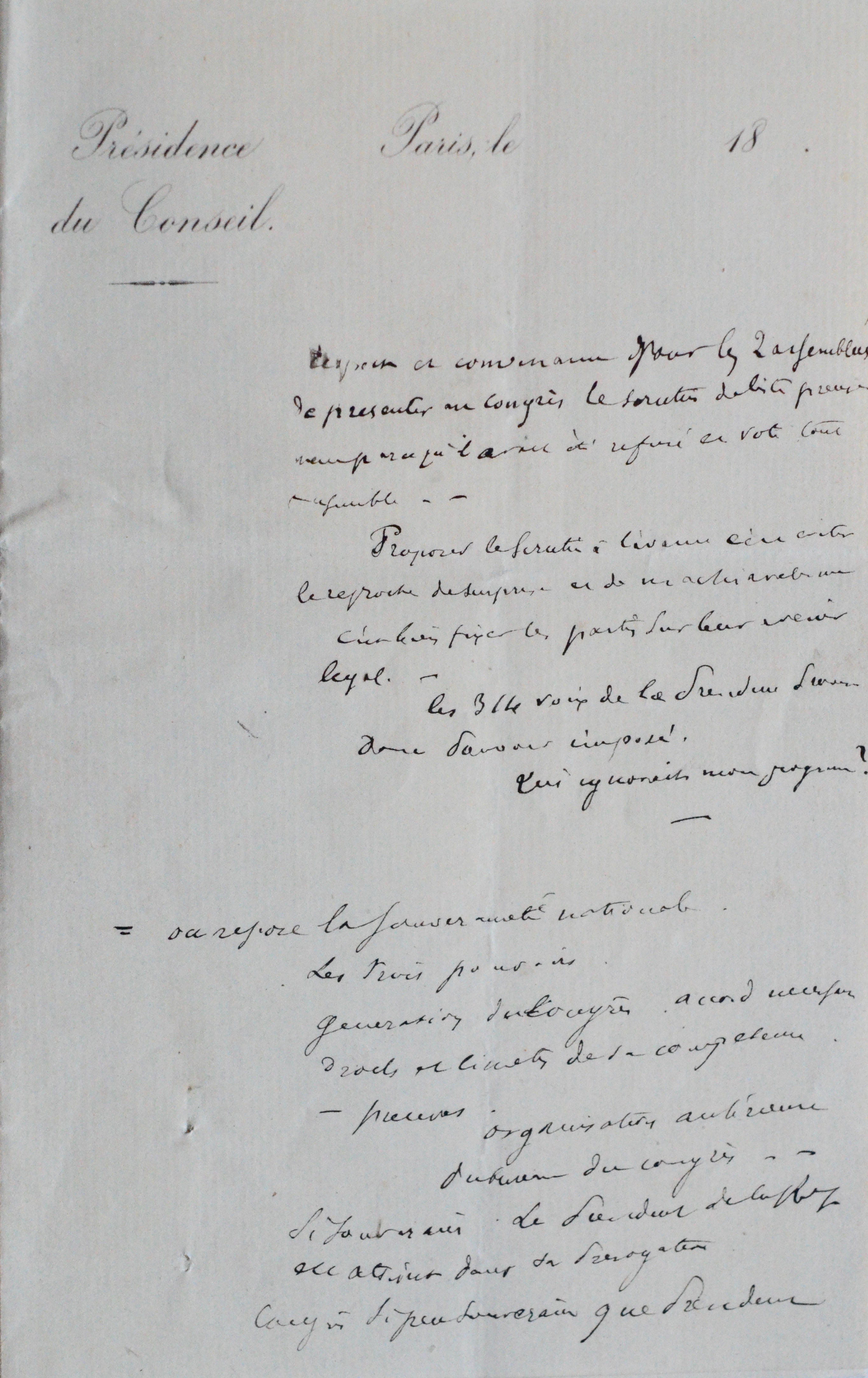 « Les 314 voix de la Présidence seront donc Pouvoir imposé. Qui ignorait mon programme ? [...] Où repose la souveraineté nationale. Les trois pouvoirs. Génération des congrès. Accord nécessaire. Droits et limites de sa compétence. [...] Si souverain le Président de la Rép. est atteint dans sa prérogative. Congrès si peu souverain que Président République peut par la dissolution d’une Chambre mettre fin à son existence et consulter le Pays. Tout serait remis en question. La constituante c’est l’Inconnu [...] Le Pays avait parlé, nous l’avons entendu et suivi fidèlement, sans aller au-delà, sans nous tenir en deçà. – Cabinet de révision. – Son devoir, son rôle [...] Les réformes à accomplir », etc.