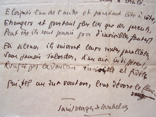 Manuscrit du poème "Les Exilés" signé Saint-Georges de Bouhélier. 4 quatrains. «Comme des cavaliers séparés par un fleuve / s'en vont par des chemins de bocage isolés / Il est des malheureux, il est des âmes veuves / qui poursuivent sans fin leur songe d'exilés [...]».