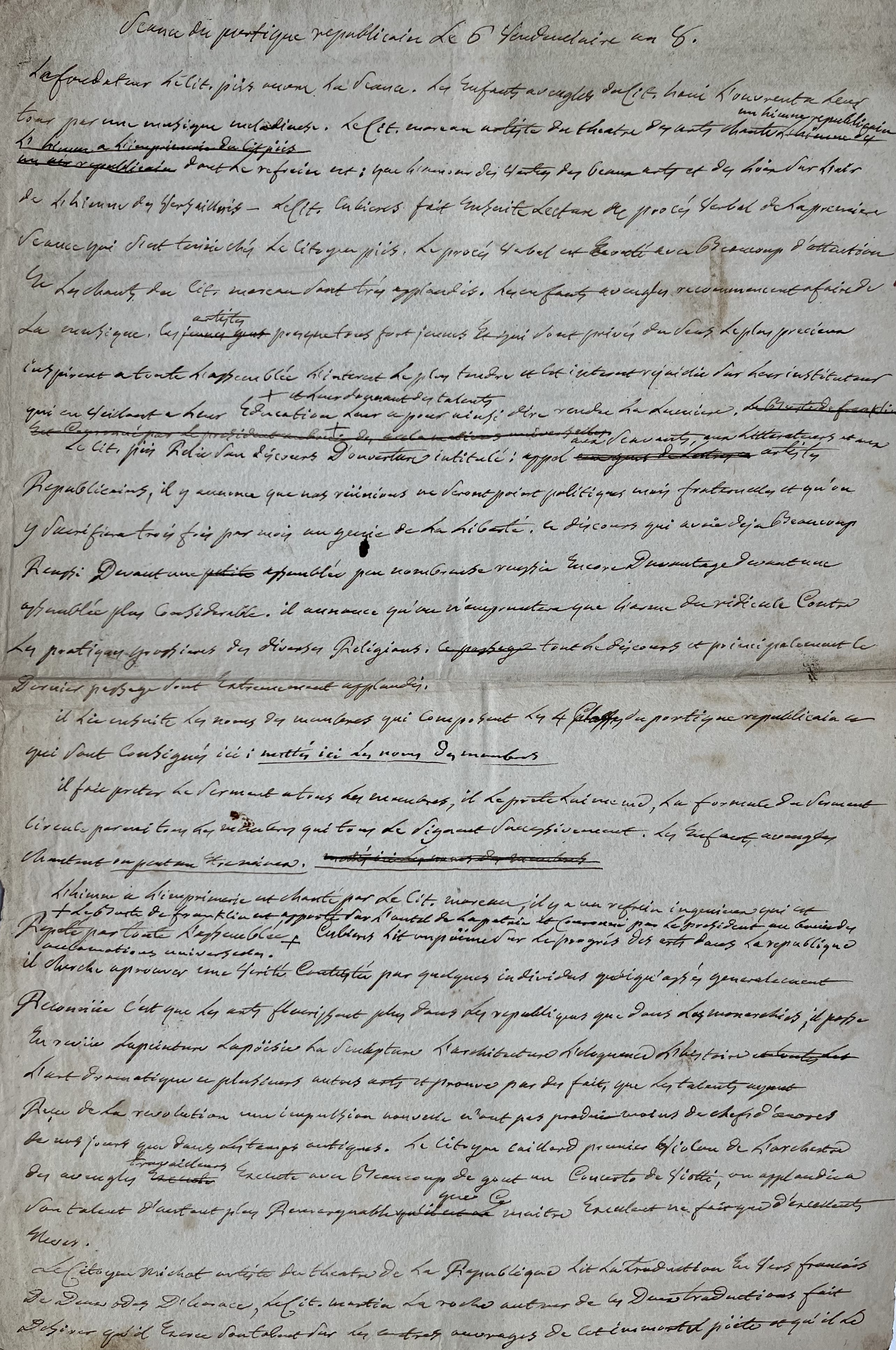 «Le fondateur le cit. Piis ouvra la séance. Les enfants aveugles du cit. Haui [Valentin Hauÿ] l'ouvrent à leur tour par une musique mélodieuse. Le cit. Moreau artiste du théâtre des arts chante un hymne républicain dont le refrain est: que l'union des vertus des beaux-arts et des loix sur l'air de l'hymne des Versaillais […]. Le citoyen Piis lit ensuite les noms des membres qui composent les 4 classes du portique républicain […]. Il fait prêter le serment à tous les membres, il le prête lui-même, la formule du serment circule parmi tous les membres qui tous le signent successivement. Les enfants aveugles chantent On peut n'être mieux […]. Le citoyen Michot artiste du Théâtre de la République lit la traduction en vers français de deux odes d'Horace […]. Le citoyen Tobie lit un discours contre le fanatisme, il y fait l'éloge de la bonne morale et surtout de la tolérance, il y prêche l'amour des loix […]. La séance a été terminée par l'hymne à la Concorde, paroles du citoyen Varlier musique du citoyen Charpentier […]». Ratures.