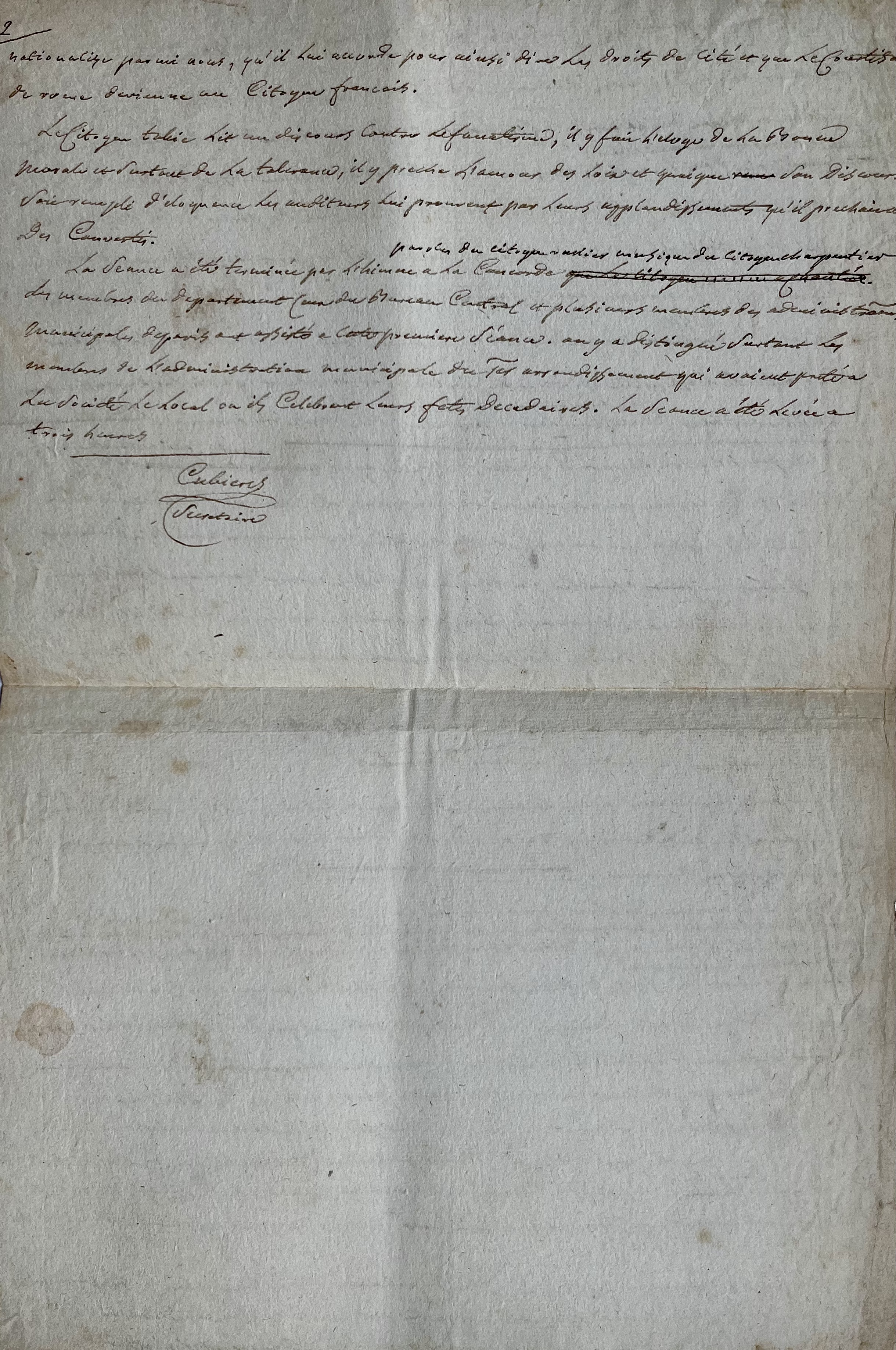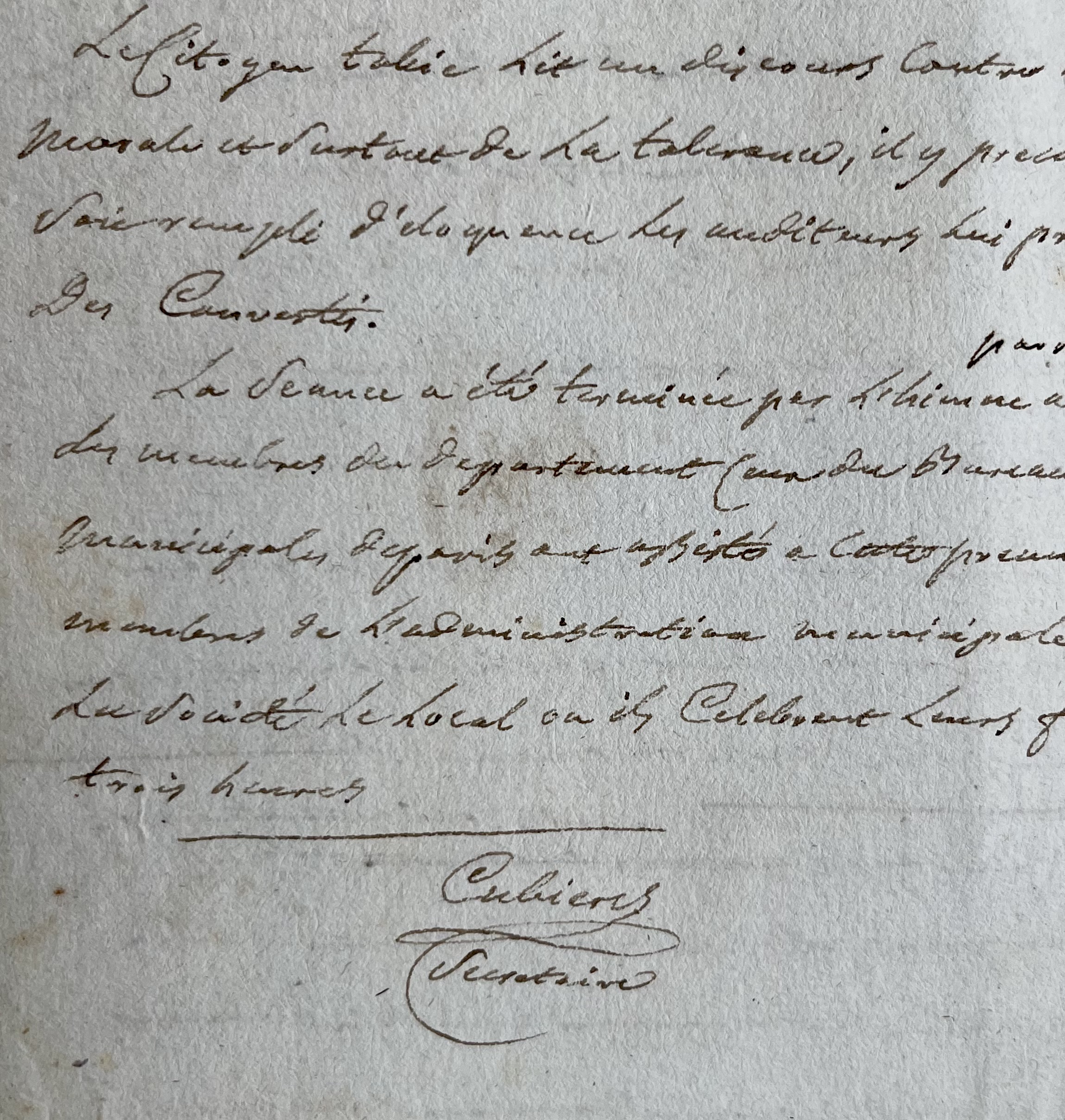Manuscrit du compte-rendu de la séance inaugurale de la Société du Portique républicain, par Michel de Cubières