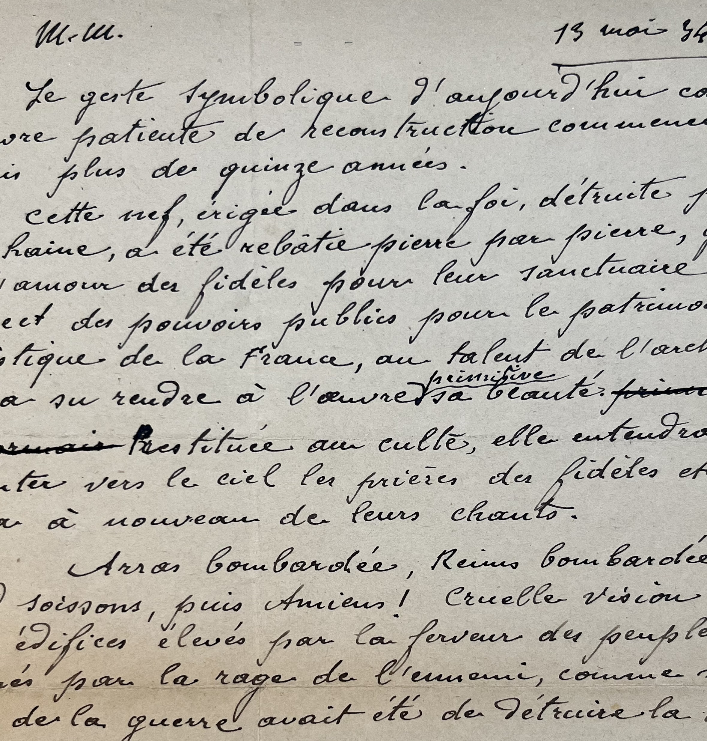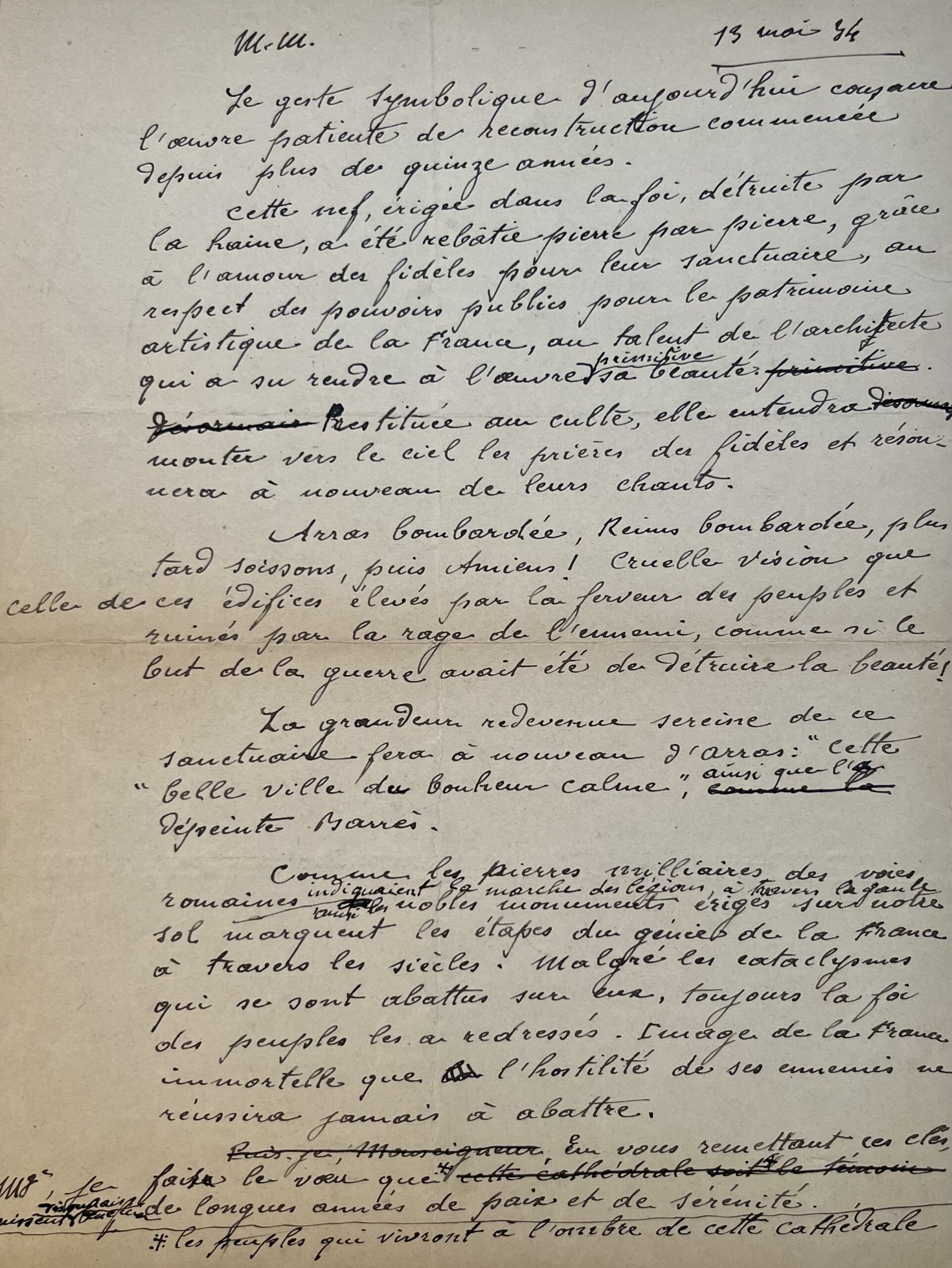 Beau texte sur la reconstruction de la cathédrale d’Arras, très endommagée durant la Première Guerre mondiale et qui sera rendue au culte le lendemain, 14 mai 1934 : "M.M. Le geste symbolique d’aujourd’hui consacre l’œuvre patiente de reconstruction commencée depuis plus de quinze années. Cette nef, érigée dans la foi, détruite par la haine, a été rebâtie pierre par pierre, grâce à l'amour des fidèles pour leur sanctuaire, au respect des pouvoirs publics pour le patrimoine artistique de la France, au talent de l'architecte [Pierre Paquet] qui a su rendre à l’œuvre primitive sa beauté. Restituée au culte, elle entendra monter vers le ciel les prières des fidèles et résonnera à nouveau de leurs chants.