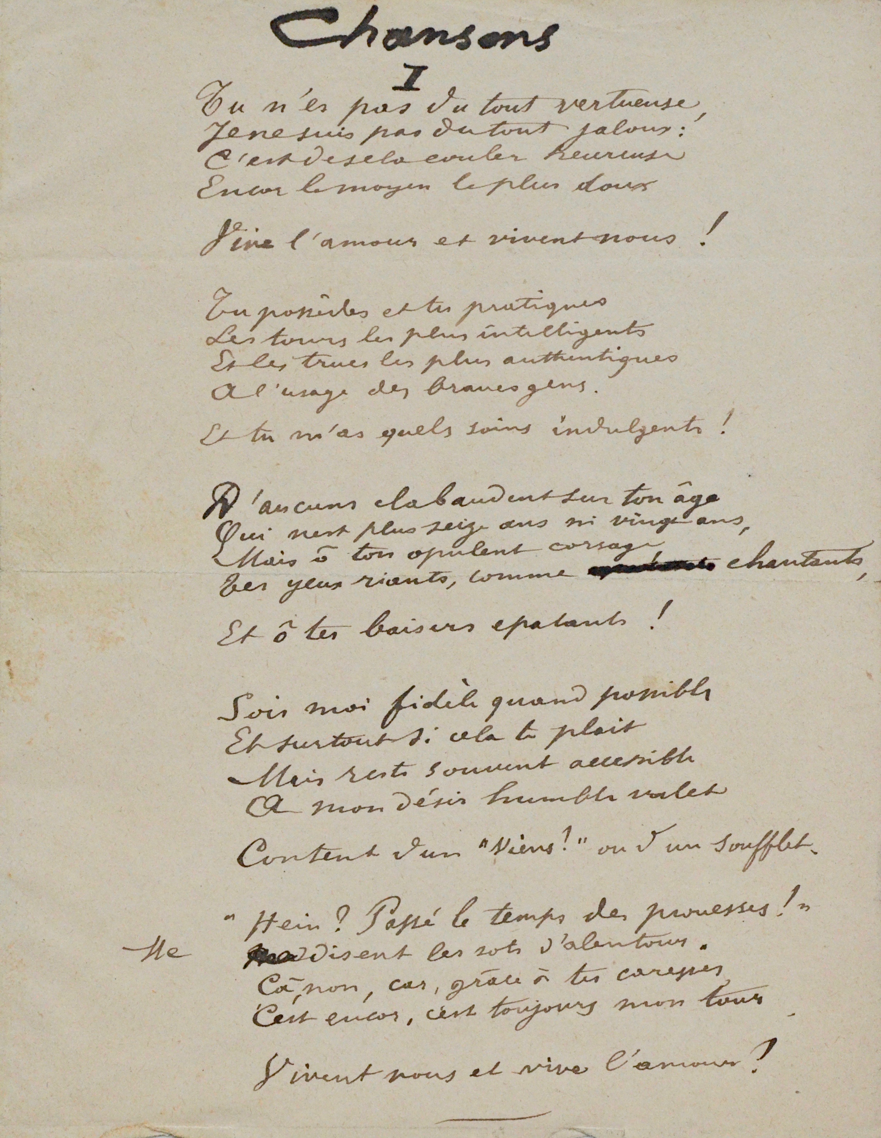 Paul Verlaine (Metz, 1844/1896)Poème autographe de Paul Verlaine, intitulé "Chansons". Il s'agit premier poème de Chansons pour Elle, paru en 1891. Une variation de texte et plusieurs variations de ponctuation. Deux ratures.