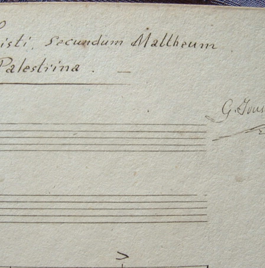 Manuscrit musical : "Passio domini nostri Jesu-Christi, secundum Mattheum annotata per Palestrina". Il porte la signature "G. Jousset" en début et en fin, et la date: 1862. Composition à quatre voix de Giovanni Pierluigi da Palestrina (1525/1594).