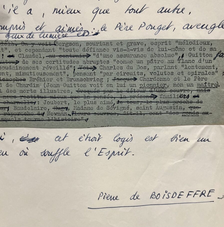 Manuscrit d’un entretien co-écrit par Pierre de Boisdeffre et Jean Guitton