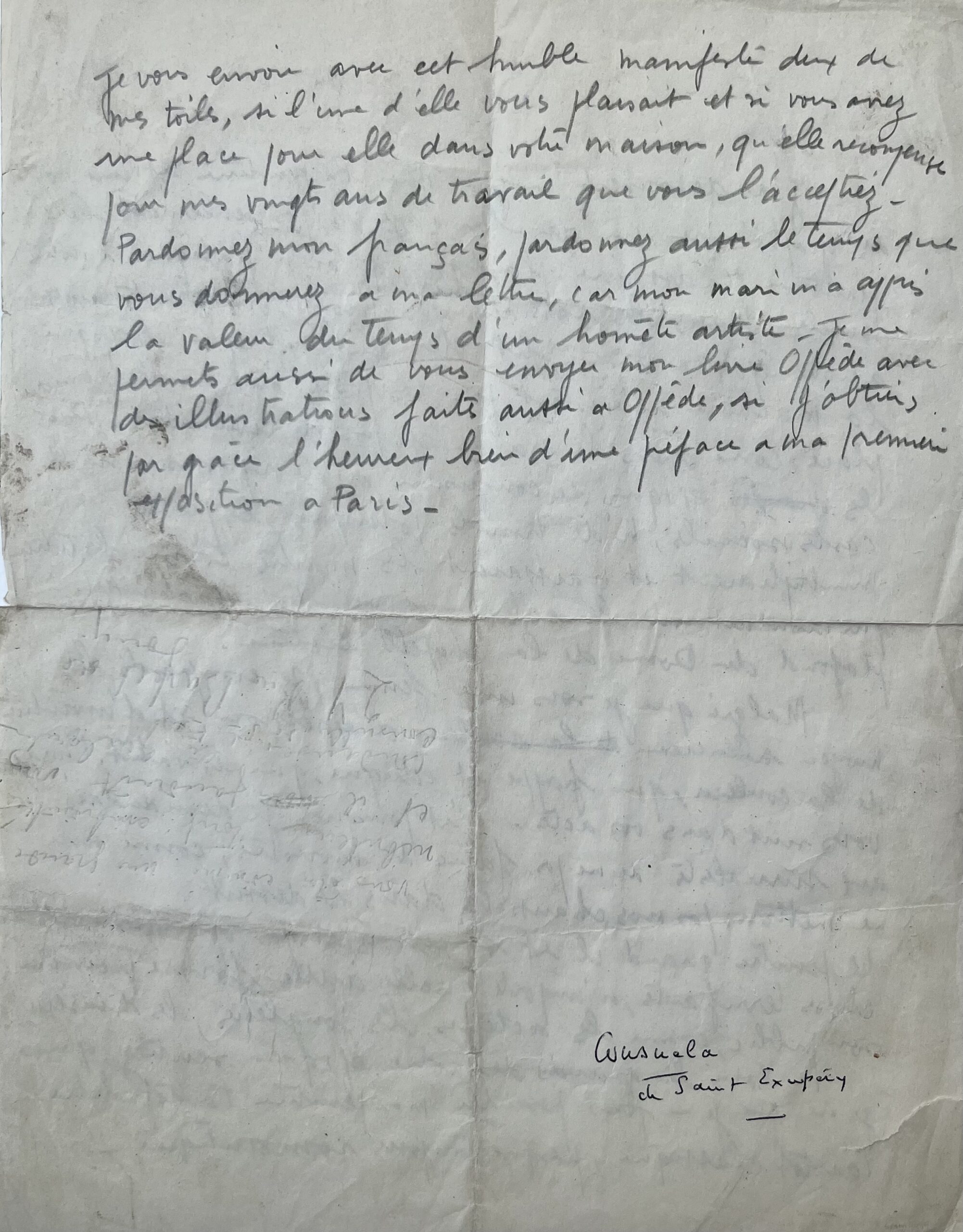 Au dos, Consuelo de Saint-Exupéry écrit quelques lignes d'envoi. "Je vous envoie avec cet humble manifeste deux de mes toiles, si l'une d'elle vous plaisait et si vous aviez une place pour elle dans votre maison, quelle récompense pour mes vingt ans de travail que vous l'acceptiez. Pardonnez mon français, pardonnez aussi le temps que vous donnerez à ma lettre, car mon mari [Antoine de Saint-Exupéry] m'a appris la valeur du temps d'un honnête artiste. Je me permets aussi de vous envoyer mon livre Oppède avec des illustrations faites aussi à Oppède, si j'obtiens par grâce l'heureux bien d'une préface à ma première exposition à Paris".