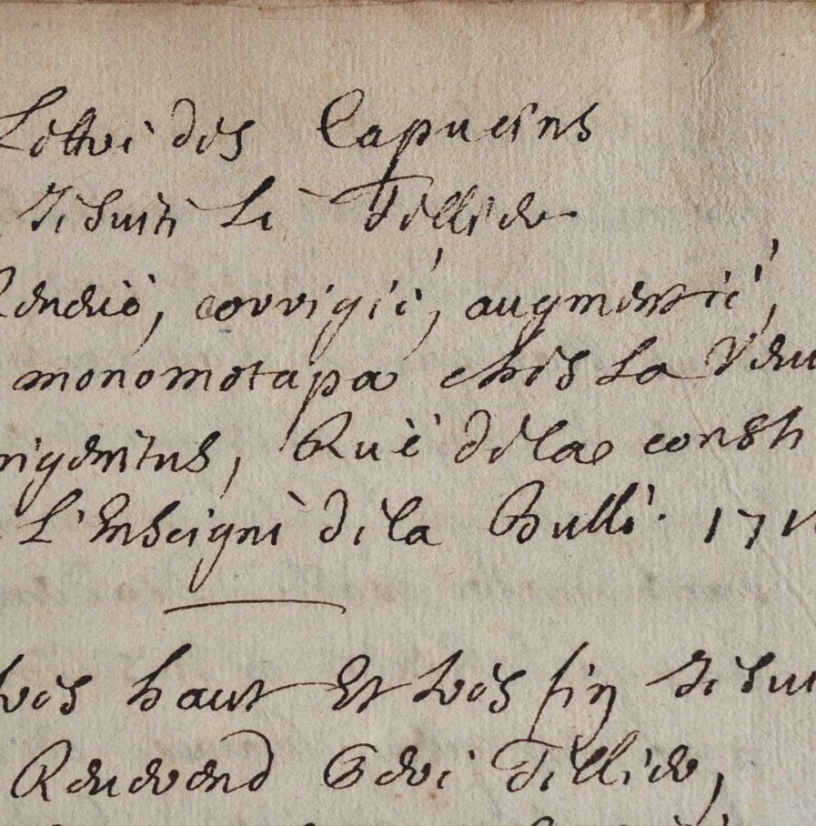 Manuscrit d'un pamphlet contre le père Le Tellier, confesseur de Louis XIV qui s'était attiré une haine générale. Cette pièce satirique, en vers, intitulée "Lettre des Capucins au Jésuite Le Tellier", fut imprimée anonymement sans lieu, ni date, ni imprimeur. Or, notre manuscrit porte la date de 1716, plusieurs corrections (dont un paragraphe biffé), un titre différent (celui de l'imprimé étant "Lettre des RR. Pères Capucins au R. P. Le Tellier [...]"), et une adresse fantaisiste qui ne figure pas sur l'imprimé : "Reveüe, corrigée, augmentée / A Monomotapa chés la Veuve / Unigenitus, ruë de la Constitution / A l'enseigne de la Bulle". L'écrit date du début de la Régence qui a marqué sa disgrâce, comme ces vers l'illustrent : "Et les portes de la Bastille / Qui battoient jadis sous vos lois / Ne connoissent plus votre voix. / Ainsi ceux que par vos pratiques / Aviés enclos comme hérétiques / Ils en sortent tous triomphants. / Ce beau Philippe d'Orléans / Le plus déclaré Queneliste / Que deviés mettre en votre liste / Las ! par ses horribles méfaits / A dérangé tous vos projets / Il vous a supplanté le traître. / Vous n'êtes rien, il est le maître [...]".