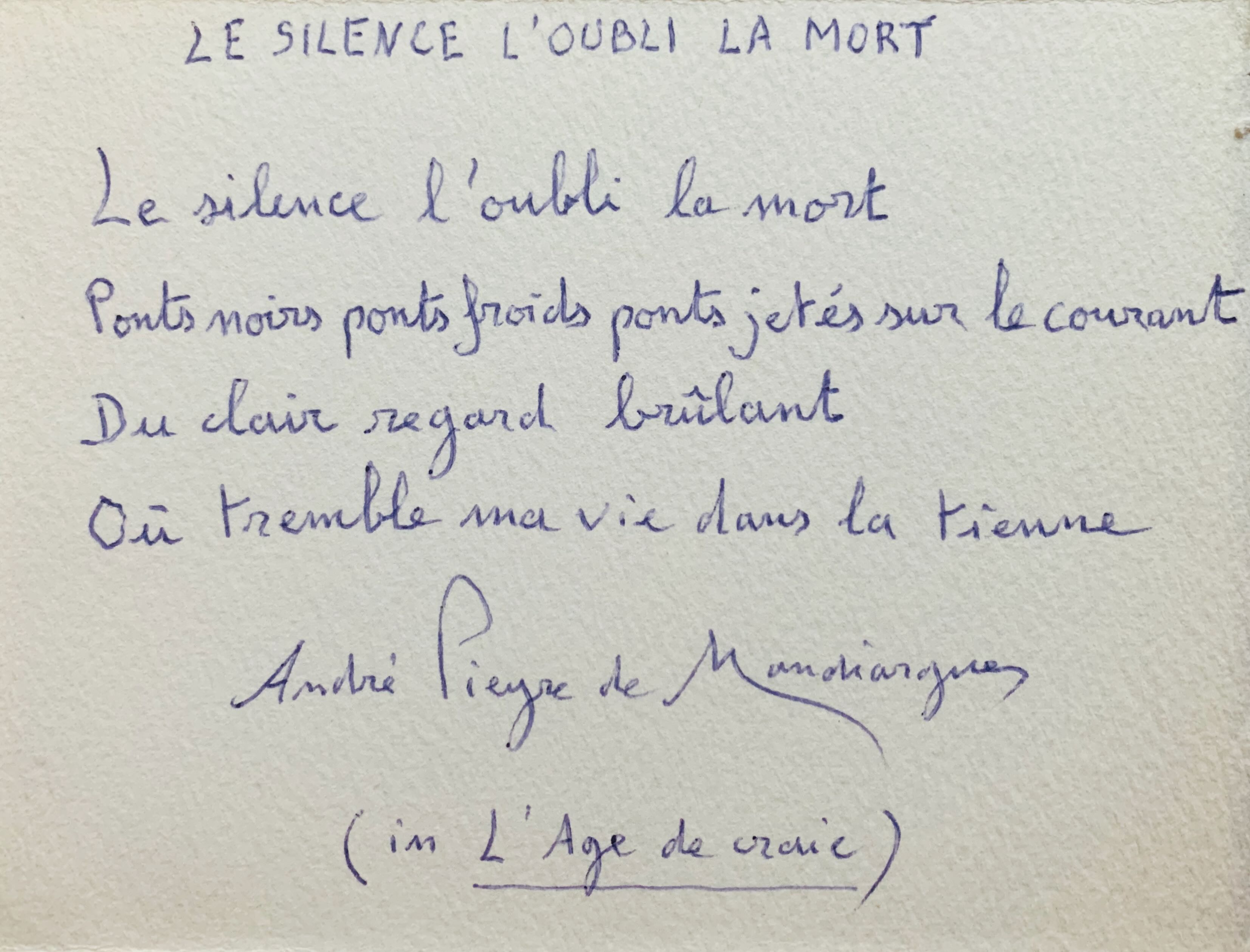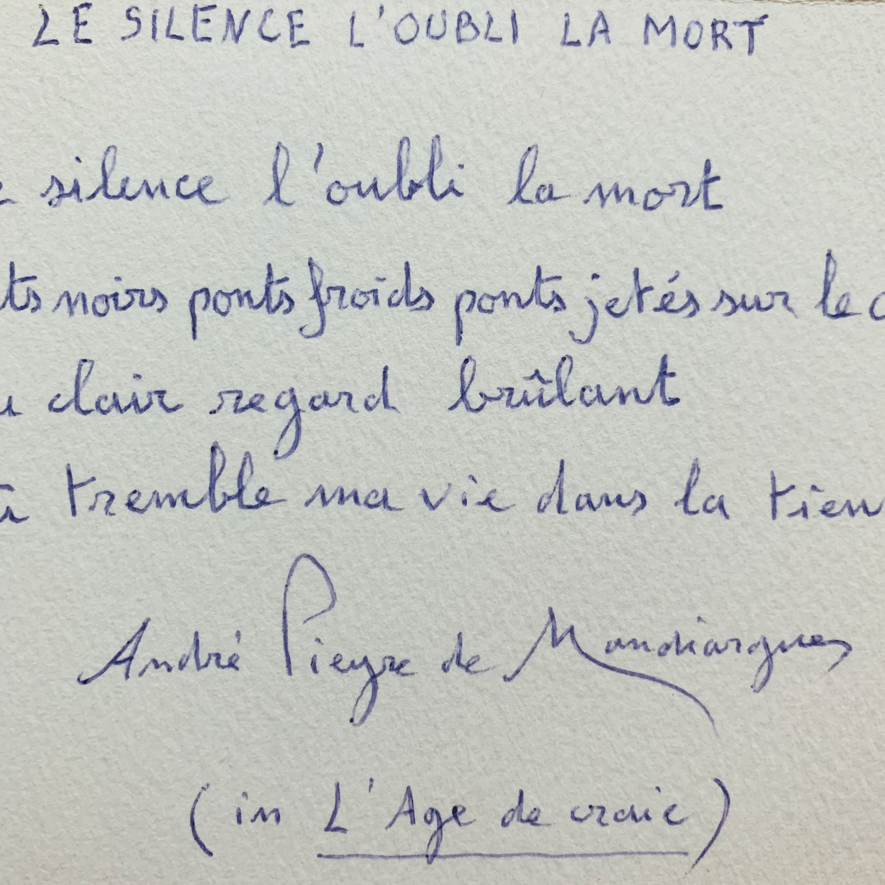 Manuscrit du quatrain Le Silence l'Oubli la Mort d'André Pieyre de Mandiargues, publié dans l'Âge de Craie.