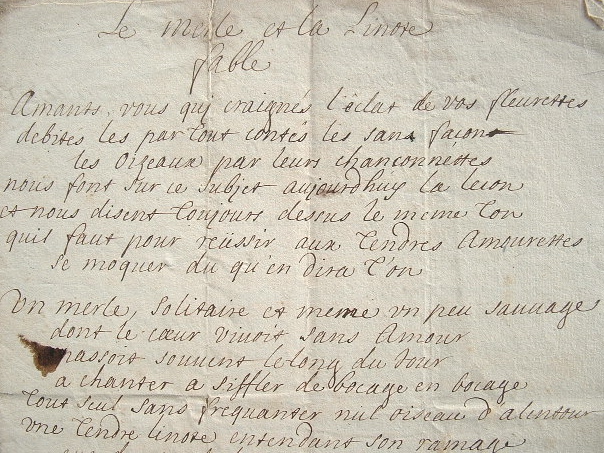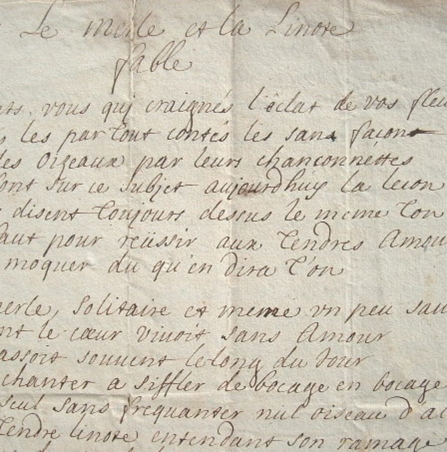 Manuscrit d'une fable, qui semble inédite, intitulée "Le Merle et la Linote", signée "Pomme", comprenant quelques ratures et corrections. Elle se termine ainsi : "Amants vous qui craignés l'éclat de vos fleurettes / Débités les partout, contés les sans façon / Les oiseaux par leurs chansonnettes / Nous font sur ce subjet aujourd'huy la leçon / Et nous disent toujours dessus le même ton / Qu'il faut pour réussir aux tendres amourettes / Se moquer du qu'en dira t'on". [Florian mit également en scène ces deux volatiles dans sa fable Le Linot].