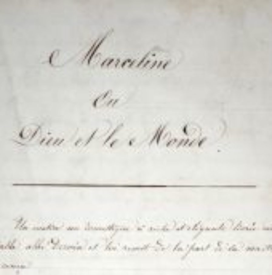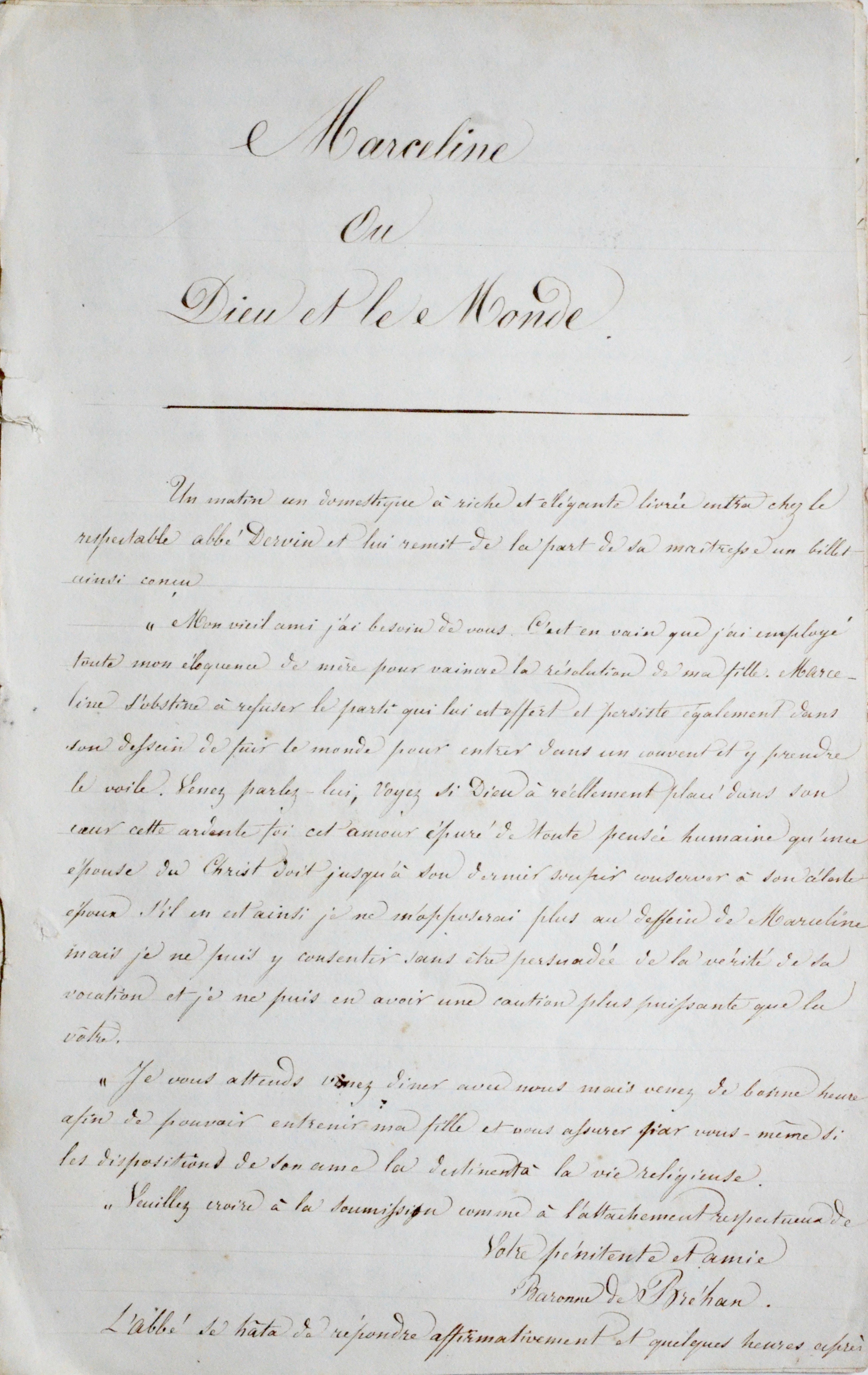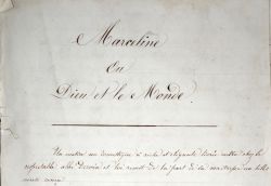 Manuscrit d'une première version inédite du conte dÉlisa Mercoeur, Marceline, qui diffère de celle publiée dans les Oeuvres complètes (avec une notice écrite par la mère de l'auteur sur la genèse de Marceline). Le titre est ici "Marceline ou Dieu et le Monde".