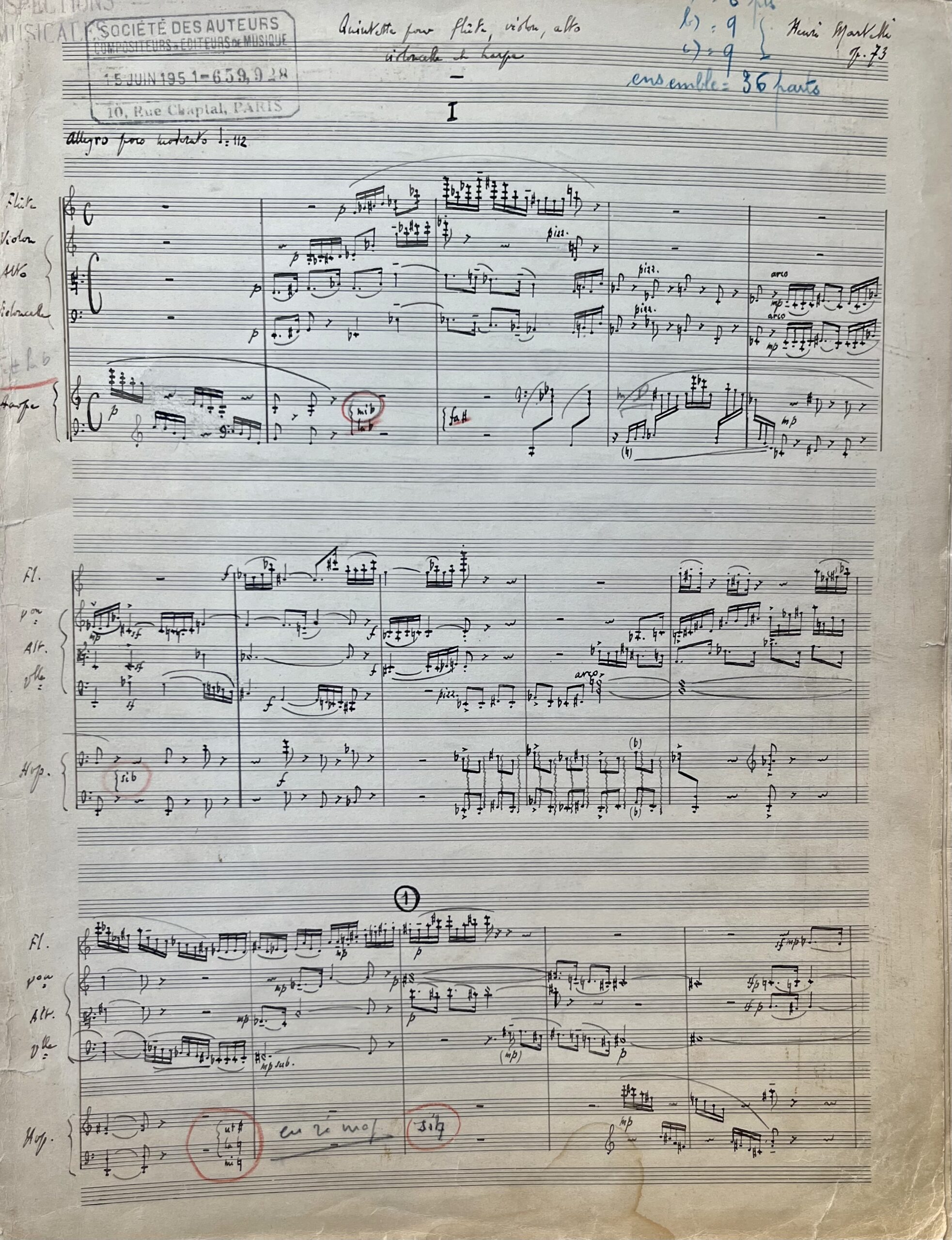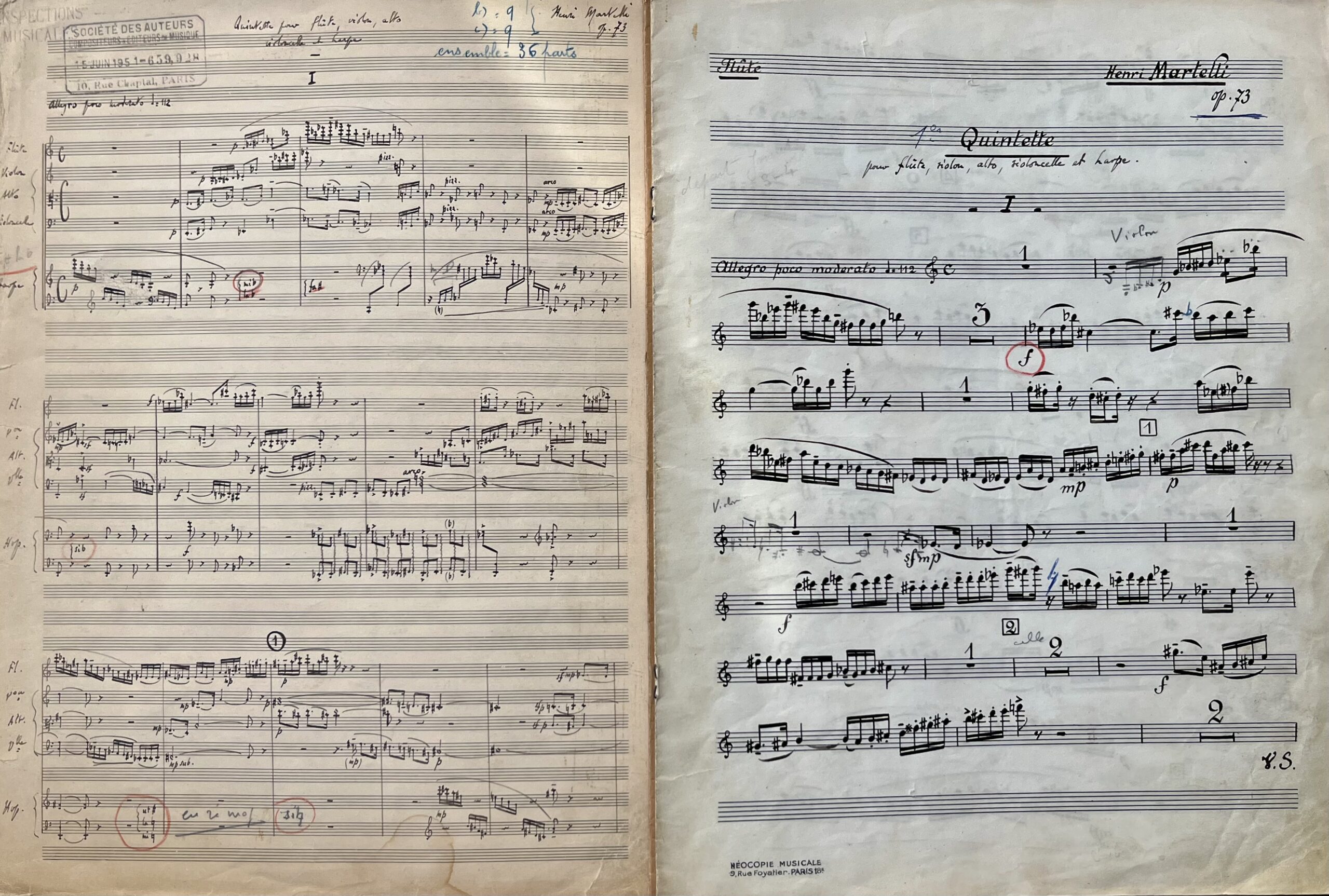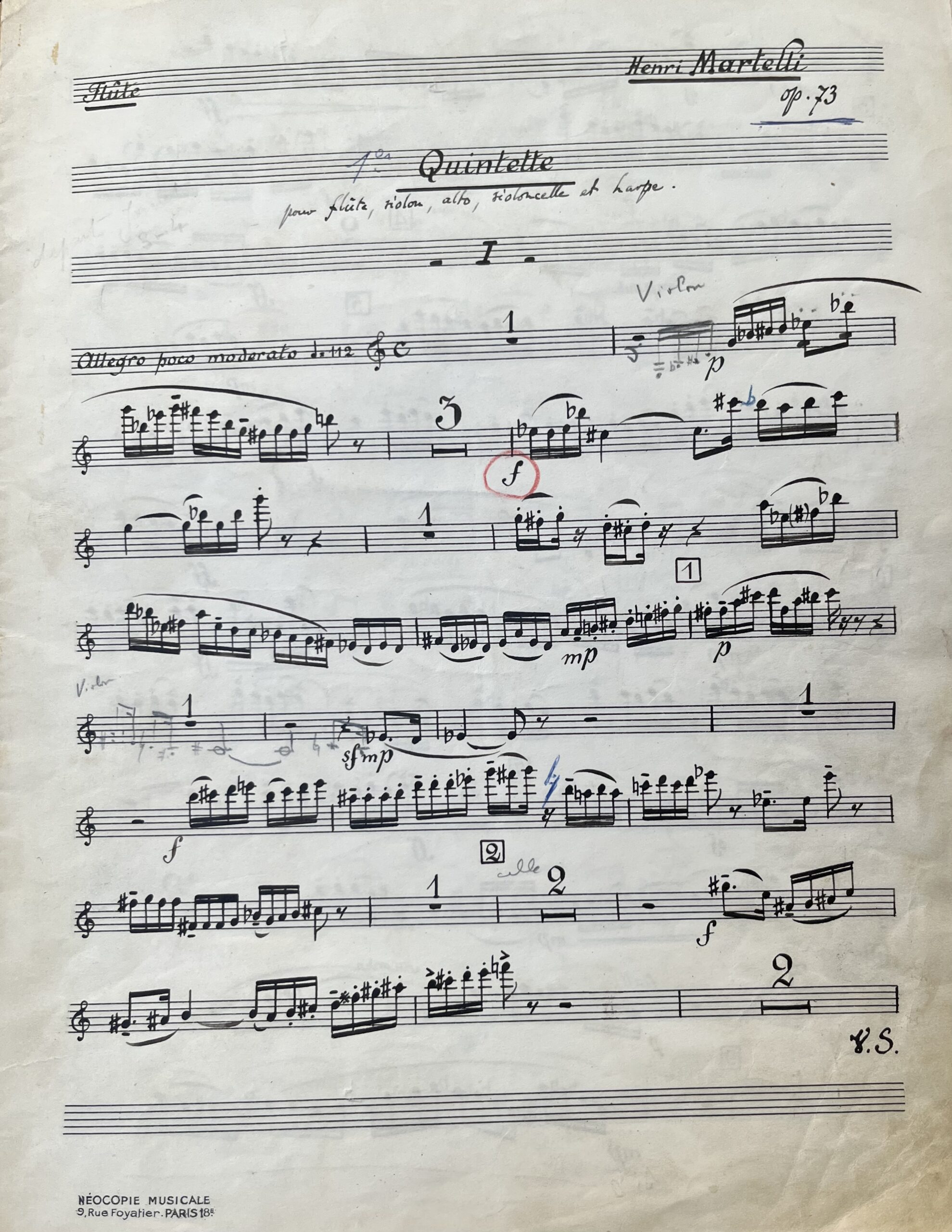 Manuscrit musical original de la main d'Henri Martelli de son opus 73 : le premier quintette pour flûte, violon, alto, violoncelle et harpe.