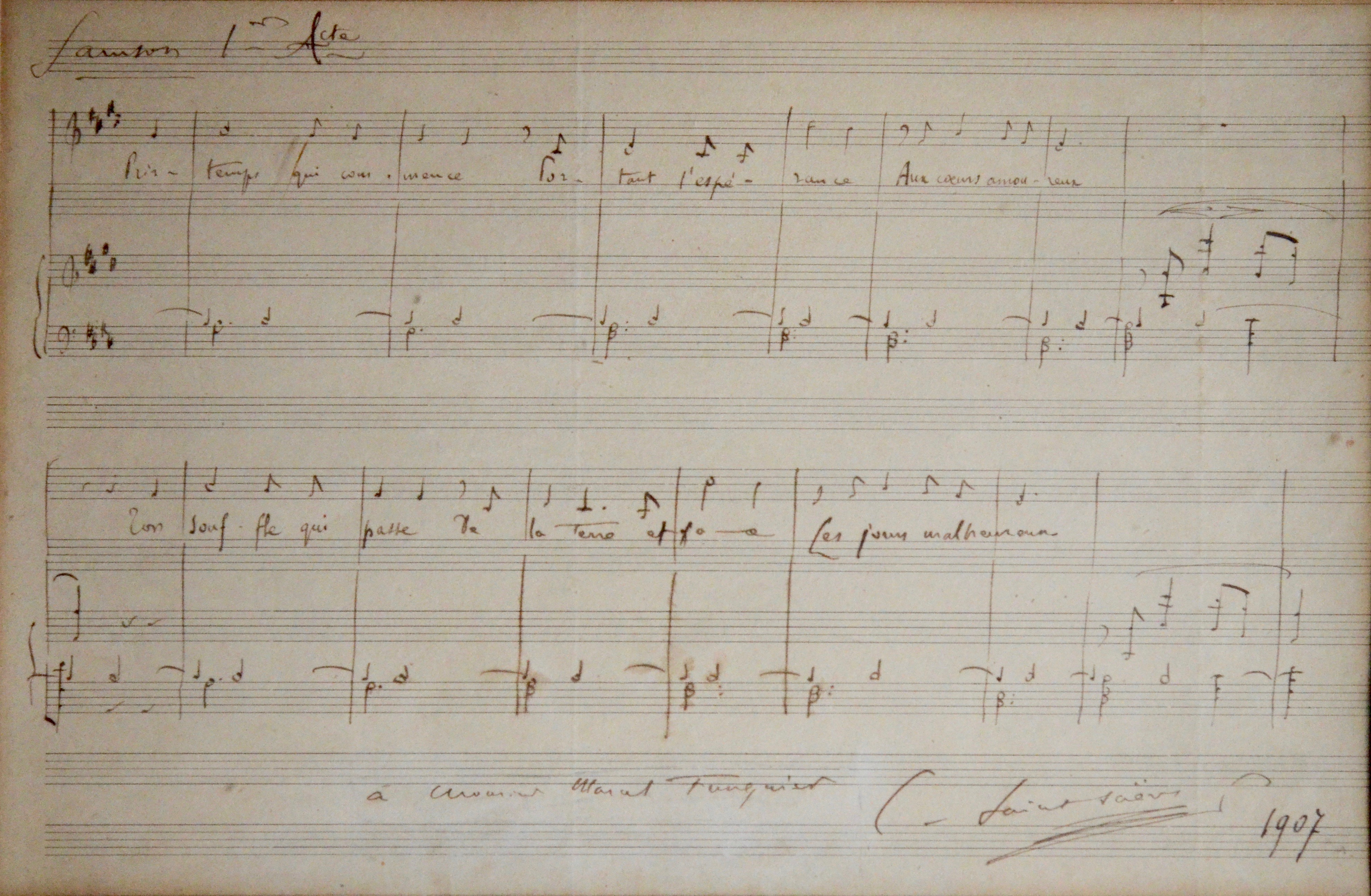 Beau manuscrit musical autographe signé tiré du célèbre opéra de Saint-Saëns, Samson et Dalila, titré "Samson 1er acte". Encadré.