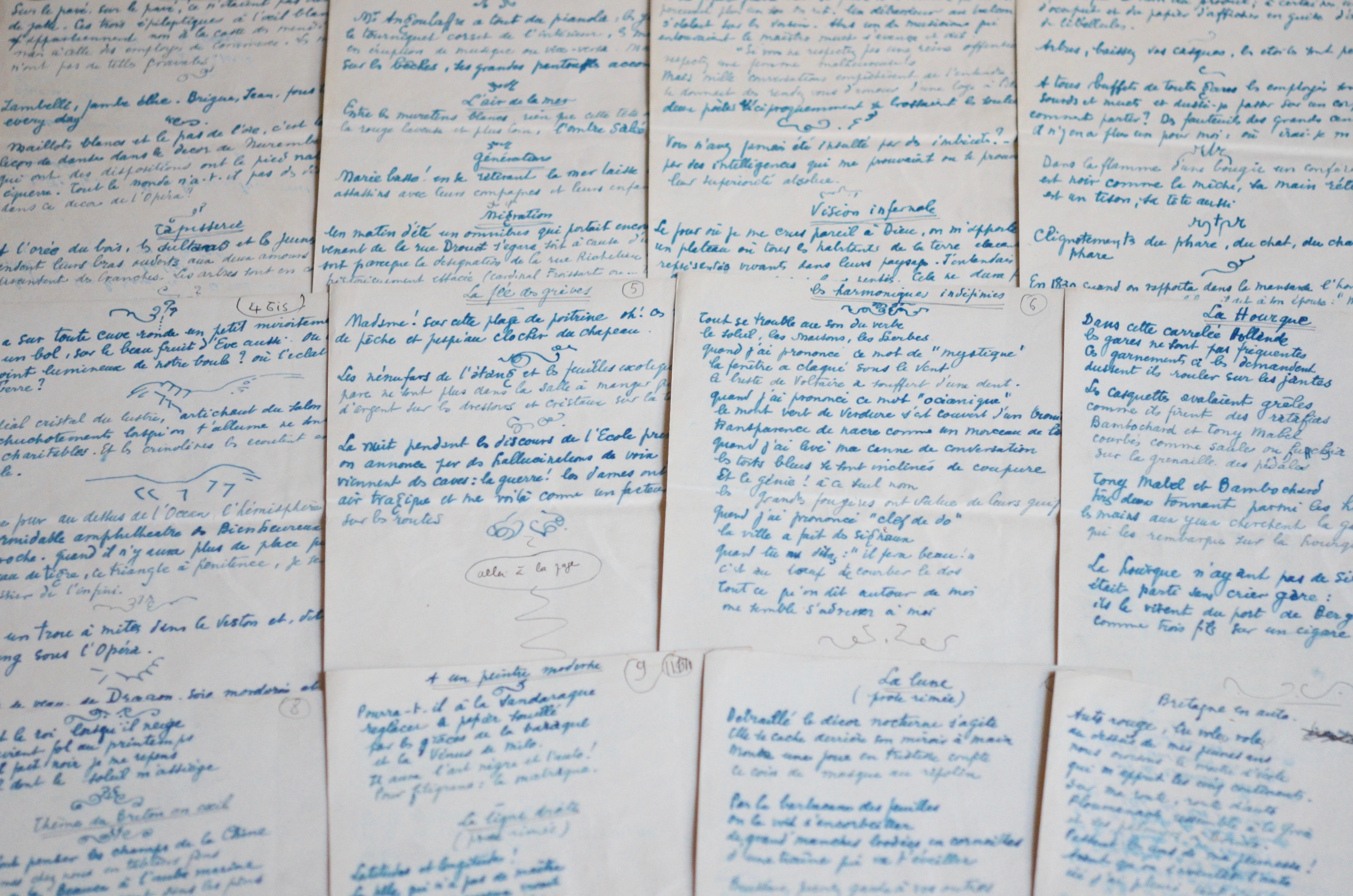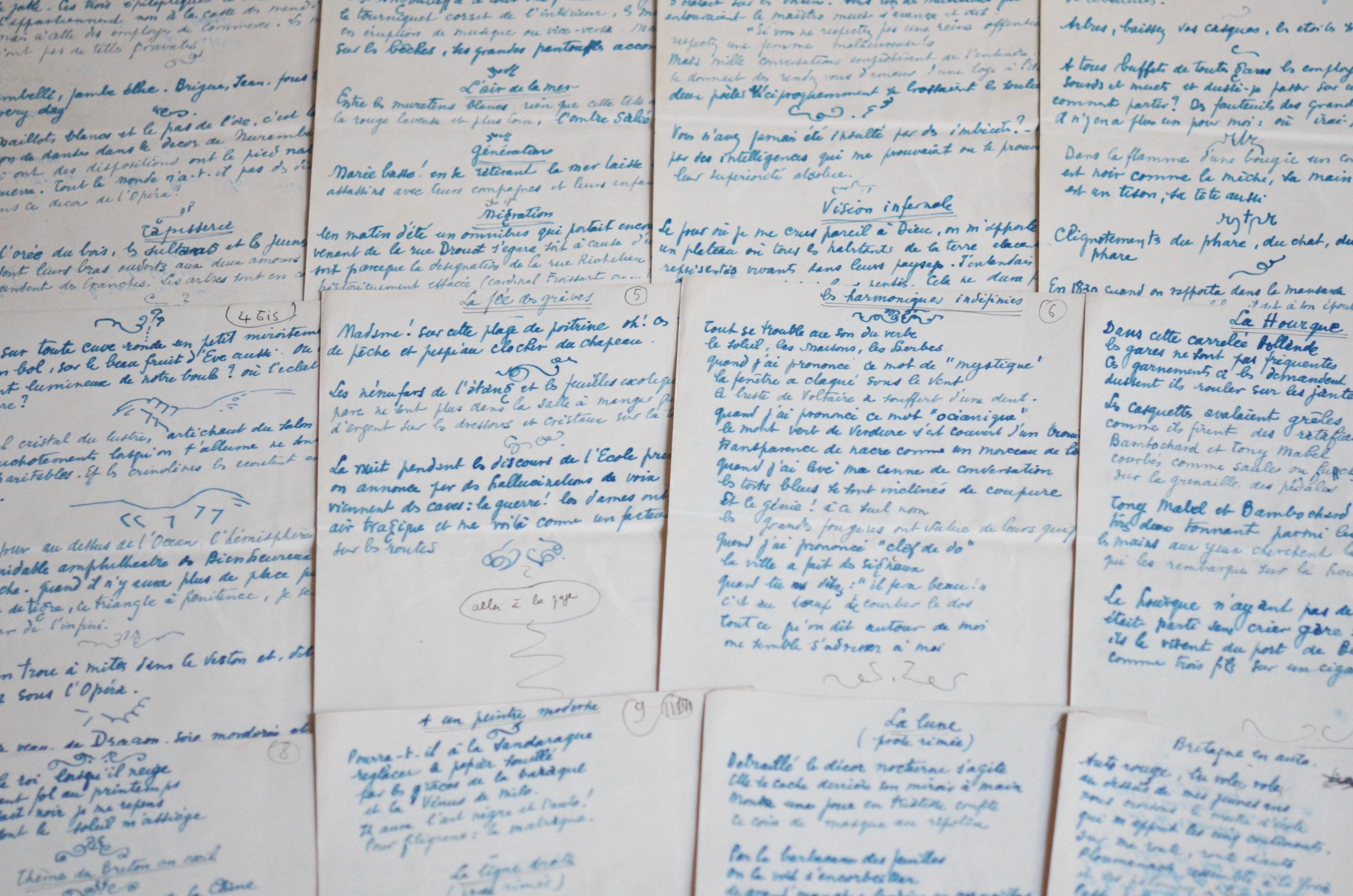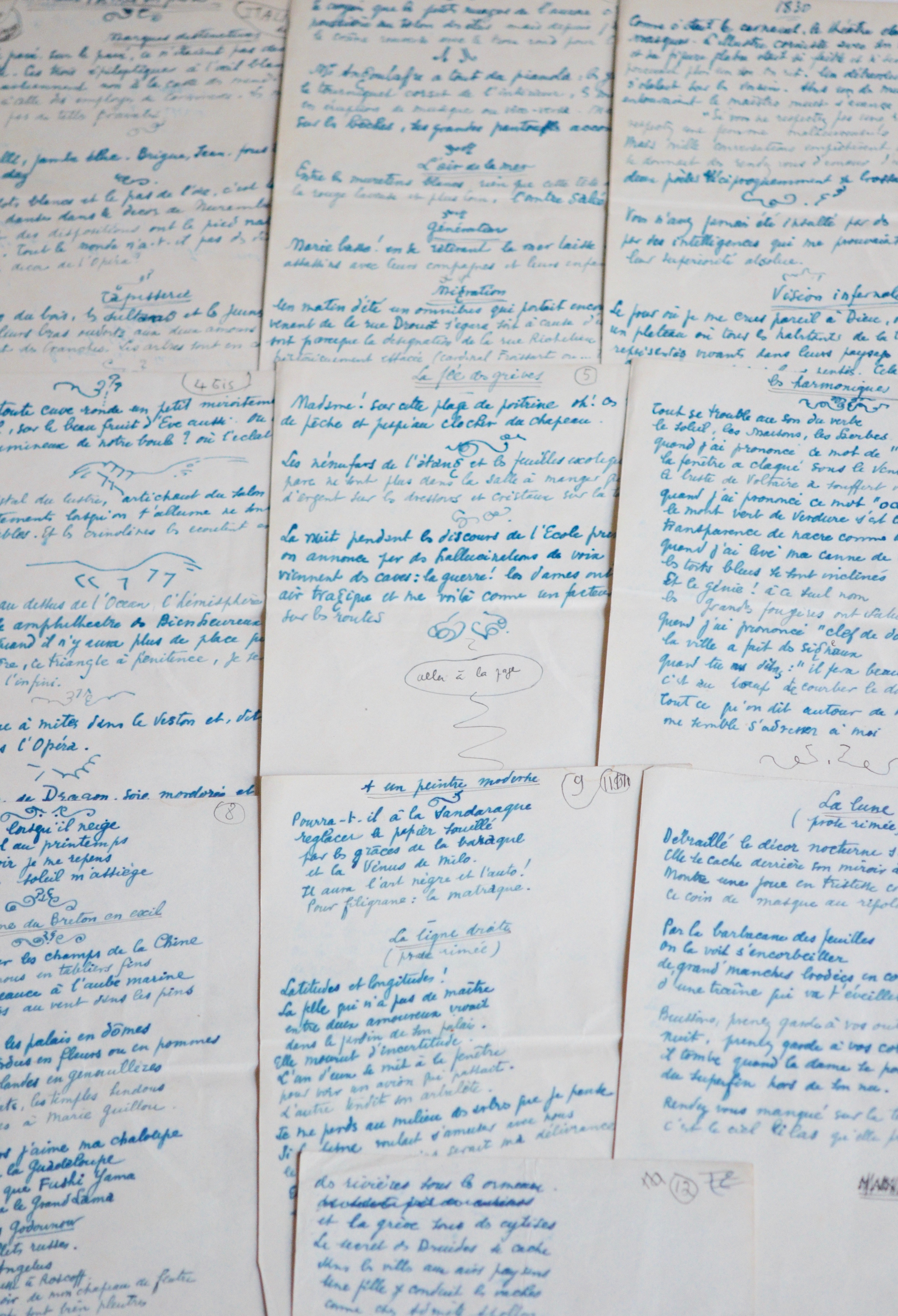 Encre turquoise. Pagination, annotations de typographie et remarques destinées à une édition future.