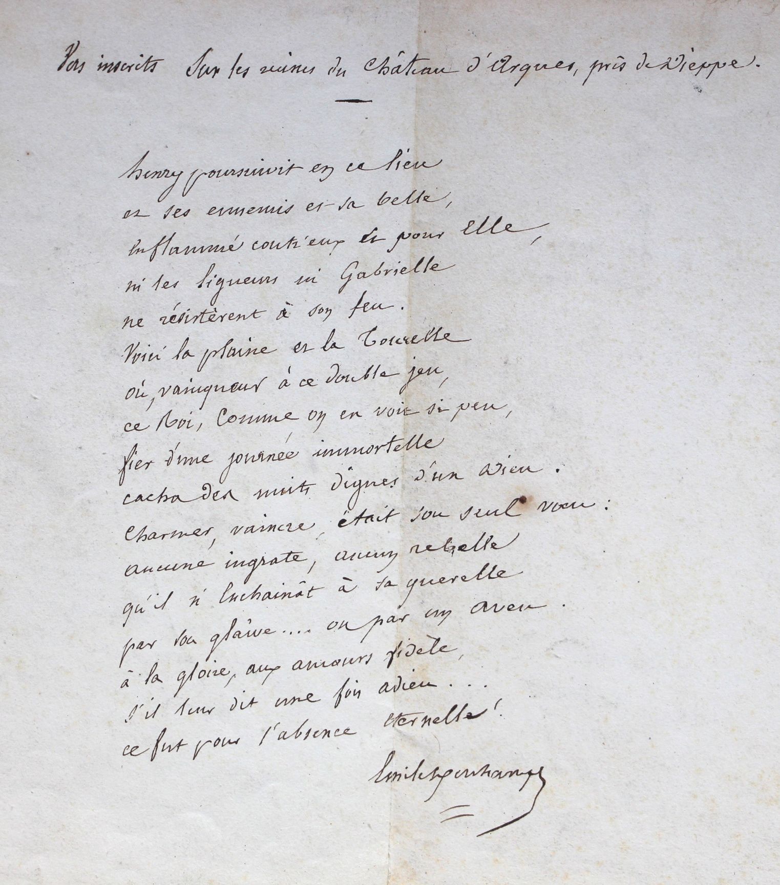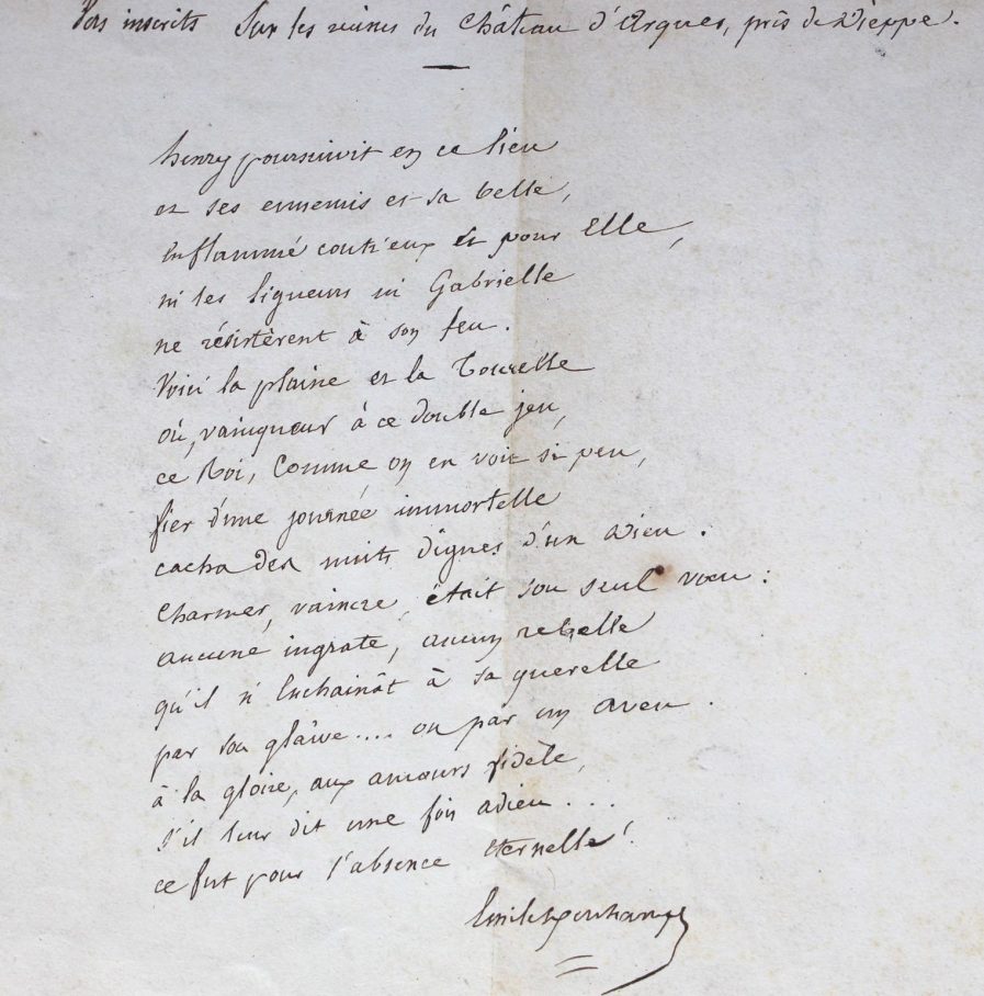 Manuscrit complet de la fable russe traduite par Emile Deschamps, L'âne et le Rossignol, parue dans le Tome II (pp. 292-293) des "Fables russes tirées du recueil de M. Kriloff et imitées en vers français et italiens par divers auteurs [...]" publiées par le comte Orloff, en 1825. Au dos, un autre texte en vers signés Emile Deschamps : "Vers inscrits sur les ruines du château d'Arques, près de Dieppe". Ces deux poèmes ont été publiés en 1826 dans les Annales romantiques, respectivement pages 303 et 135.