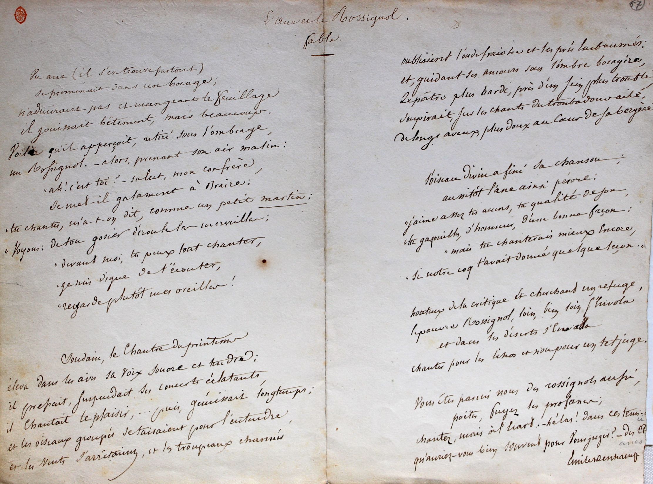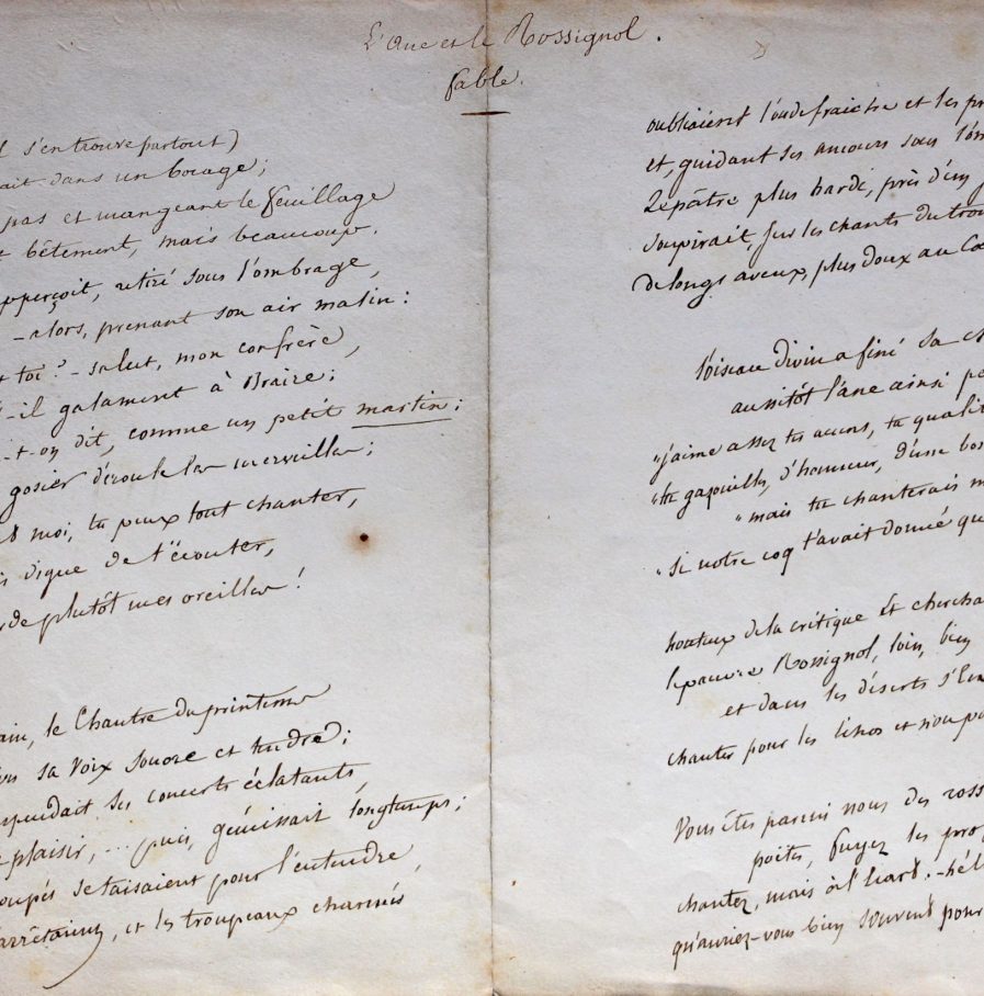 Manuscrits d’une fable et d’un poème d’Emile Deschamps.