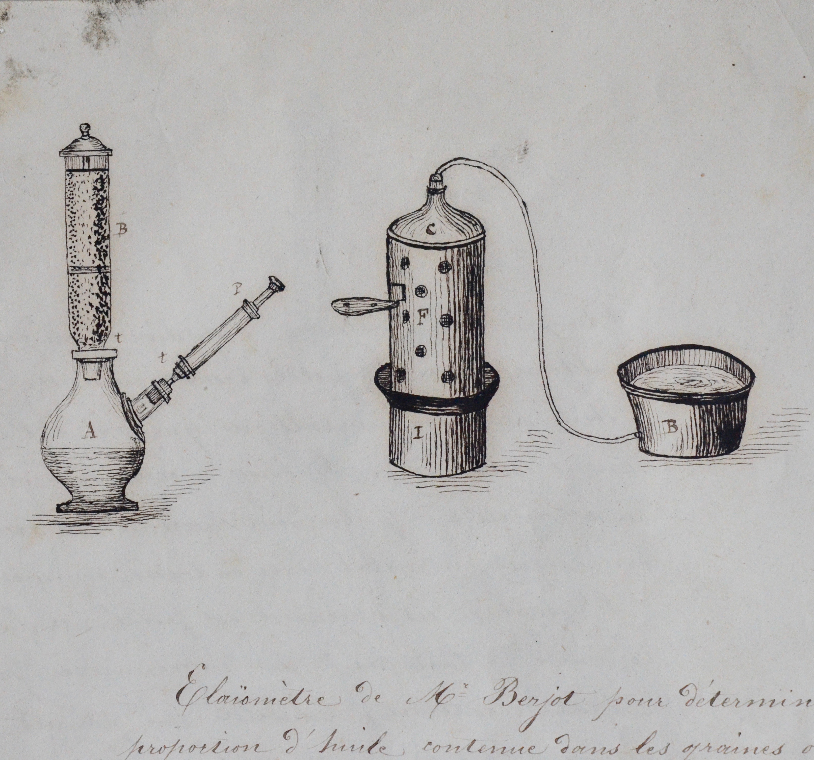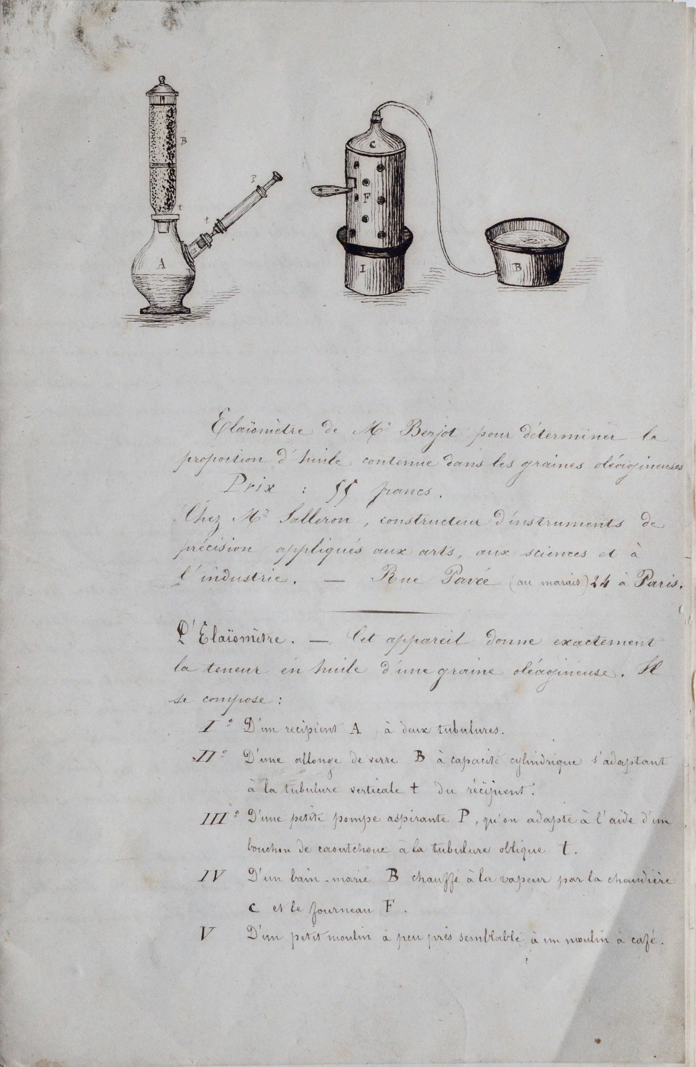 -Elaïomètre de Mr Berjot pour déterminer la proportion d'huile contenue dans les graines oléagineuses. Prix 55 francs. Chez Mr. Salleron, constructeur d'instruments de précisions appliqués aux arts, aux sciences et à l'industrie. Paris.