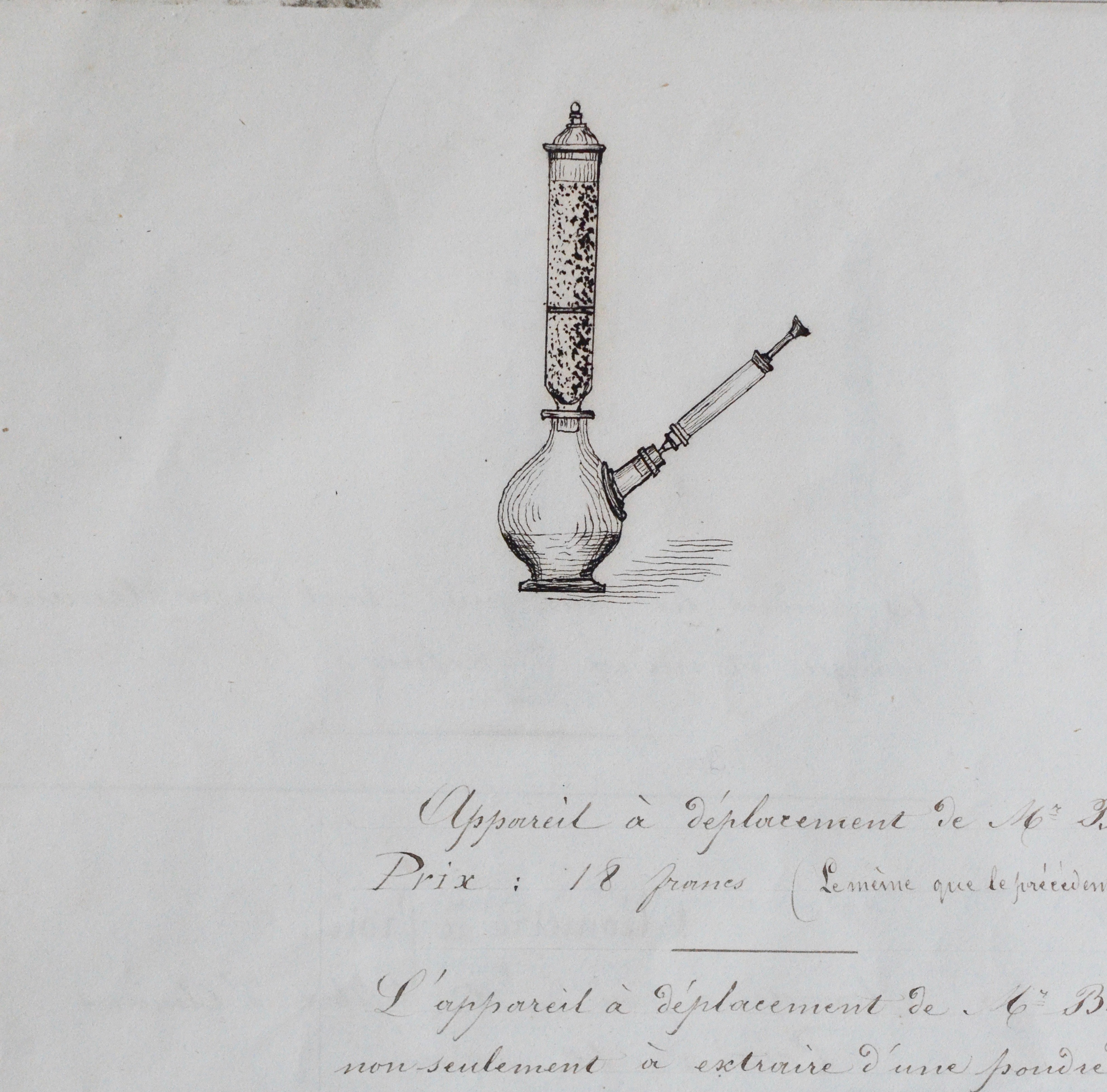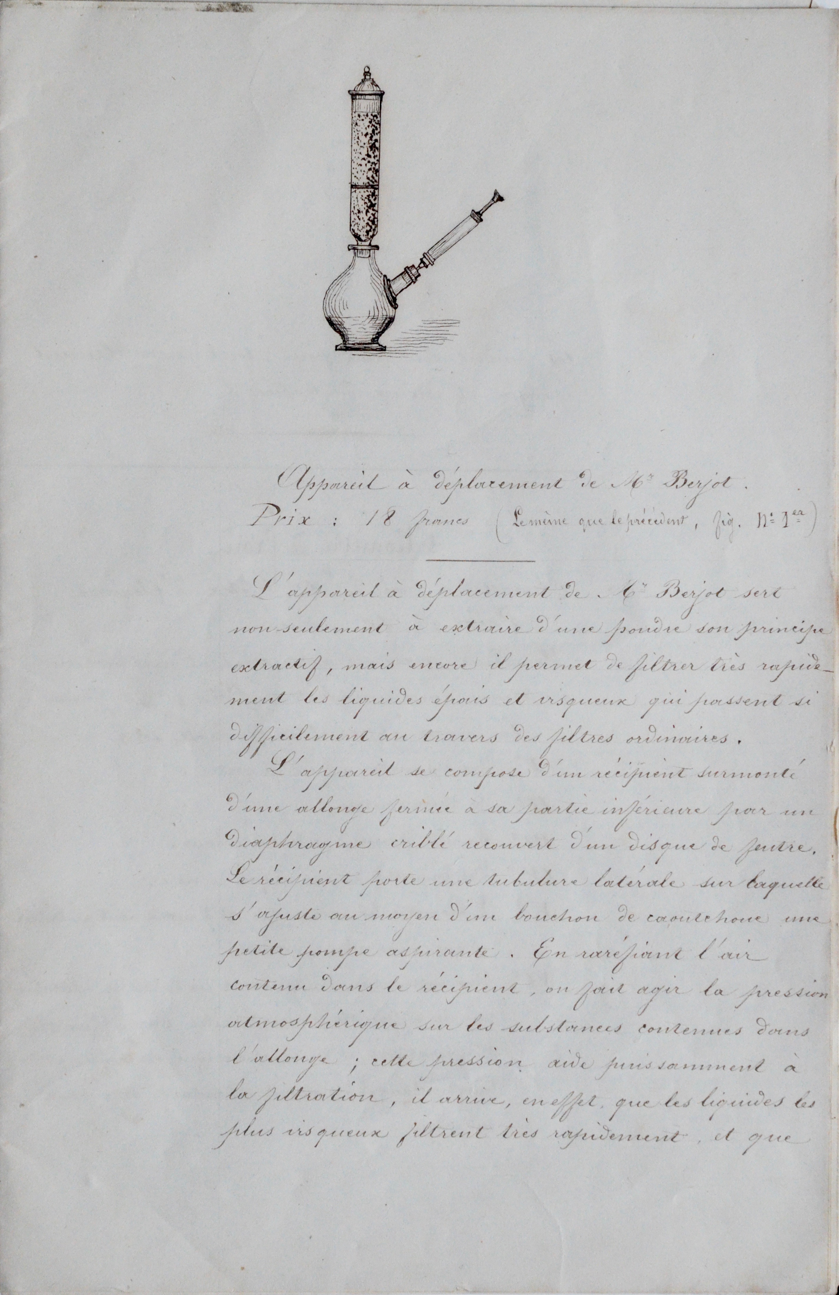 -Appareil à déploiement de Mr Berjot pour extraire d'une poudre son principe actif et filtrer très rapidement les liquides épais et visqueux. Prix 18 francs.