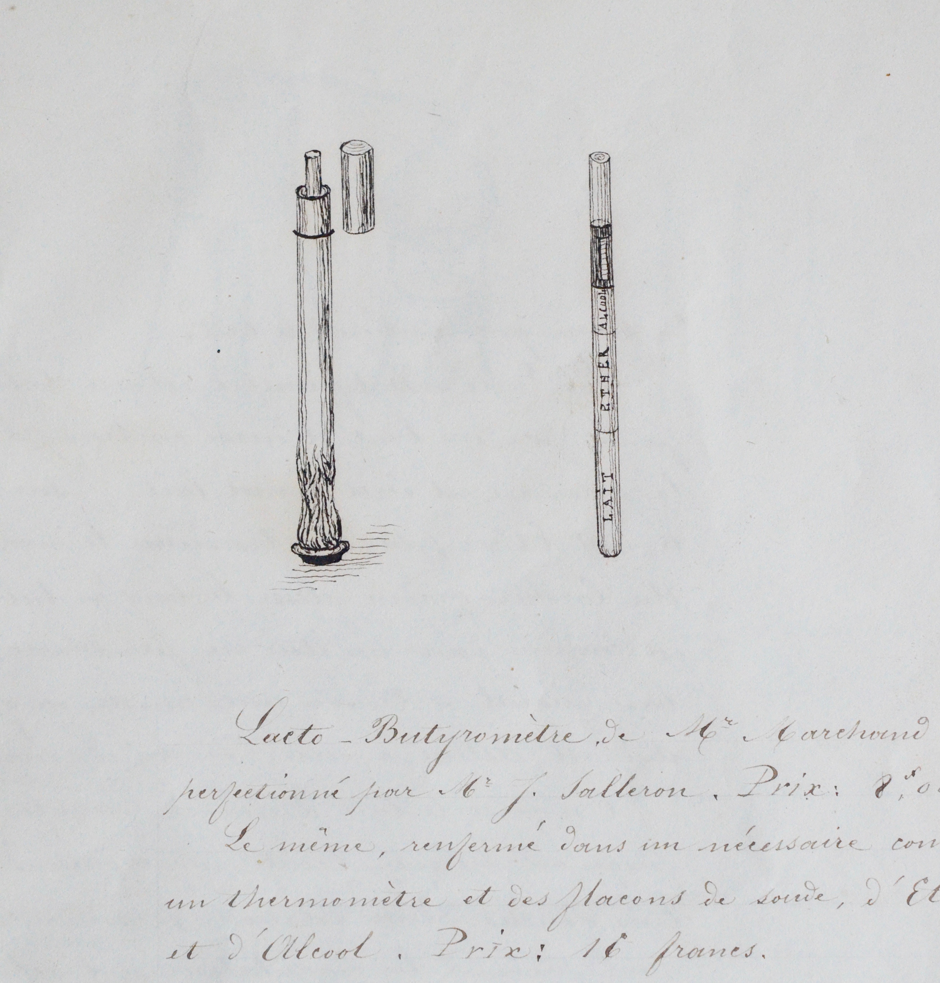 -Lacto-Butyromètre de Mr. Marchand perfectionné par Mr. Salleron, pour mesurer la proportion de beurre que contient le lait. 8 francs.