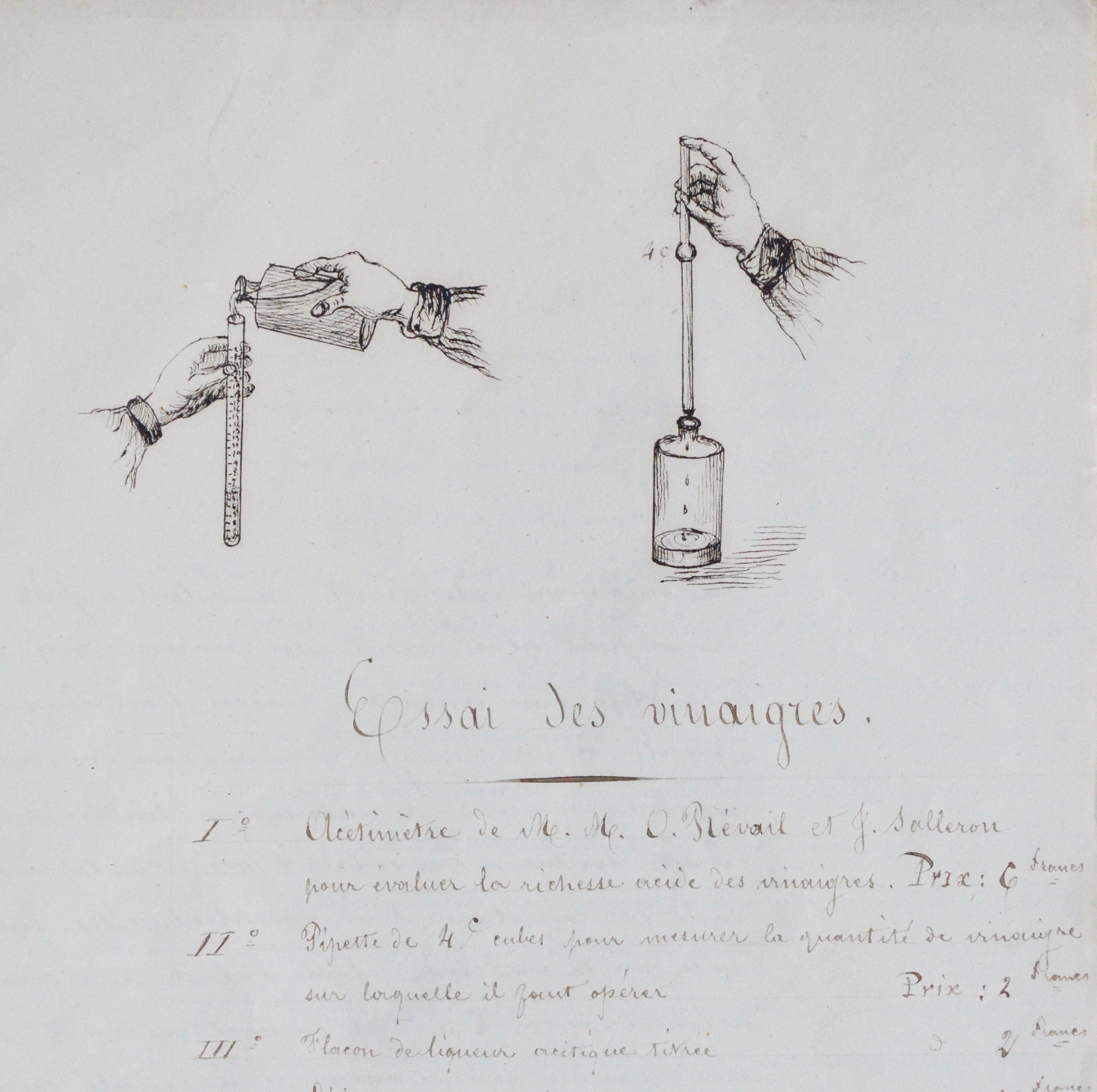-"Essai des vinaigres", avec l'Acétimètre de M.M. O. Révail et J. Salleron fait pour évaluer la richesse acide des vinaigres. Instrument complet avec accessoires. 30 francs.