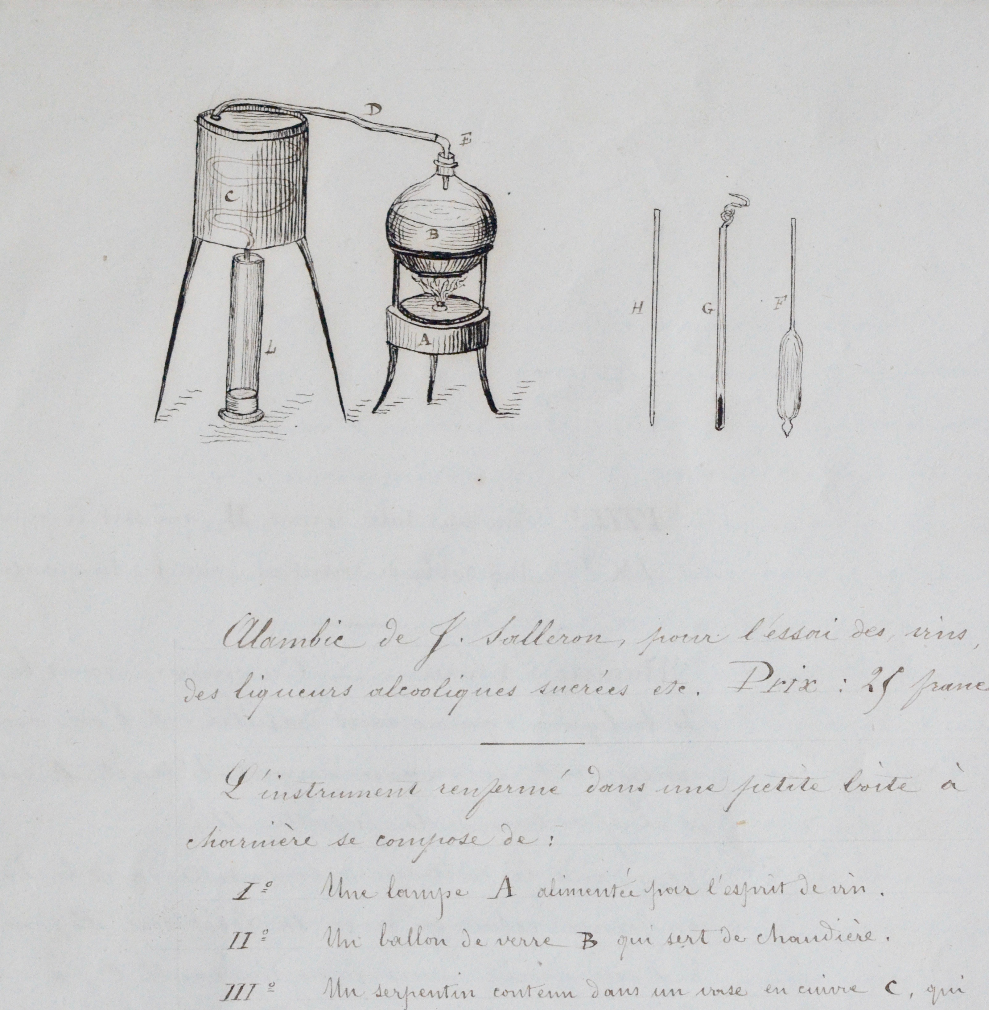 -Alambic de J. Salleron pour l'essai des vins, des liqueurs alcooliques sucrées, etc. Prix 25 francs.