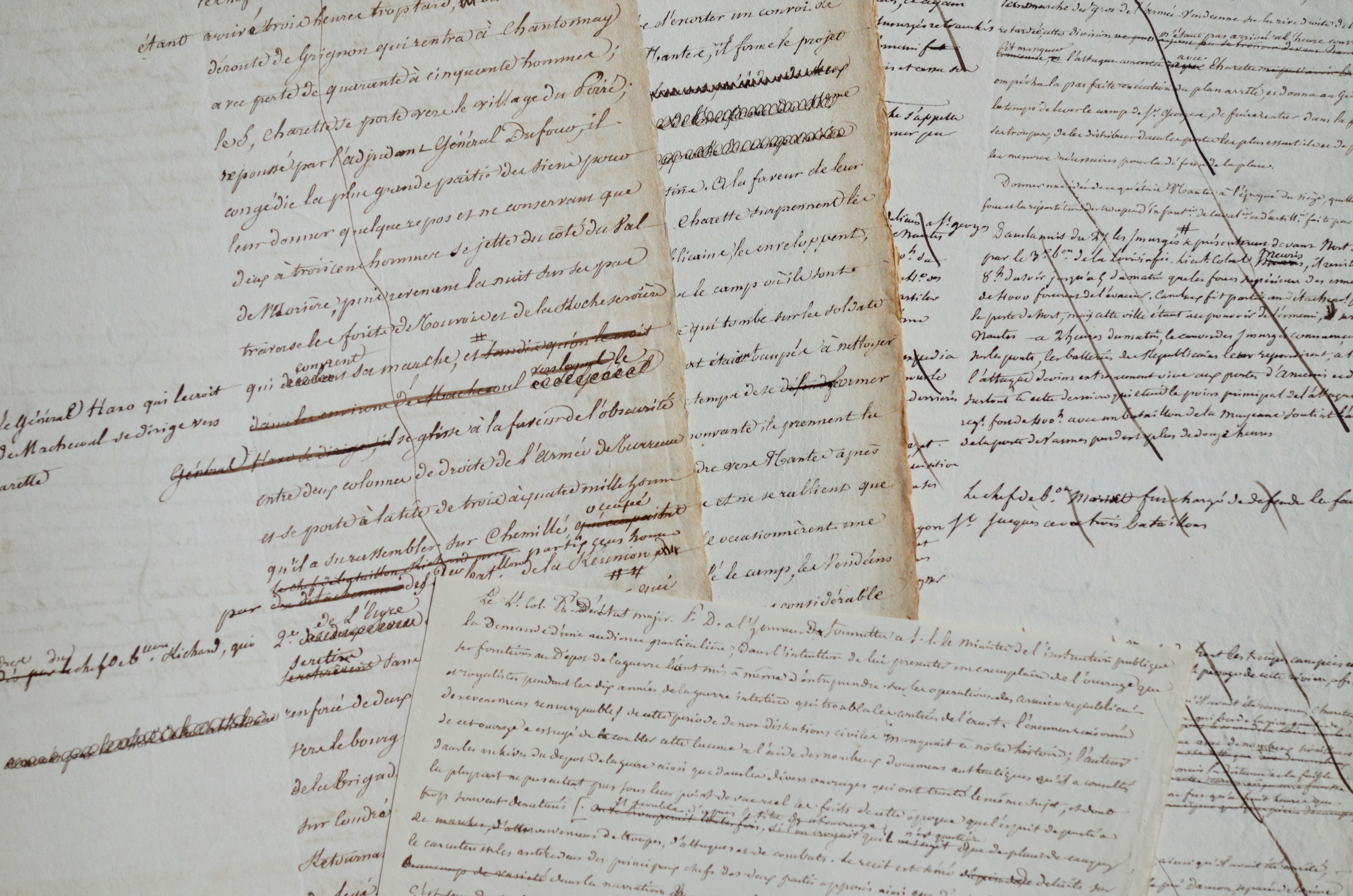 Ensemble de manuscrits du début du XIXe, d'un historien non identifié, relatifs aux guerres de Vendée, avec corrections et passages biffés :