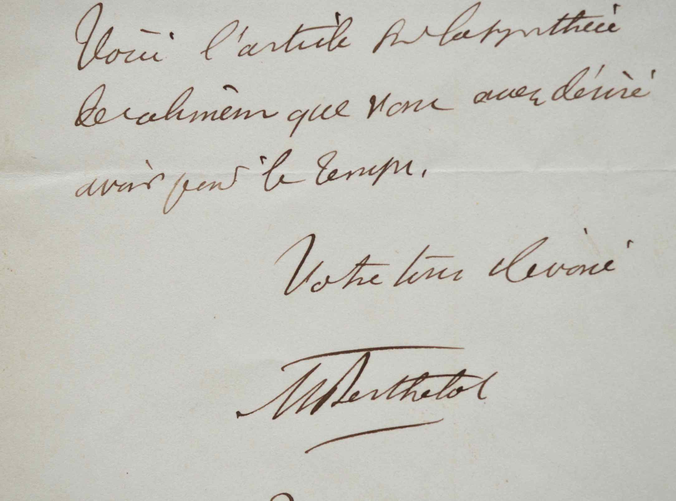 Marcelin Berthelot adresse son article "sur la synthèse des aliments que vous avez désiré avoir pour le Temps". Et d'ajouter sous sa signature : "Rémunéré?"