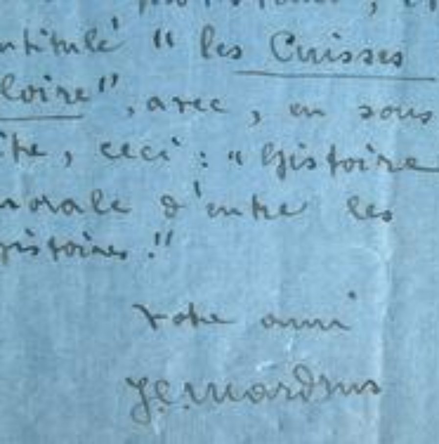 Mardrus envoie ses voeux à son «ami incorrigiblement gourmand», Pierre Louÿs. «Votre dépêche ne m'a pas étonné une minute. Toute la nuit, en effet, - moi qui d'ordinaire ne rêve presque jamais - j'ai été plongé, en dormant, dans la lecture, et quelle! d'un roman nouveau de vous tiré à deux cents éditions de mille, dédié à je ne sais quel pasteur protestant, et intitulé "les Cuisses de gloire", avec, en sous-titre, ceci : "histoire morale d'entre les histoires"».