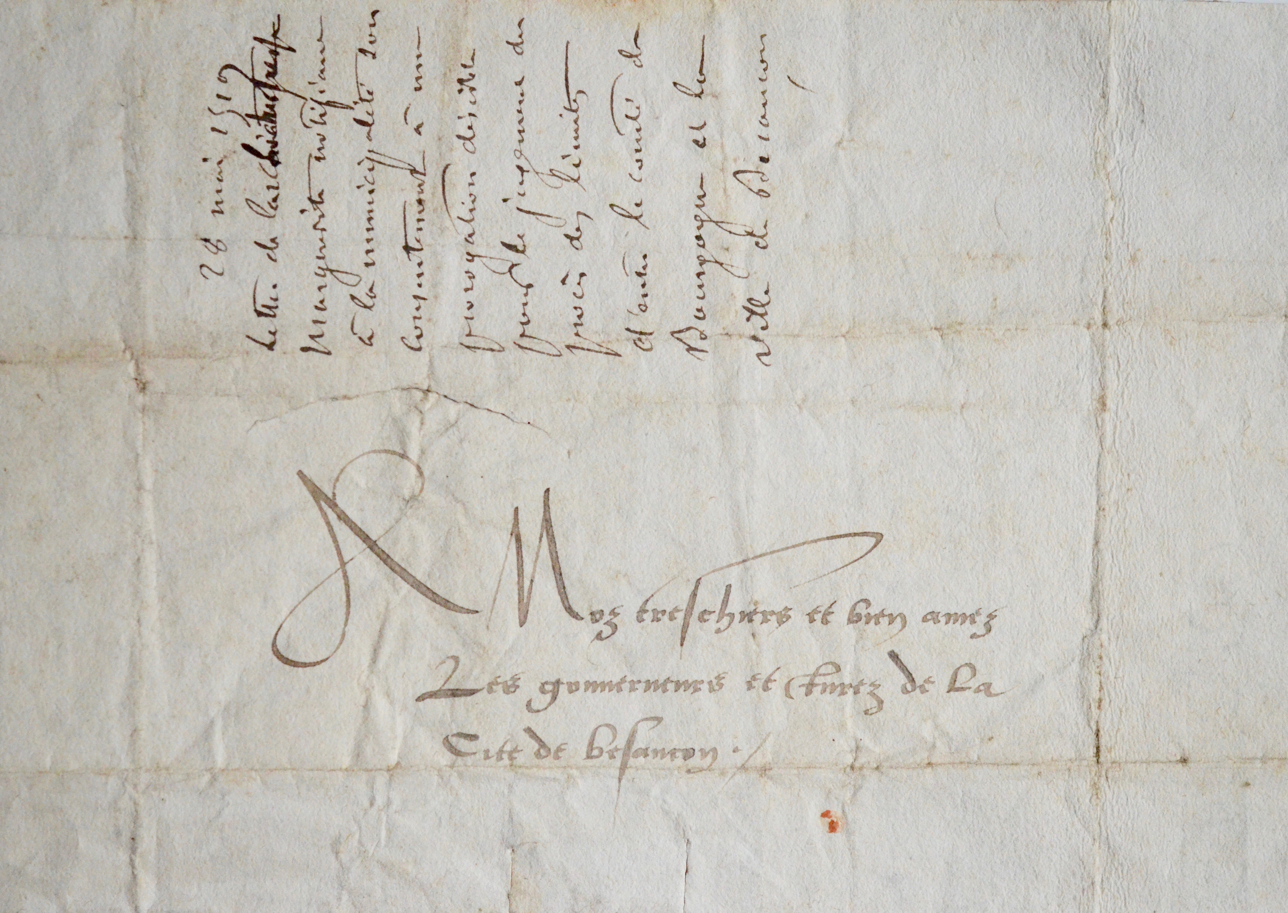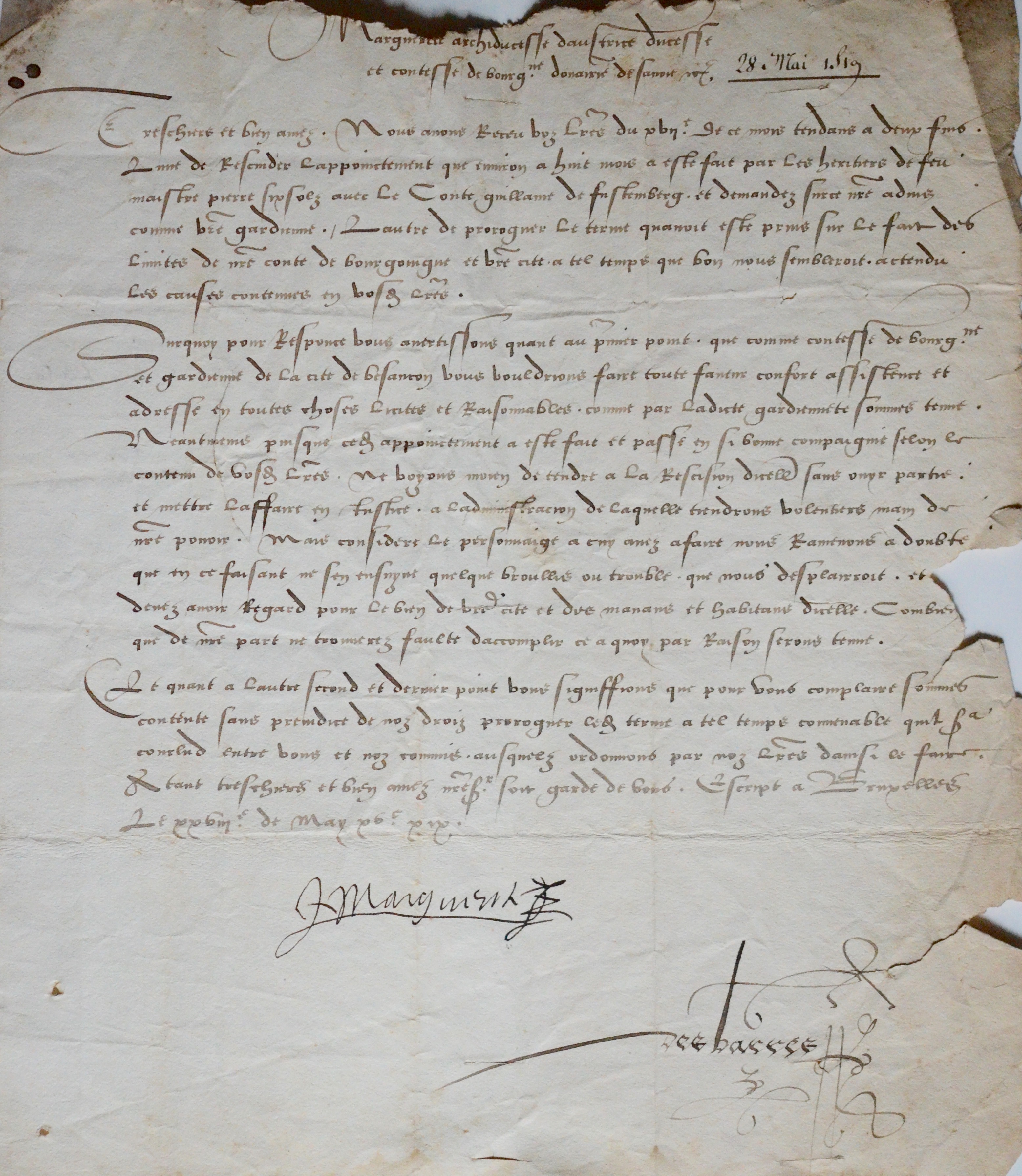 Rare et précieuse lettre signée de l'archiduchesse Marguerite d'Autriche, princesse de Bourgogne et duchesse de Savoie, adressée aux gouverneurs et jurés de la cité de Besançon.