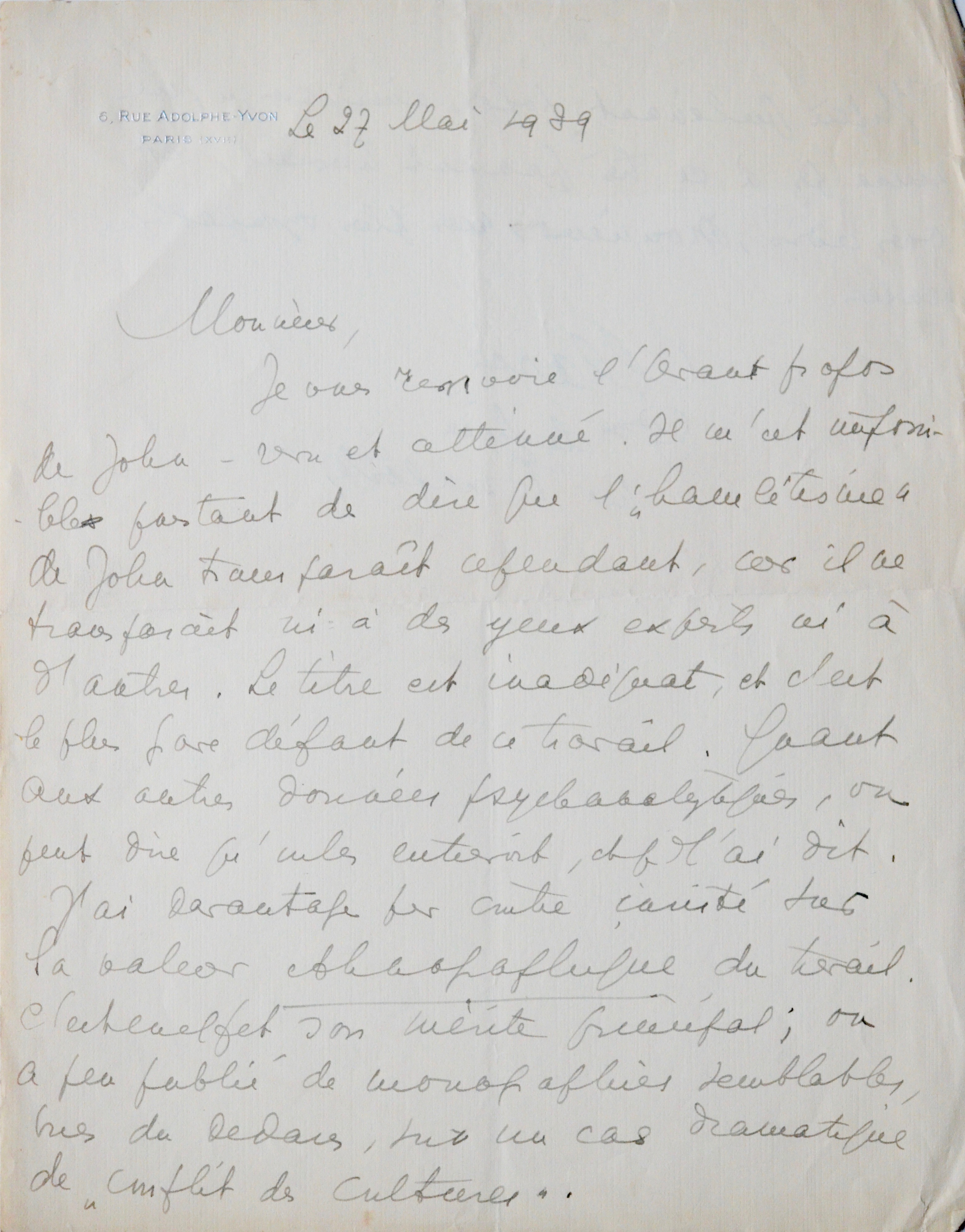 « Je vous renvoie l’avant propos de John – revu et atténué. Il m’est impossible pour tant de dire que l’“hamlétisme” de John transparaît cependant, car il ne transparaît ni à des yeux experts ni à d’autres. Le titre est inadéquat, et c’est le plus grave défaut de ce travail. Quant aux autres données psychanalytiques, on peut dire qu’on les entrevoit, et je l’ai dit. J’ai davantage par contre insisté sur la valeur ethnographique du travail. C’est en effet son mérite principal ; on a peu publié de monographies semblables, vues du dedans, sur un cas dramatique de “conflit des cultures”. J’espère que l’avant propos, ainsi conçu, ne nuira pas à ce très pesant travail [...] ».