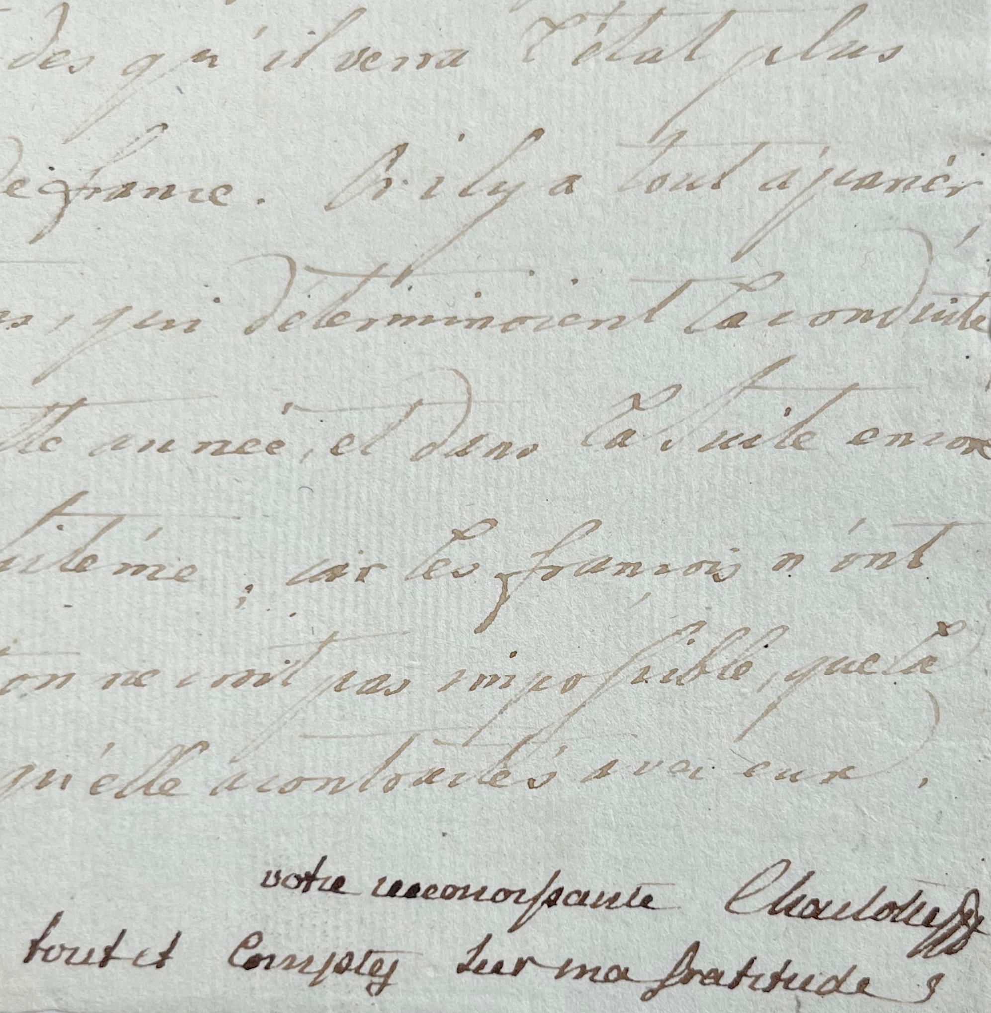 Elle a ajouté, de sa main : "Soyez bien attentif informez de tout veillez à tout et comptez sur ma gratitude. Votre reconnaissante Charlotte".