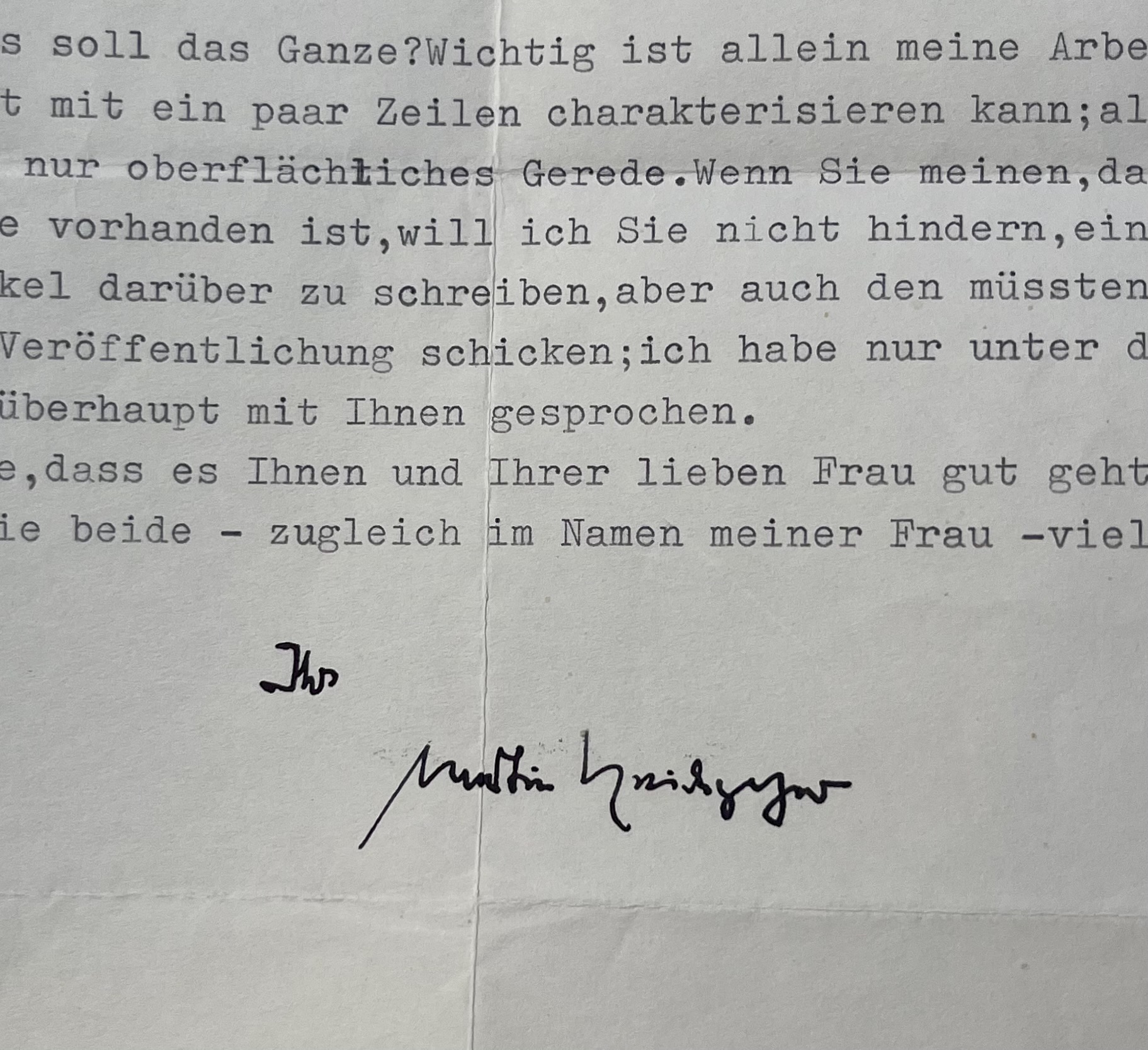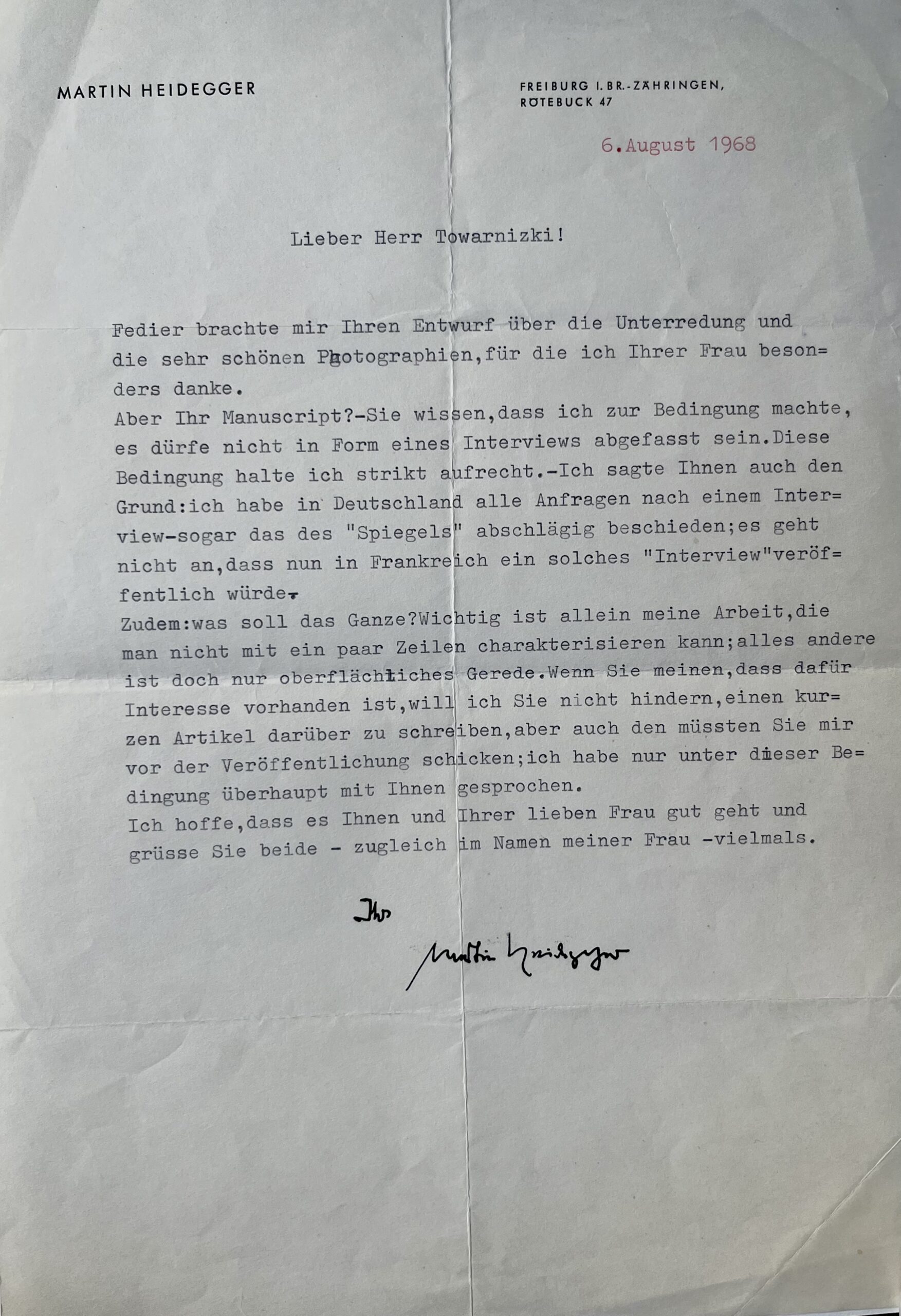 Martin Heidegger (Meßkirch, 1889/1976)Heidegger pose ses conditions strictes pour une interview de Frédéric de Towarnicki : refus catégorique que cela prenne la forme d'un entretien car il a déjà rejeté toute demande d'interview en Allemagne, y compris dans le Spiegel. Il se questionne aussi quant à l'utilité de sa démarche : pour lui, la seule chose importante est son travail qui ne peut pas être décrit en quelques lignes, tout le reste est superficiel ; quoi qu'il en soit il impose de relire son texte avant toute publication.