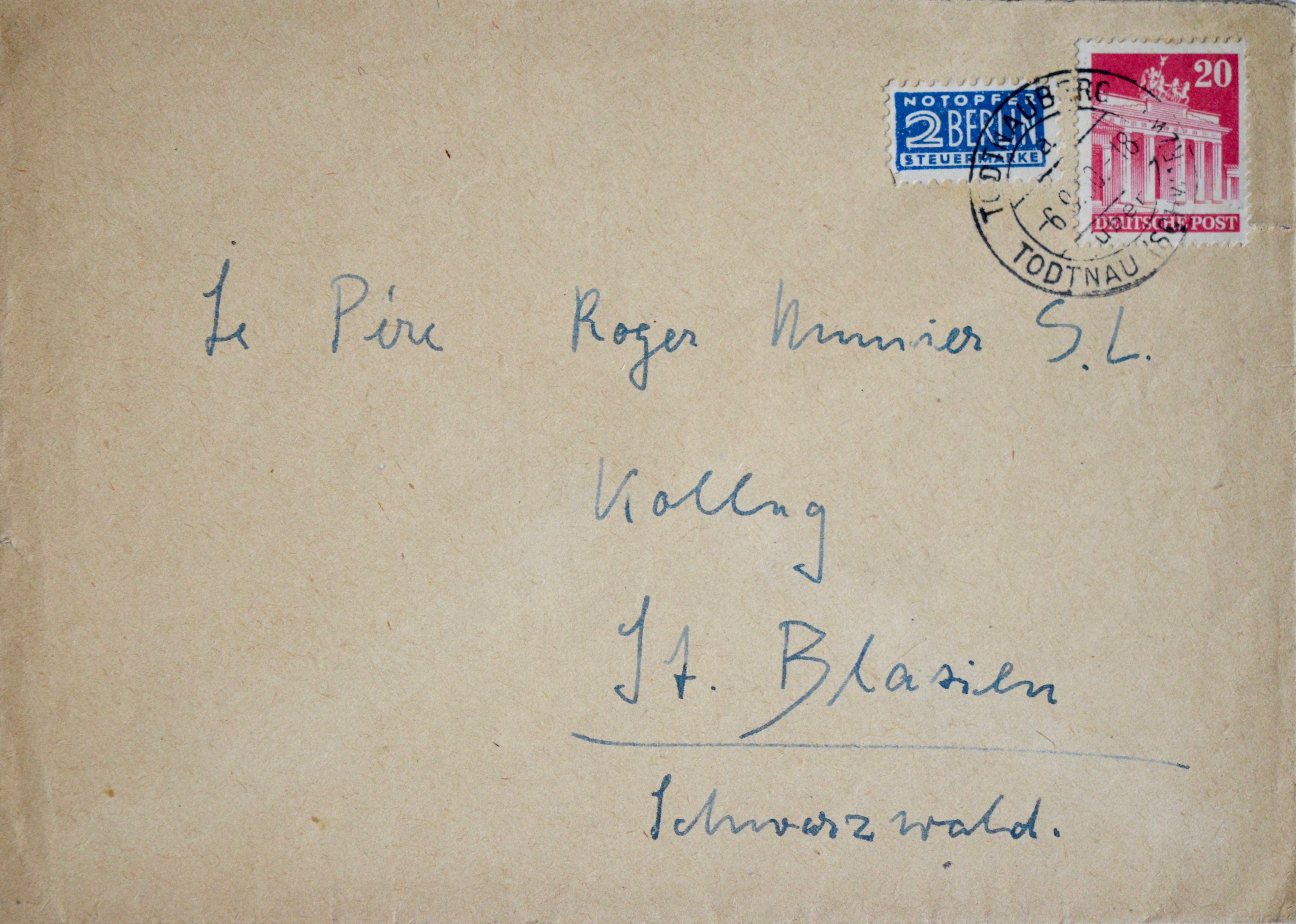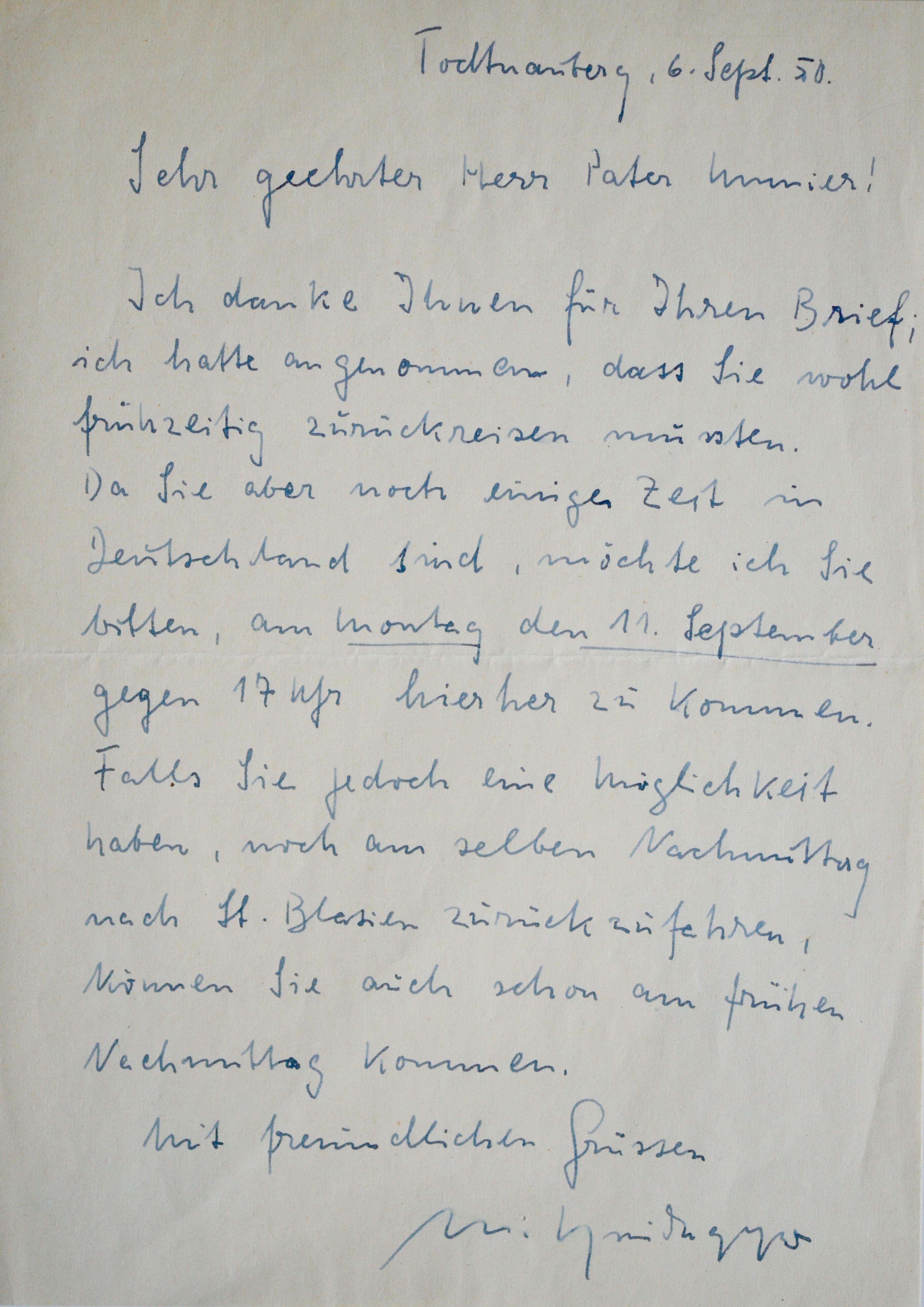 "Sehr geehrter Herr Pater Munier ! Ich danke Ihnen für Ihren Brief ; ich hatte angenommen, dass Sie wohl frühzeitig zurückreisen müssen. Da Sie aber noch einiger Zeit in Deutschland sind, möchte ich Sie bitten, am Montag den 11. September gegen 17 Uhr hierher zü kommen. Falls Sie jedoch eine Möglichkeit haben, noch am selben Nachmittag nach St. Blasien zurück zufahren, können Sie auch schon am frühen Nachmittag Kommen [...]".