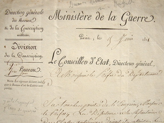 Lettre du général Mathieu Dumas, directeur général de la conscription et des revues [il garde ce poste de 1810 à 1812], donnant des ordres strictes pour poursuivre les réfractaires à la conscription. «Sur tous les points de l'Empire, monsieur, les déserteurs et les réfractaires des classes antérieures doivent être atteints. Les poursuites exécutées contre eux ont déjà produit, pour l'année de 1811, les effets qu'on devait en attendre. Peu de conscrits ont abandonné leur détachement en route [...]. Il importe que leur arrestation prouve à vos administrés la ferme volonté de Sa Majesté de ne point souffrir de réfractaires [...]». Sa circulaire du 30 mai l'invite à faire condamner les conscrits de 1811 «qui se sont mis en état de désobéissance. Vous n'ignorez pas que le délai fatal qui enlève les réfractaires aux contingents, sera promptement écoulé [...]. Toute la sévérité que vous employerez en ce moment contre les insoumis doit aussi tourner à l'avantage de votre département. Vous devez continuer d'employer contre ces individus les moyens de recherche et les voies de rigueur qui sont à votre disposition [...]».