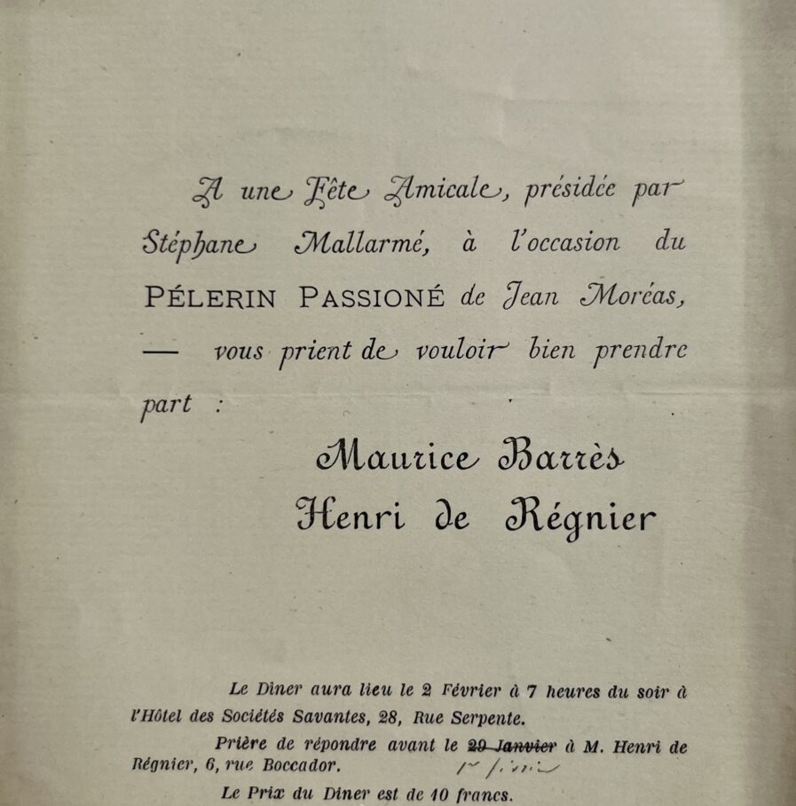 "A une Fête Amicale, présidée par Stéphane Mallarmé, à l'occasion du PÉLERIN PASSIONÉ de Jean Moréas, vous prient de vouloir bien prendre part : Maurice Barrès - Henri de Régnier. Le Diner aura lieu le 2 février à 7 heures du soir à l'Hôtel des Sociétés Savantes, 28, Rue Serpente. Prière de répondre avant le ["29 Janvier" biffé] 1er février à M. Henri de Régnier, 6, rue Boccador. Le Prix du Diner est de 10 francs".