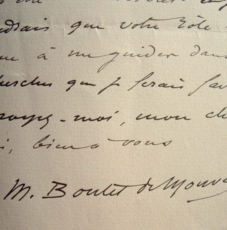 Boutet de Monvel demande l'aide de son ami pour une étude sur le roman contemporain, de 1880 à 1882. «Mon américaine me connaît assez pour savoir que je serais incapable de répondre à pareille question. Elle ne pouvait me demander que les titres des quelques romans les plus en vue qui ont paru à cette époque. S'il y a des recherches à faire, indiquez-moi simplement où elles doivent être faites et je m'arrangerai en conséquence [...]. Je suis heureux de vous savoir au travail pour les Gobelins. Il y a là des choses bien intéressantes à faire et qui vous reposeront d'autres besognes moins attachantes [...]».