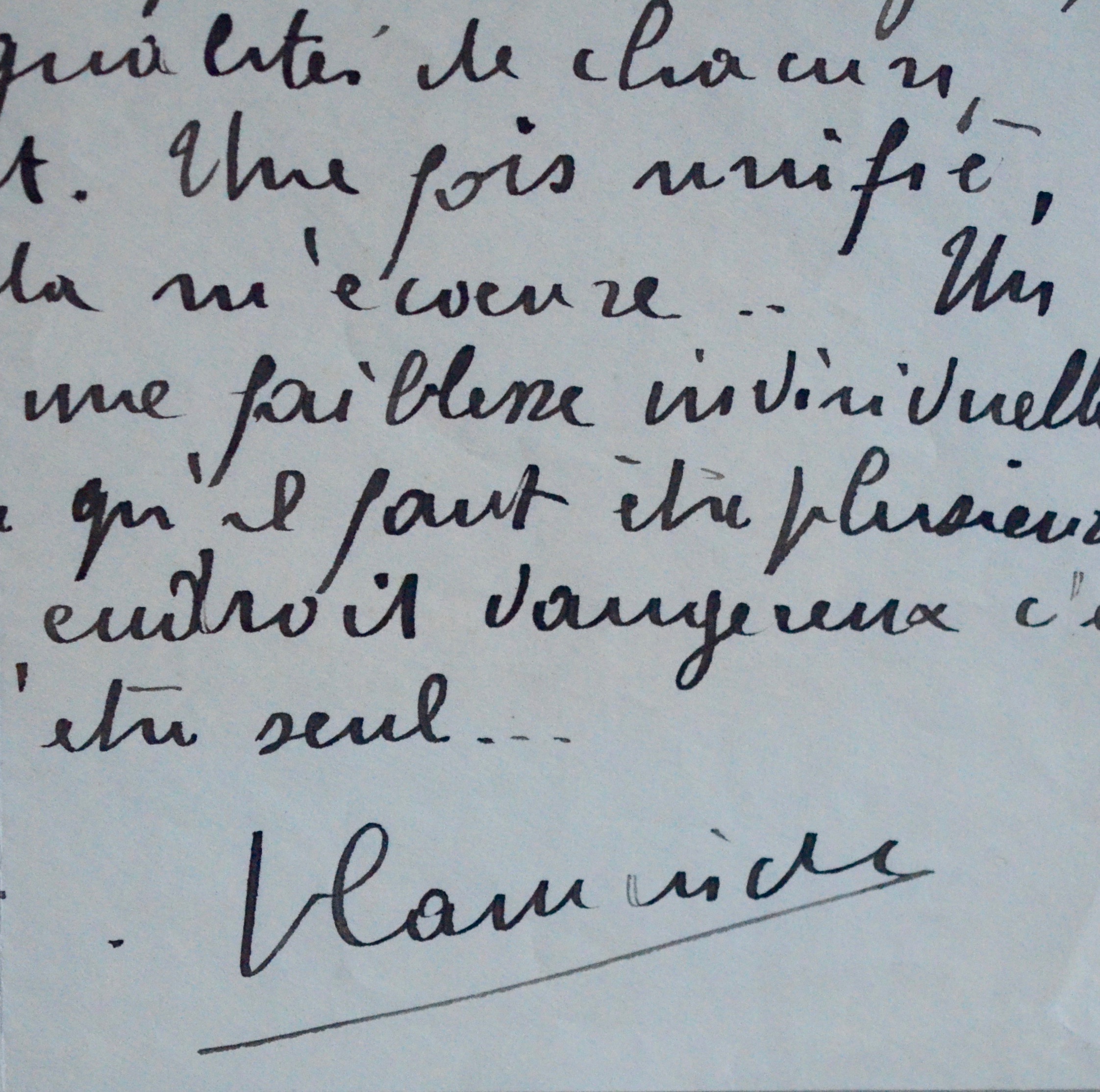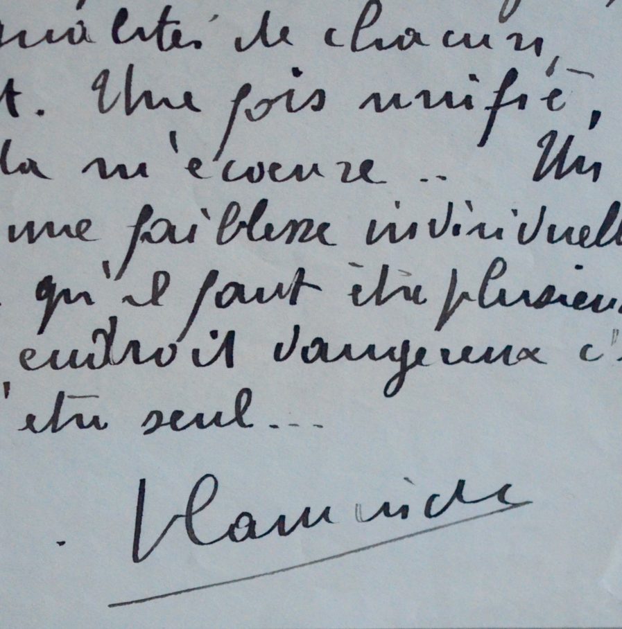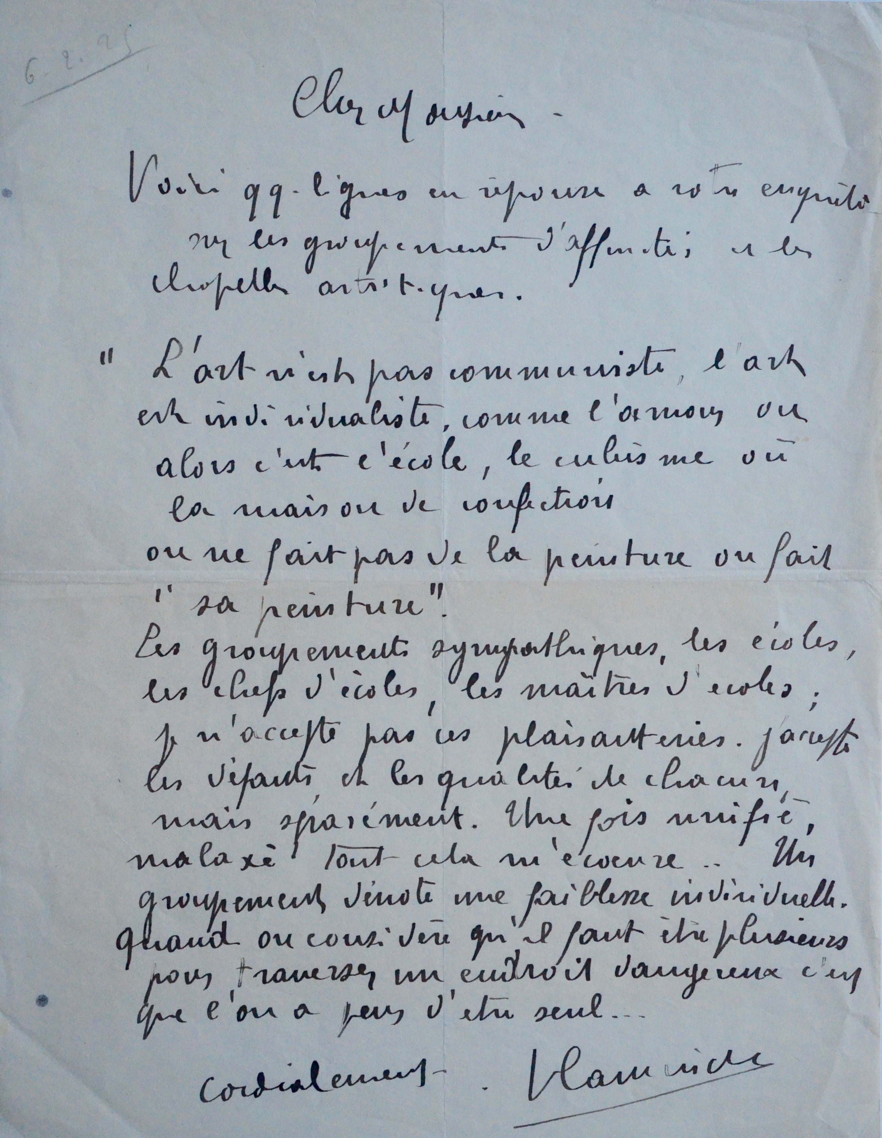 Maurice Vlaminck (de) (Rueil-la-Gadelière, 1876/1956)Belle lettre de Maurice de Vlaminck en réponse à une enquête sur les groupements d'affinités et les chapelles artistiques.