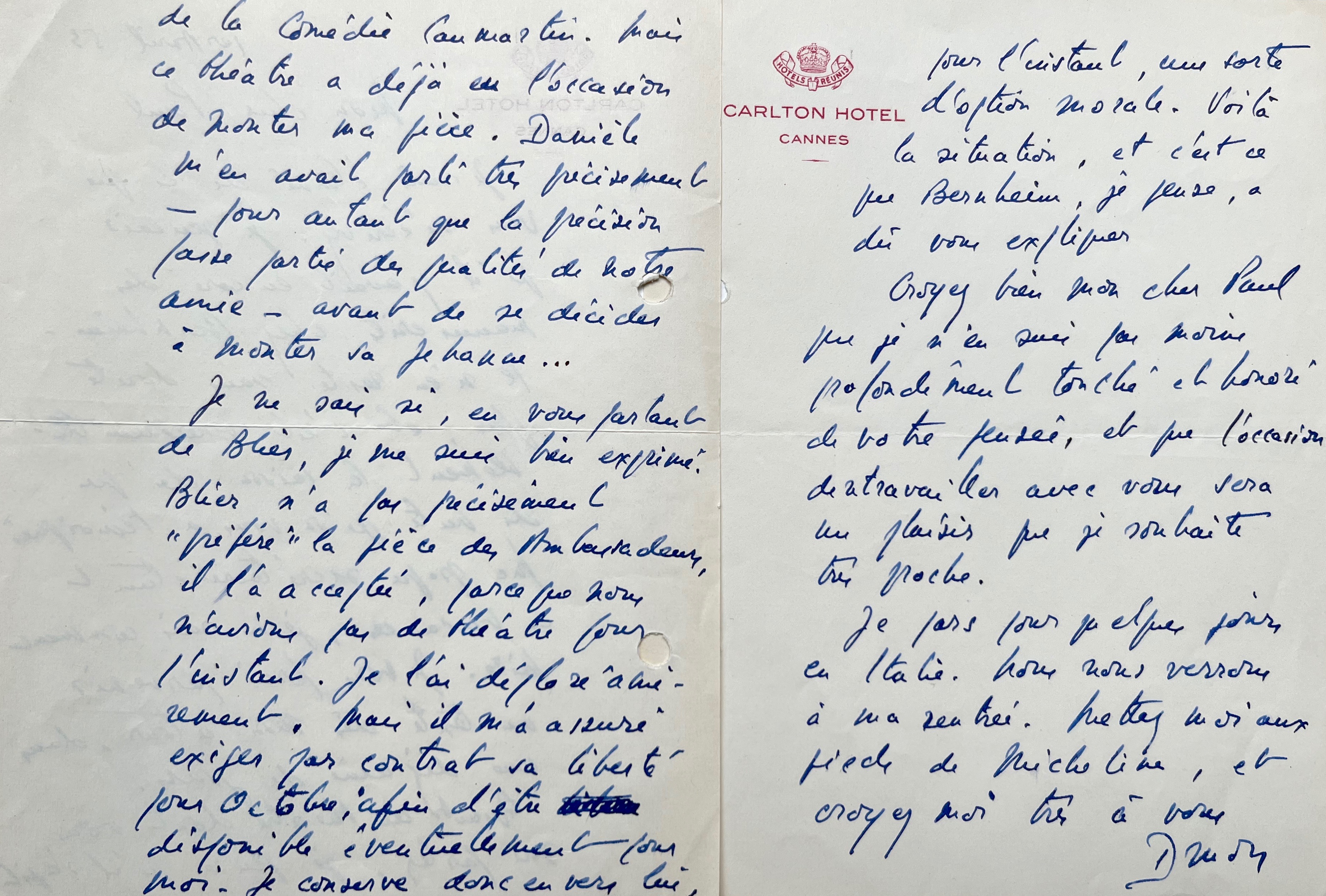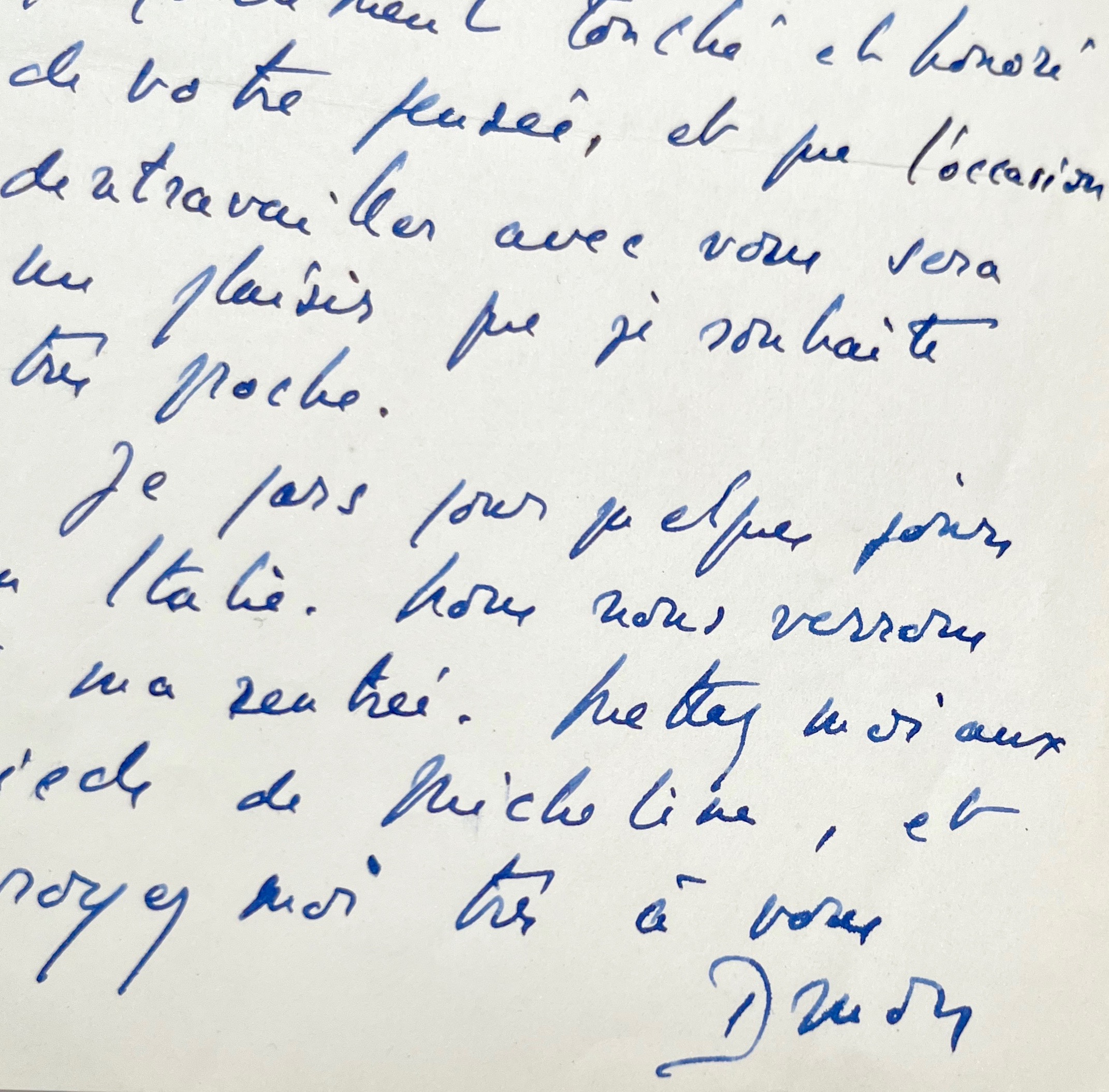 Croyez bien, mon cher Paul, que je n'en suis pas moins profondément touché et honoré de votre pensée, et que l'occasion de retravailler avec vous sera un plaisir que je souhaite très proche [...]".