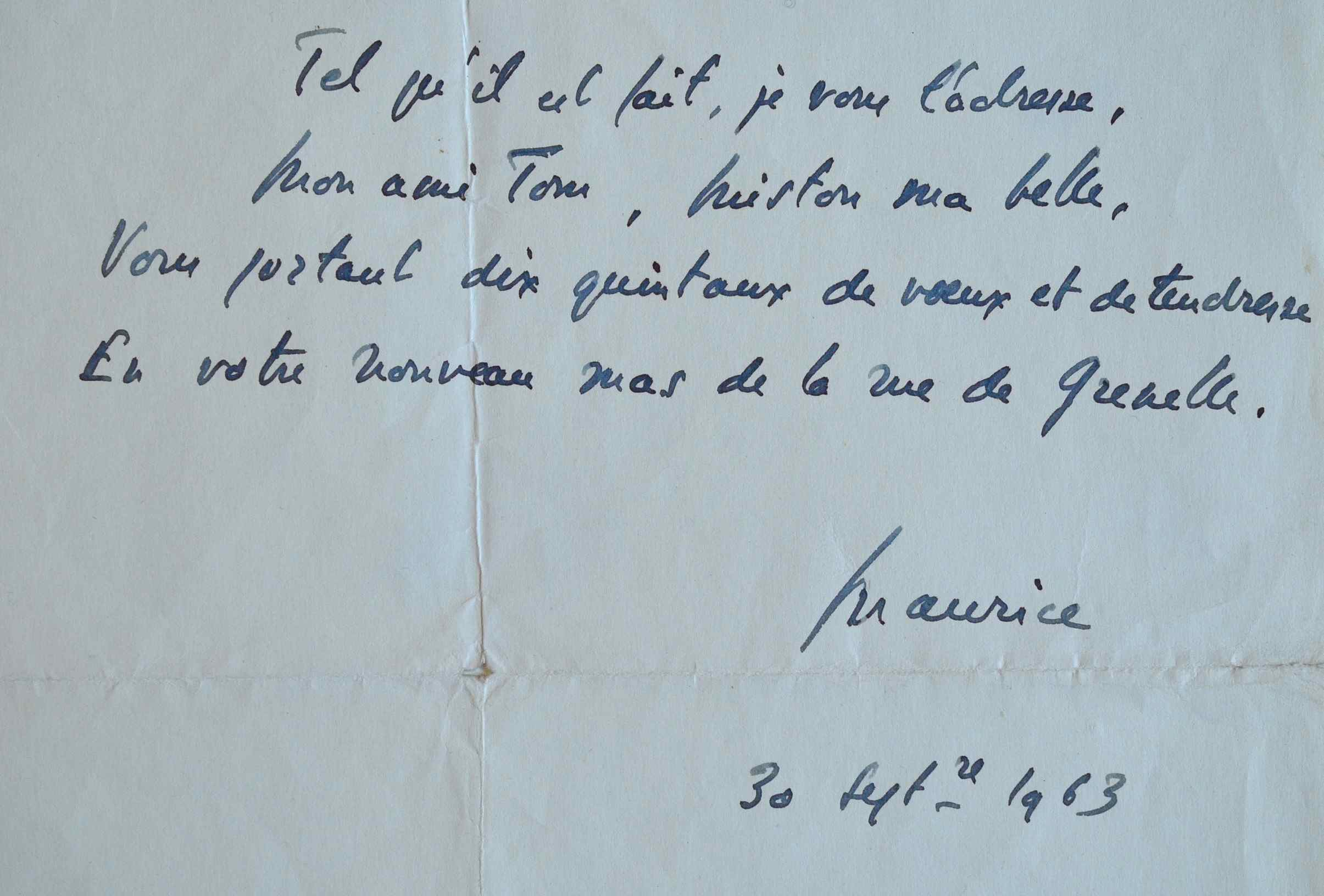 «Ce taureau n'est pas né au bord du Vaccarès, Hélas [...]. Tel qu'il est fait je vous l'adresse, mon ami Tom, histoire ma belle, vous portant dix quintaux de voeux et de tendresse en votre nouveau mas de la rue de Grenelle. Maurice». A son en-tête.