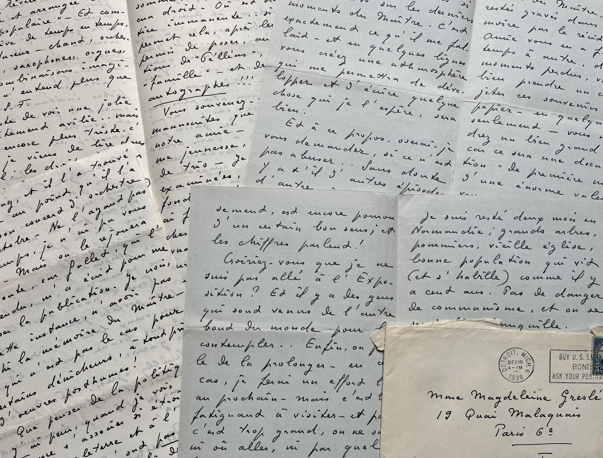 Maurice Dumesnil (Angoulême, 1884/1974)Deux longues lettres (14 pages) du pianiste Maurice Dumesnil, qui rassemble, pour son nouvel ouvrage, les souvenirs de Magdeleine Greslé sur Debussy.